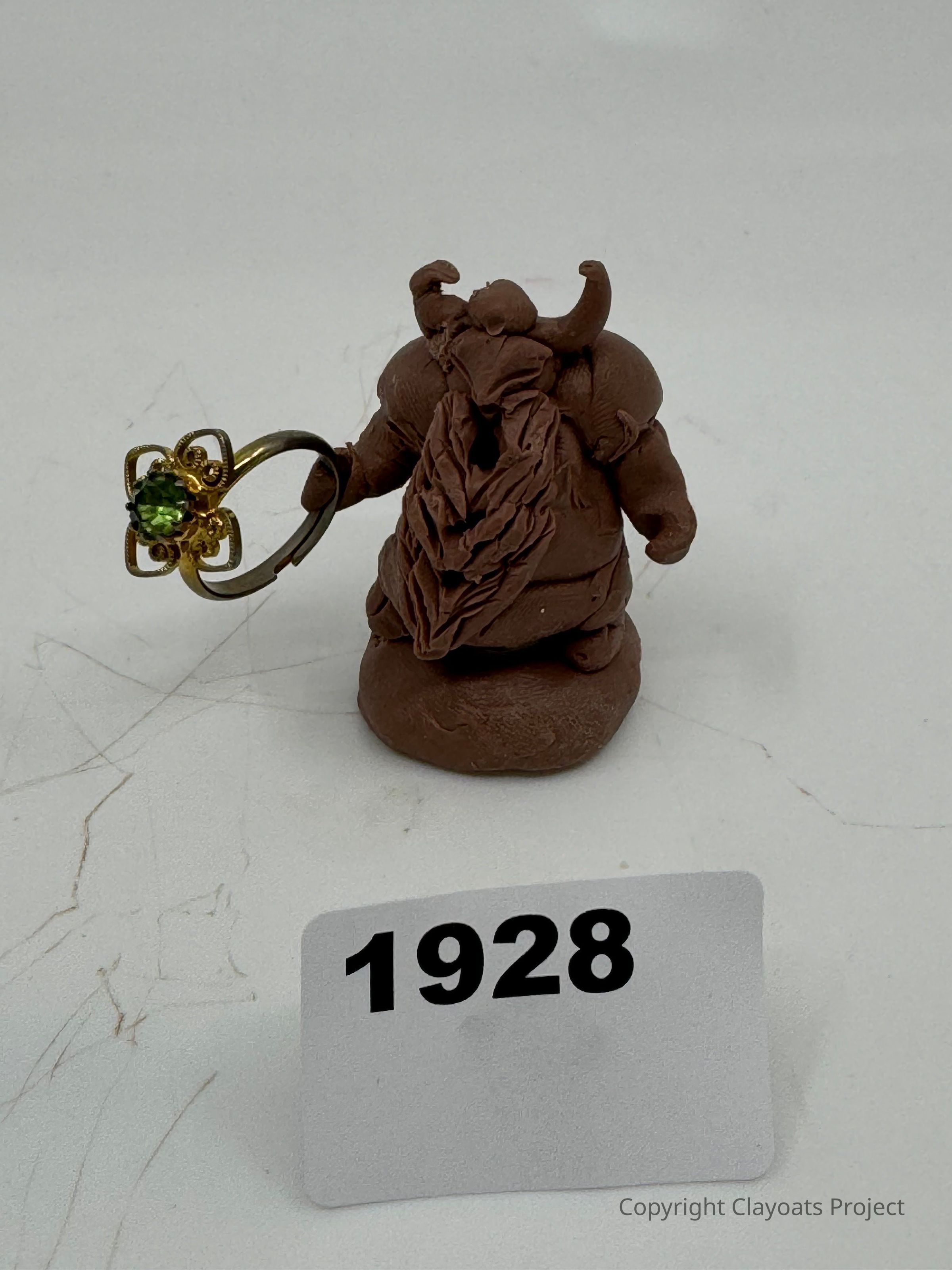 The image displays a small, clay sculpture resembling a figure with horns and intricate details on its back, holding a ring adorned with a green gem set in a decorative, golden band. The sculpture stands on a light surface. The overall scene suggests a mix of artistic creativity and possibly an exhibition or identification context.