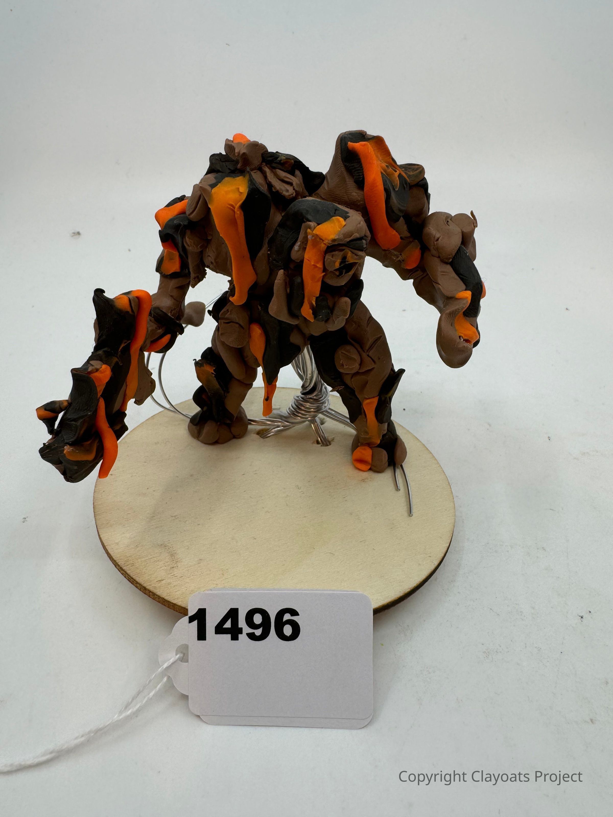 The image depicts a handcrafted sculpture of a humanoid figure made from clay, featuring a rugged design with earthy colors like brown, black, and vivid orange accents. It is positioned on a circular wooden base, with metal wires protruding from its feet, possibly for support or added detail. The sculpture's unique design resembles a creature, with limbs that appear muscular.