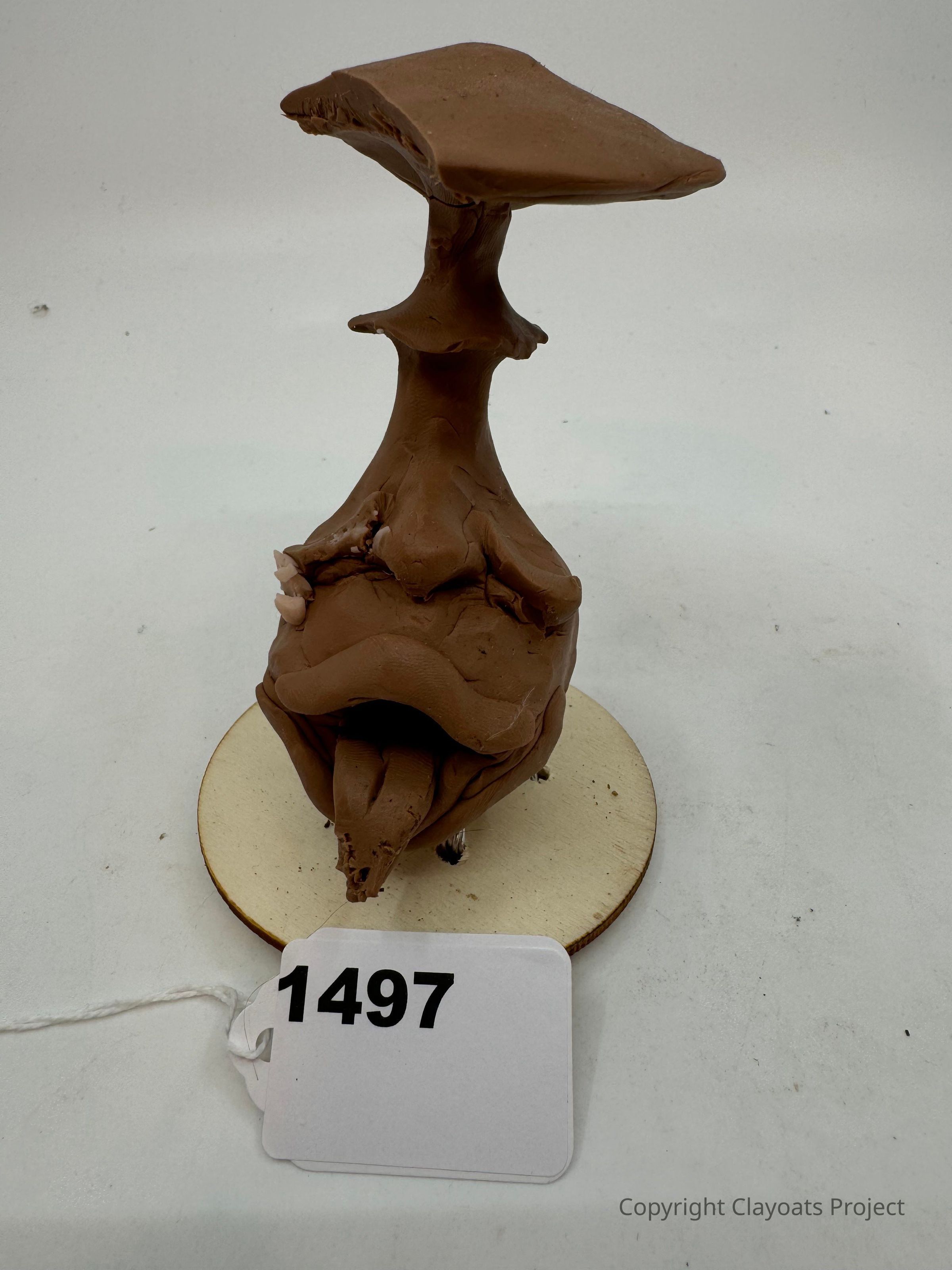 The image shows a unique clay sculpture in a brown shade, crafted to resemble a stylized mushroom or abstract tree structure with a wide, flat top, situated on a thin circular base, appearing slightly asymmetrical with folds and textures throughout its form, all set against a plain, light-colored background.