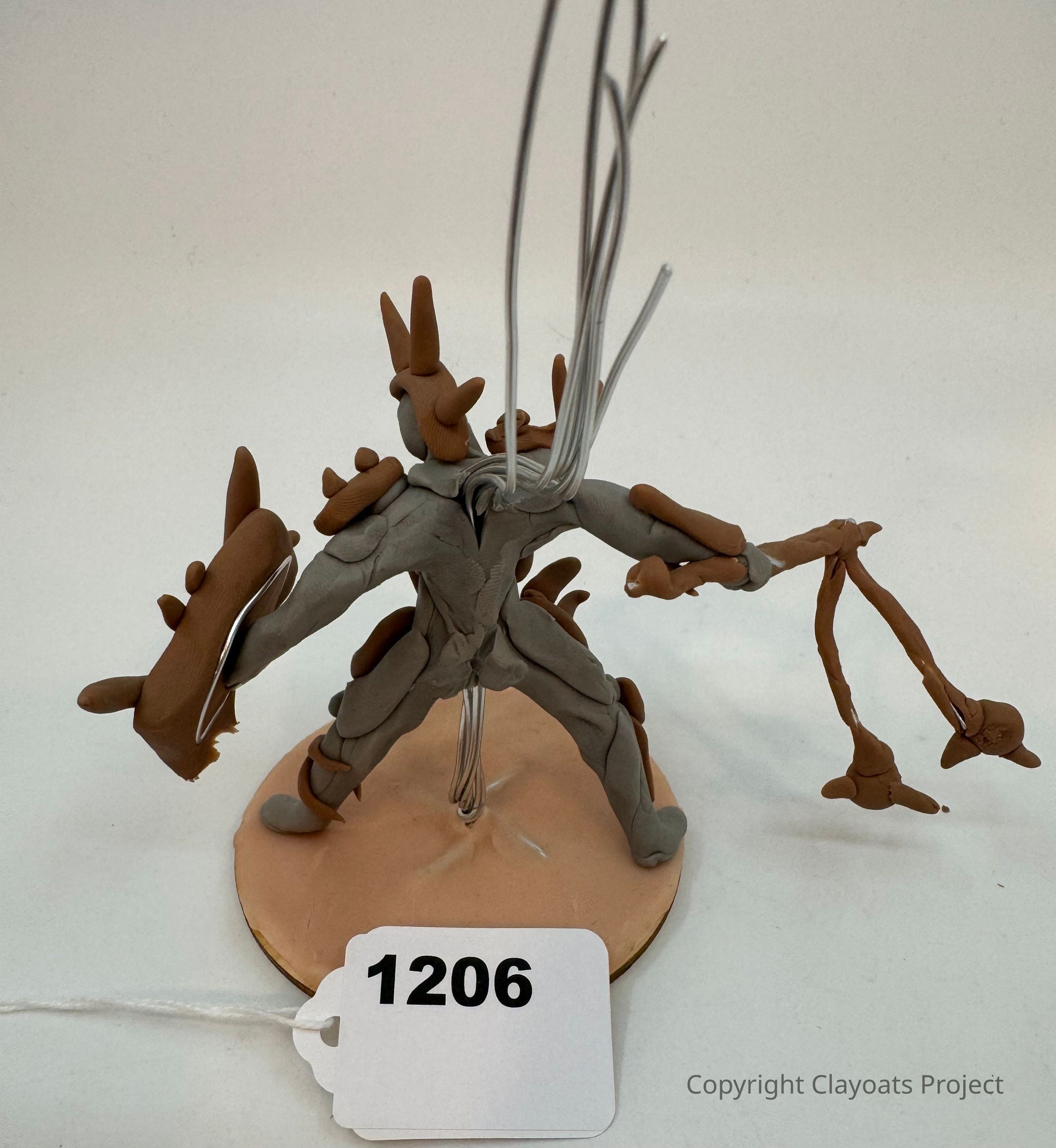 The image features a uniquely crafted clay sculpture depicting a multi-limbed, abstract humanoid figure with brown and gray elements, standing on a round base with wires extending from its upper section. The figure appears to be in motion, with branches or appendages extending outward, reflecting a dynamic pose. . The overall appearance suggests an artistic exploration of form and movement.