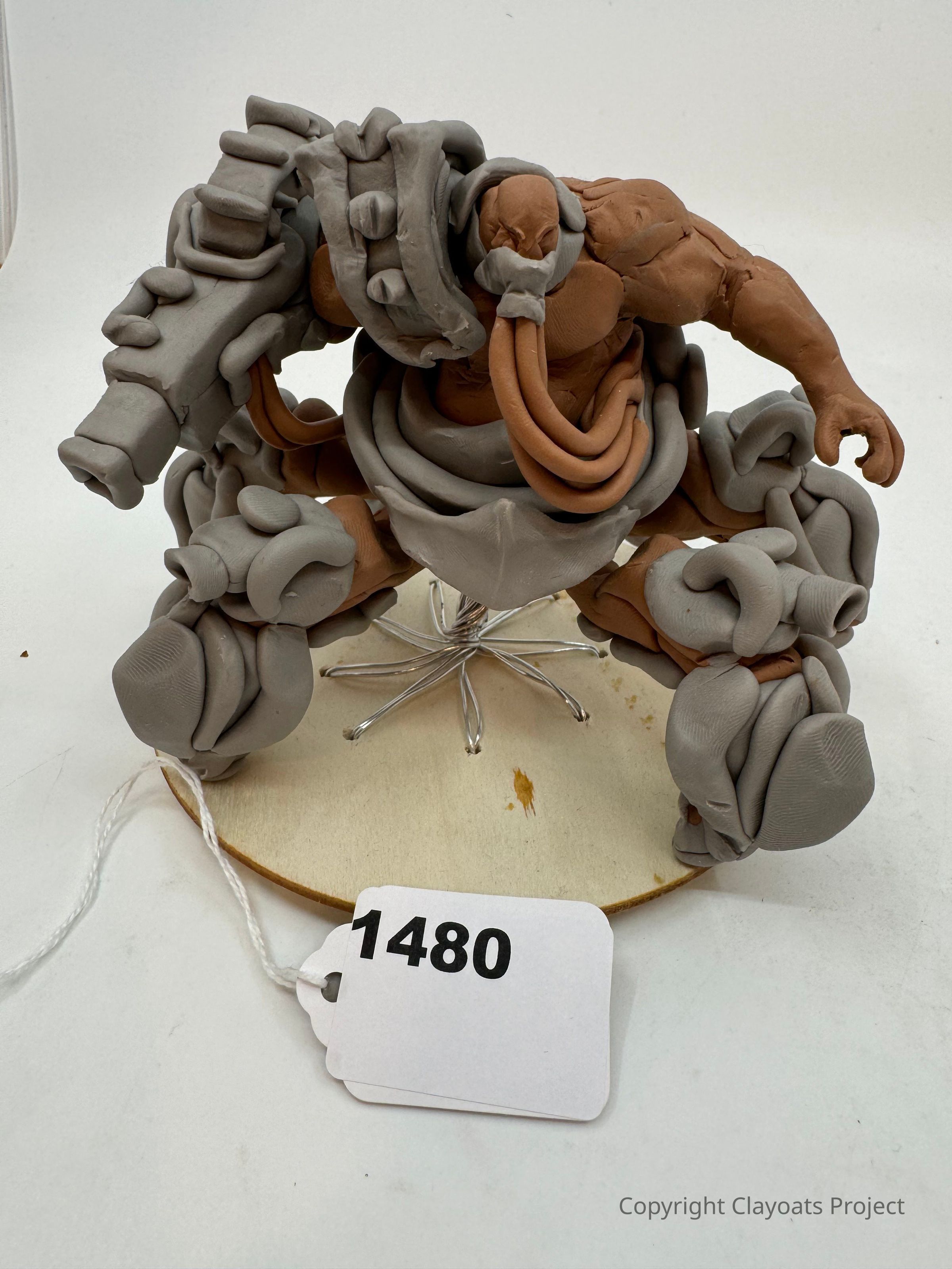 The image shows a detailed clay sculpture of a muscular, humanoid figure with exaggerated anatomy and mechanical elements, such as pipes and armor-like details, in shades of brown and gray. It stands on a round base with a wire structure. The craftsmanship highlights intricate folds and textures, suggesting a character imbued with strength and possibly inspired by fantasy or science fiction themes.