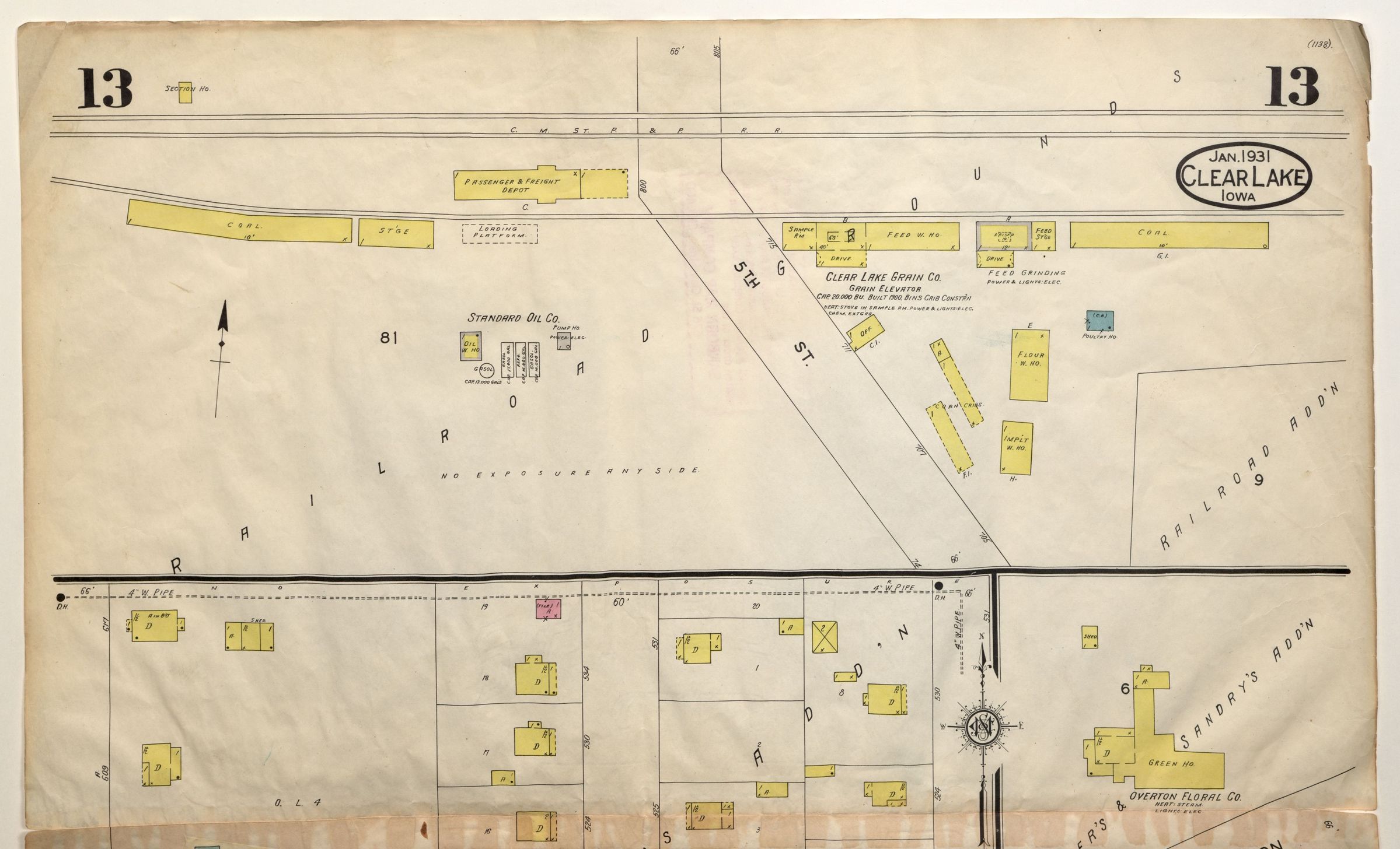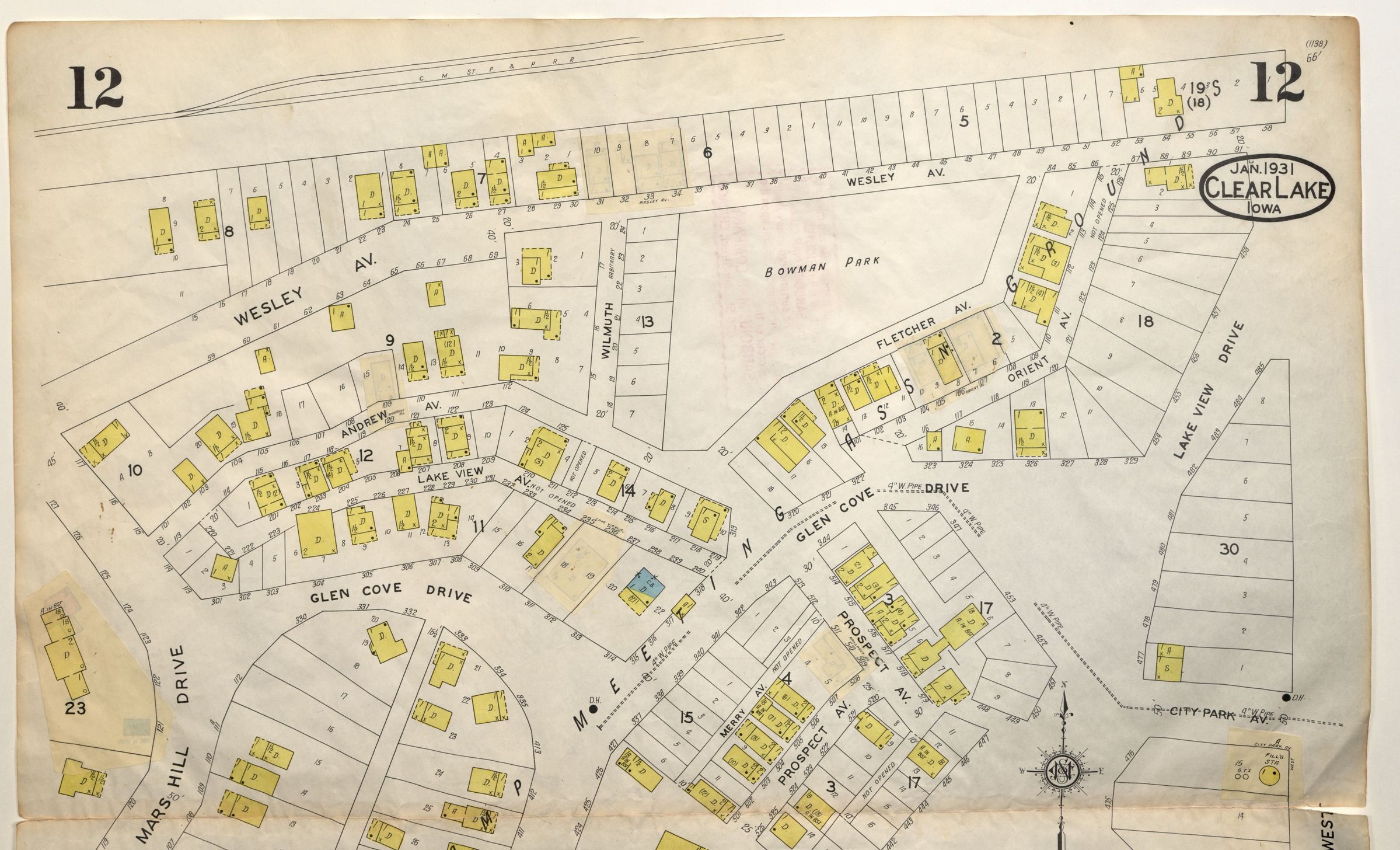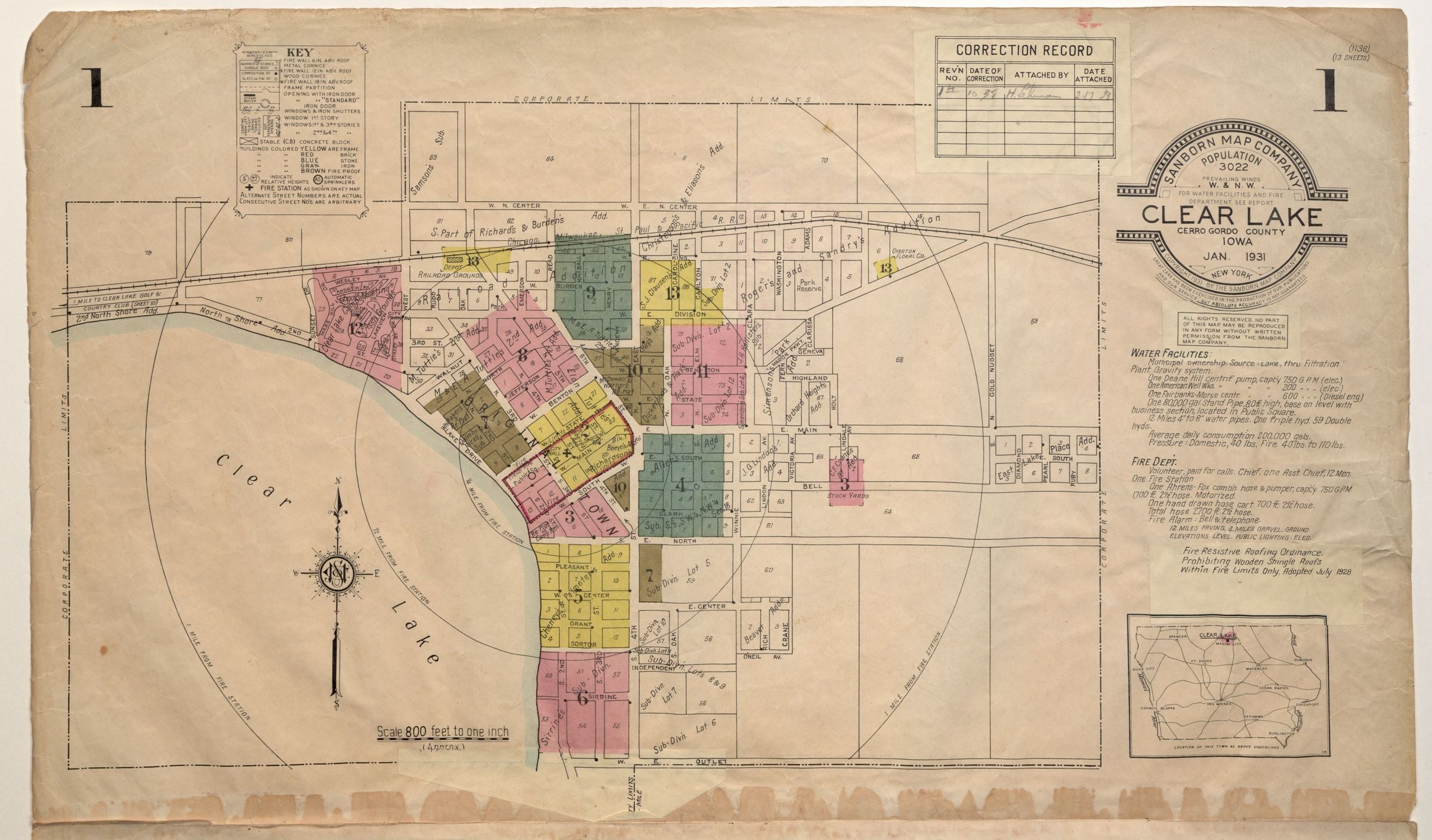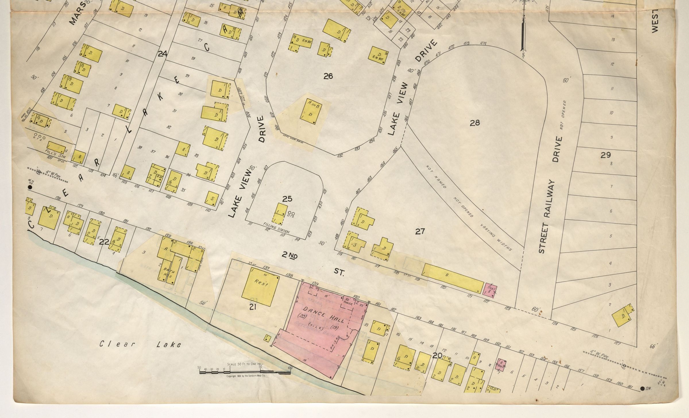 1931 Sanborn Map Clear Lake showing majority of the city. Map is printed on 21" x 25" sheets at a scale of 1"=50'( 1-600) Thirteen sheets noted as Upper and Lower page.