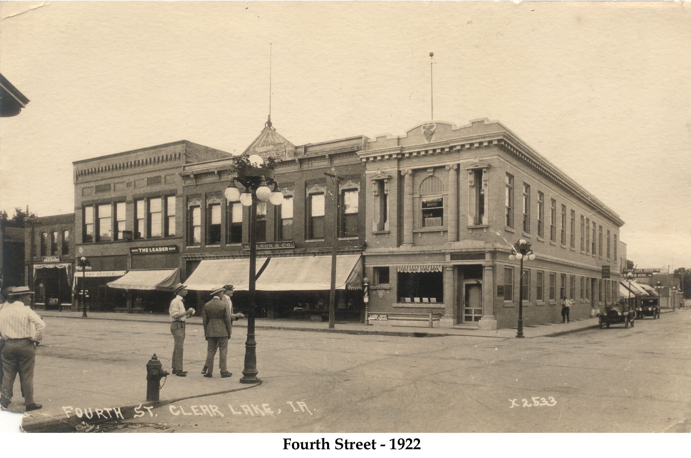 North Fourth Street looking north, new (1915) Cerro Gordo State Bank Building, Opera House with M Olson Store, The Leader, Stenby Co Grocery. Autos on paved streets. Electric poles and overhead wiring removed.