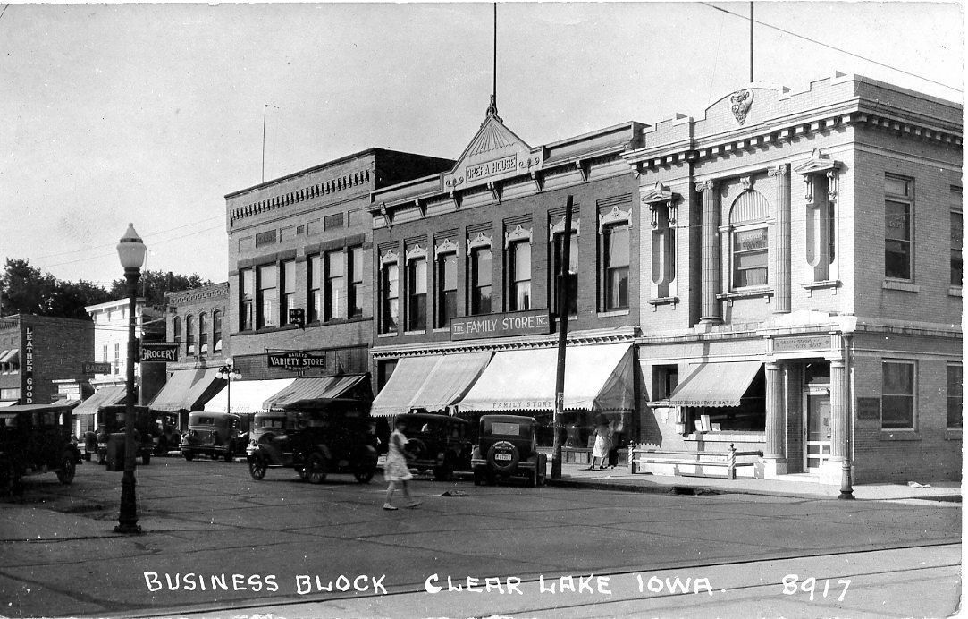 North Fouth Street and Main 1930, businesses Cerro Gordo State Bank, Family Store Dry Goods and Grocery, Bailey's Variety Store, K of P (Knights of Pythias) above, Post Office, Butz Grocery, CL Bakery, Leather Goods