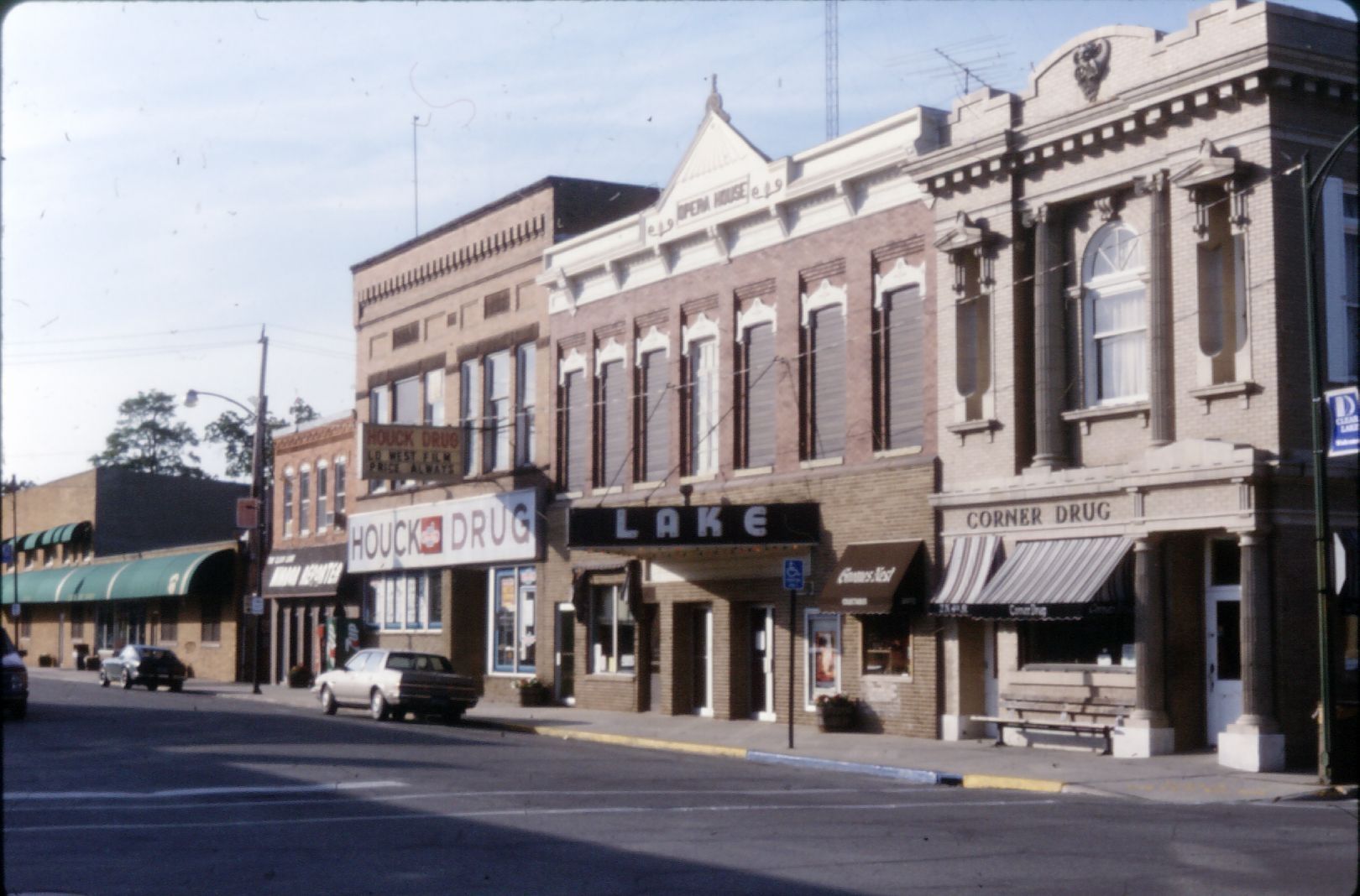 North Fourth Street 1993 businesses Corner Drug, Lake Theater, Gnome Rest, Barber shop, Houck Drug, CL Mirror Reporter, CL Bakery.