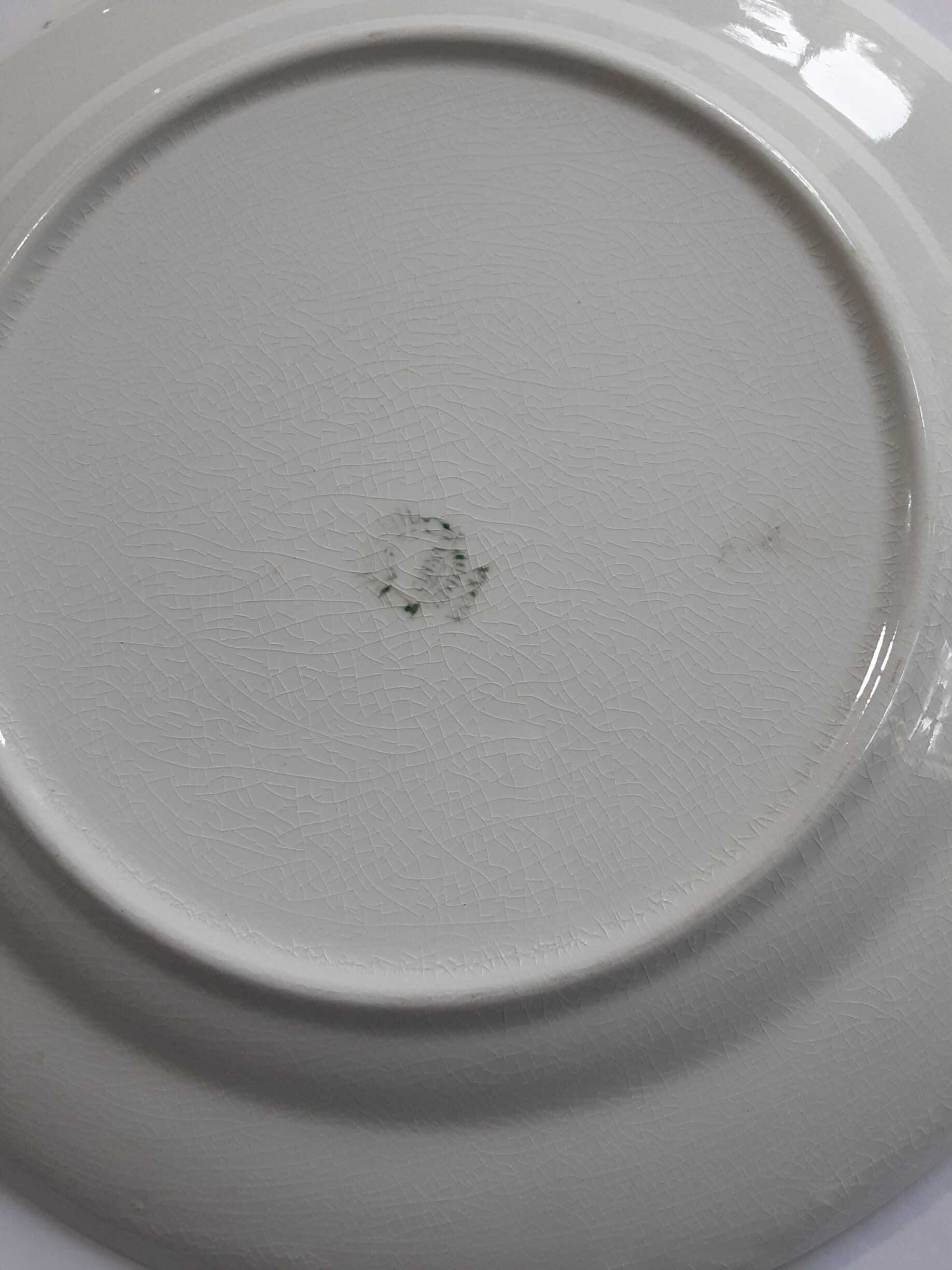 China plate in white done with an intricate border, the concentric circles have alternating sections of emerald green with white flowers, and larger light blue sections with a fish scale pattern painted within. There are then roses and golden and red flowers painted as "bunting."Create Date