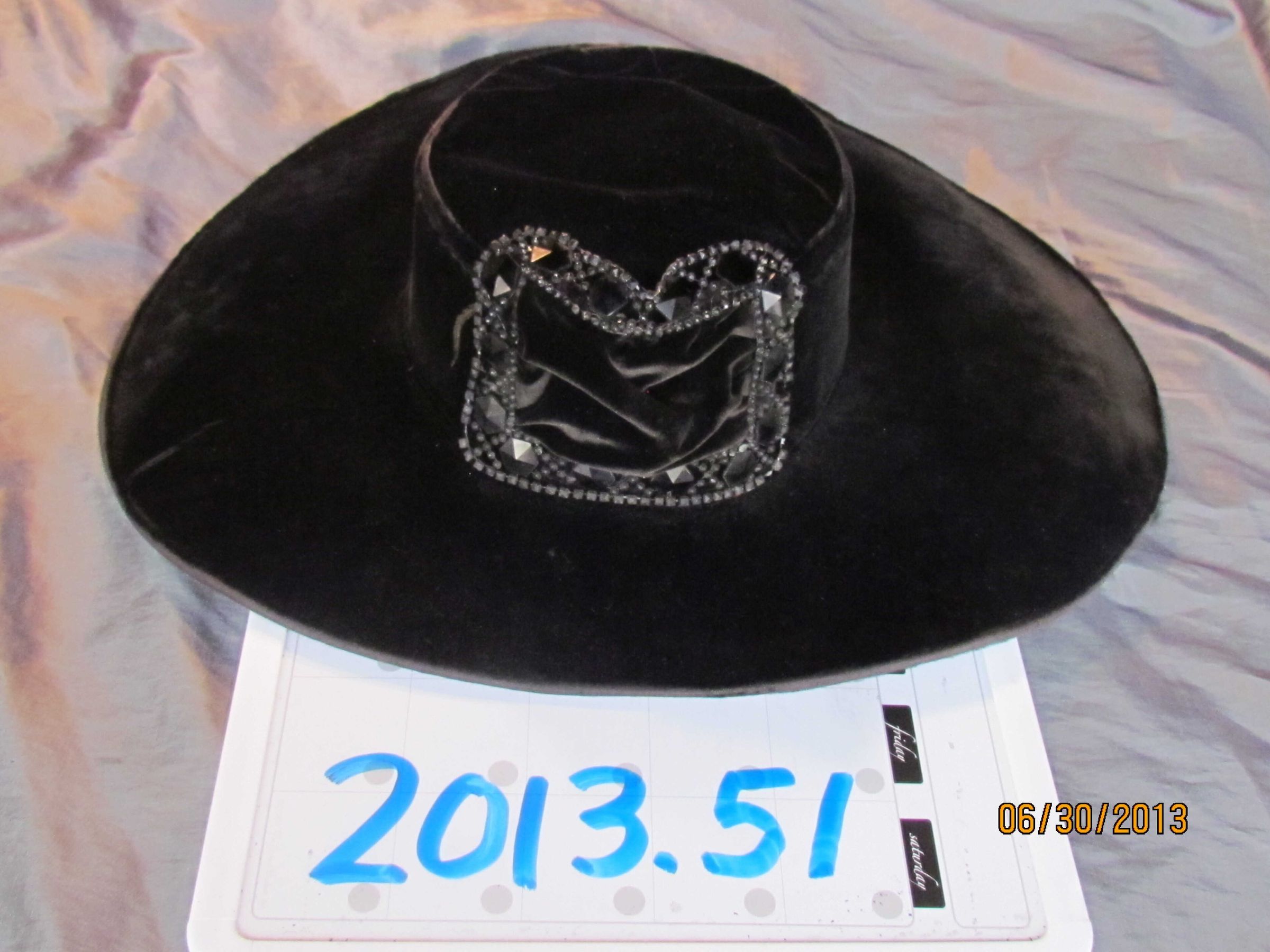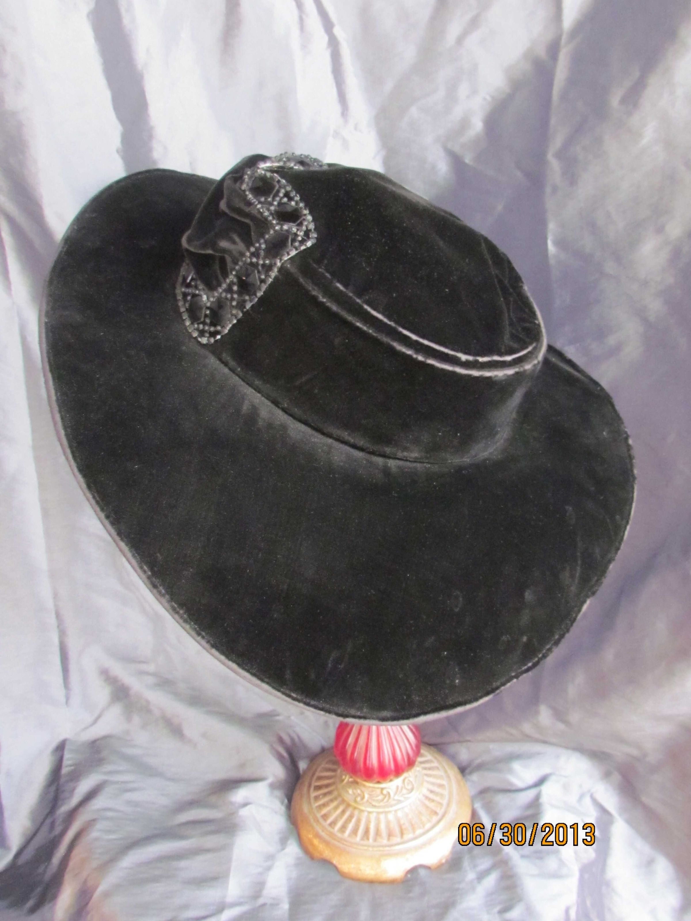 Hat, picture hat, black with black faceted jet bead embellishment, black silk lining, no label,