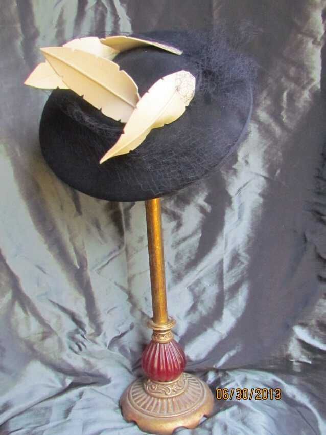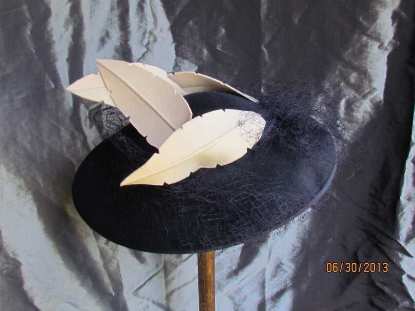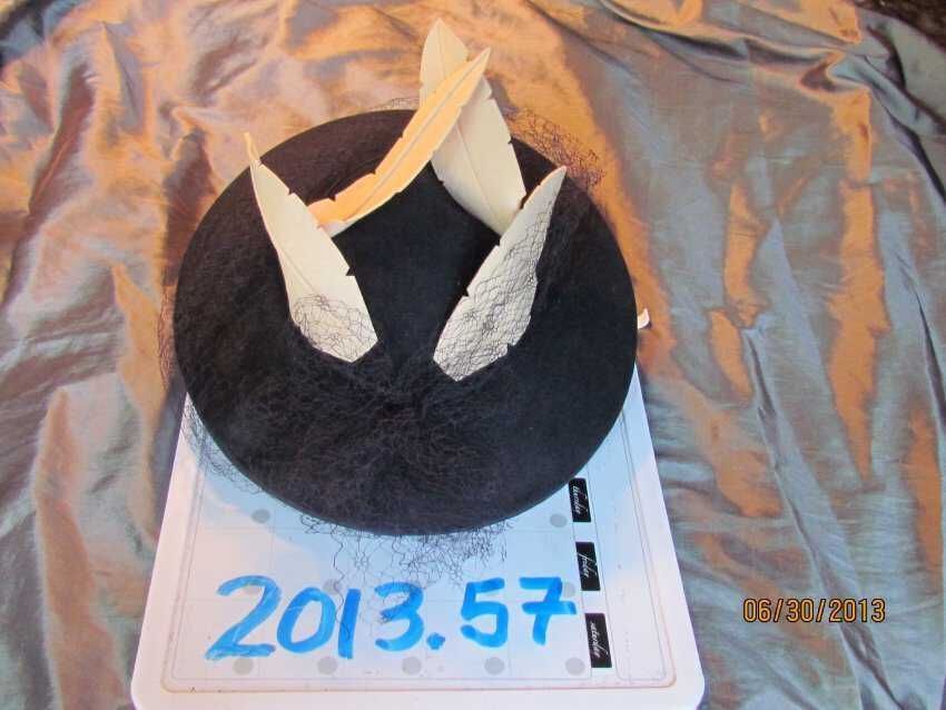 Hat, platter hat with skull cap, blue wool felt with a petersham trim on the brim and on the skullcap, blue veiling, 4 decorative cream wool feathers, elastic; labels reads "American Modes, 22 ½ inch, created in California"; Date: 1940s eraCollection