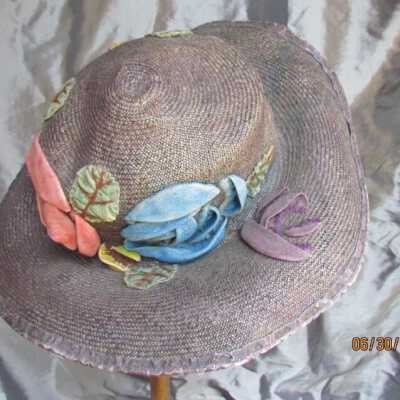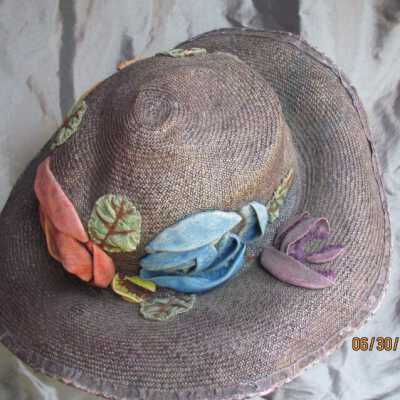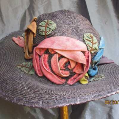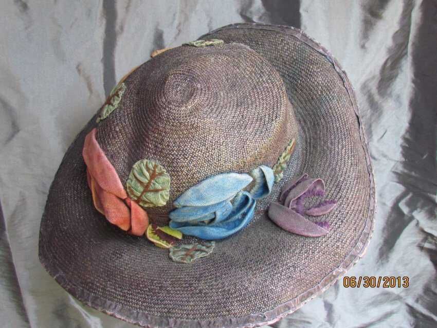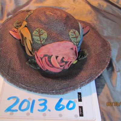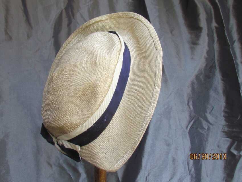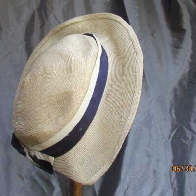 Hat, straw weave (possibly) with blue and cream taffeta ribbon trim with bow in back. Inside: petersham ribbon with maker's label "I. Magnin & Co. Ranleigh" and size label "22 ½". Crown:Collection