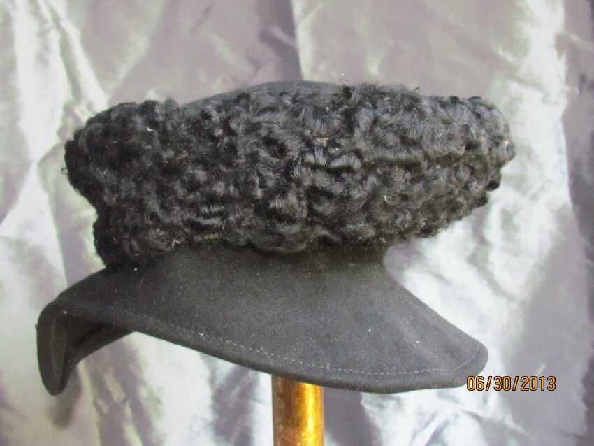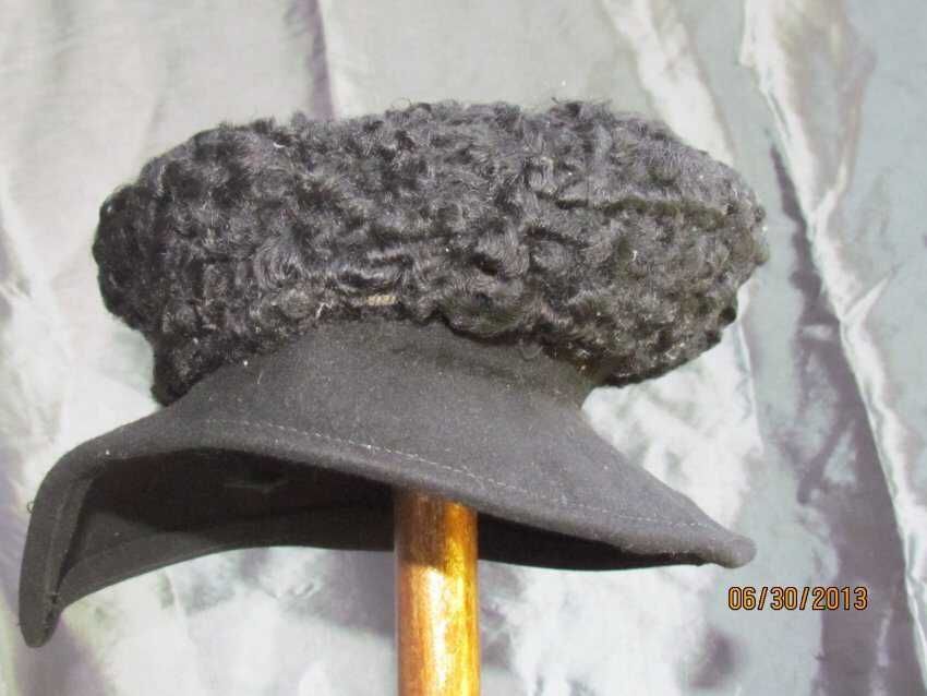 Hat, Moorish style, black wool felt with wire brim and Persian lamb wool trim. No label inside. Probably not manufactured.