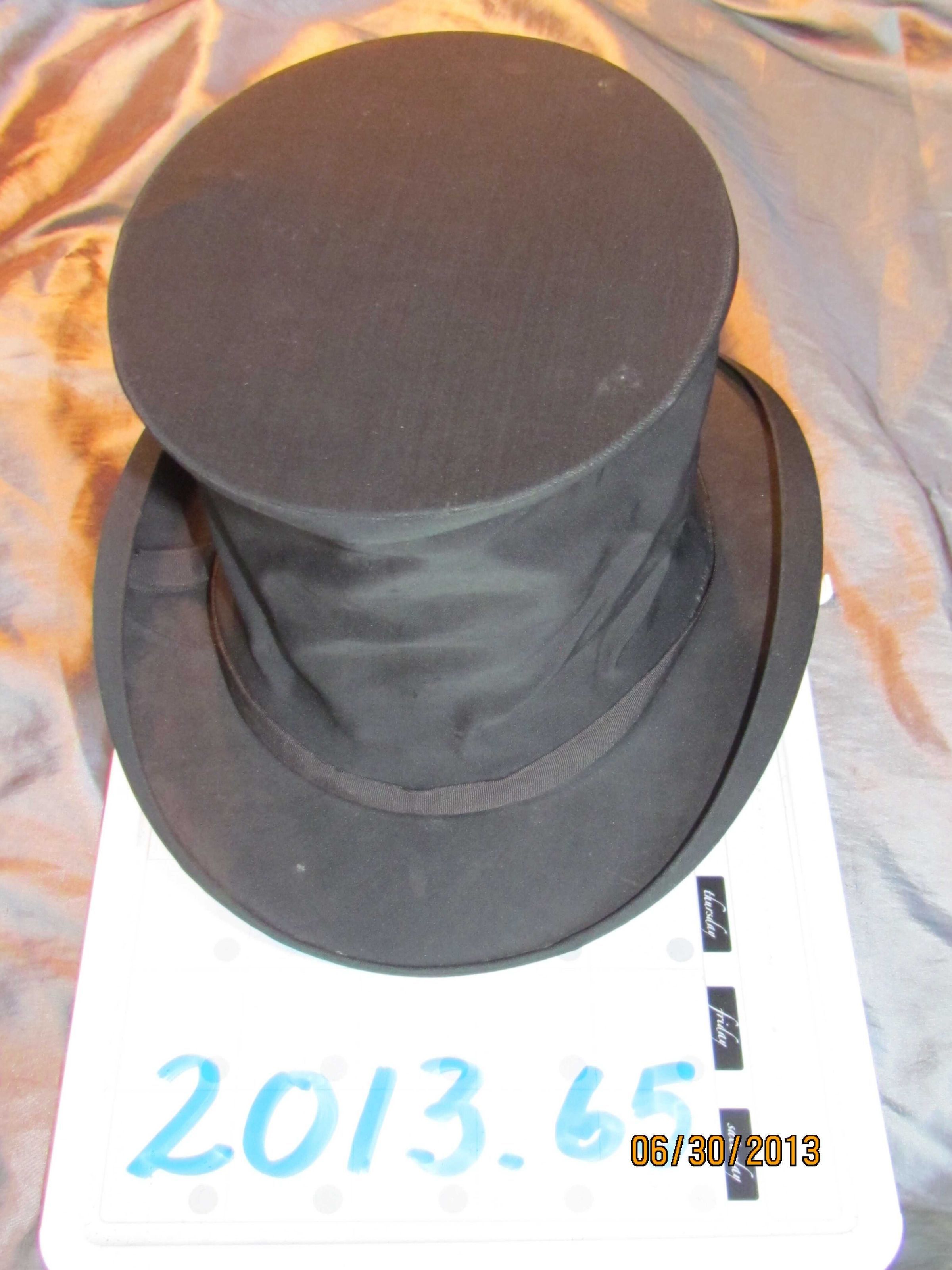 Hat, wool and silk gabardine collapsible top hat with satin lining and brim rolled on sides. Inside label reads, "Fisher and Co. San Francisco".Collection