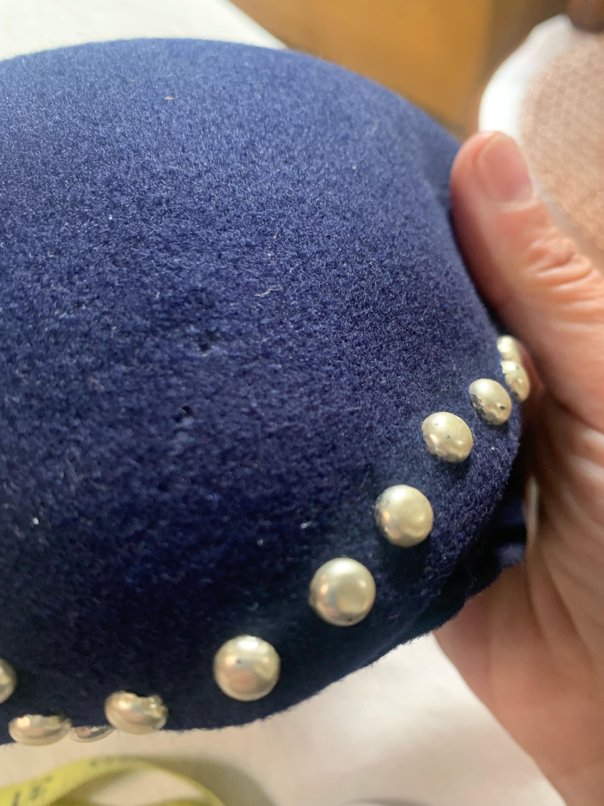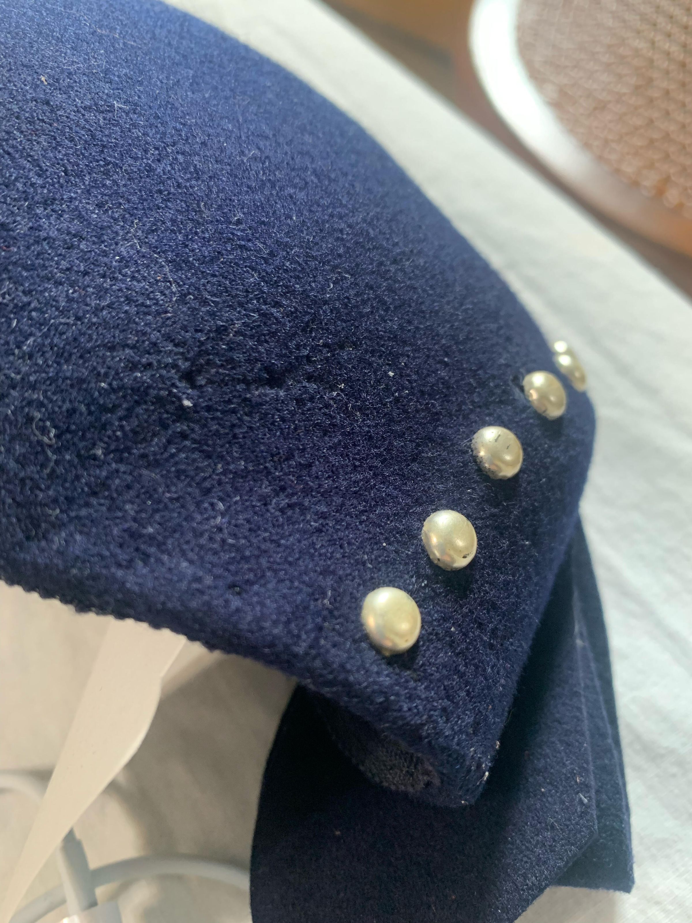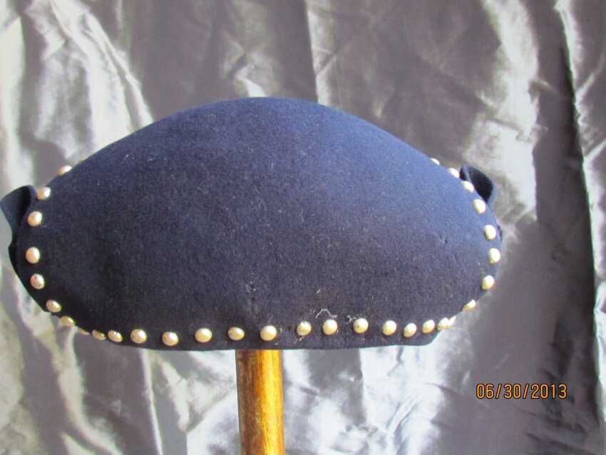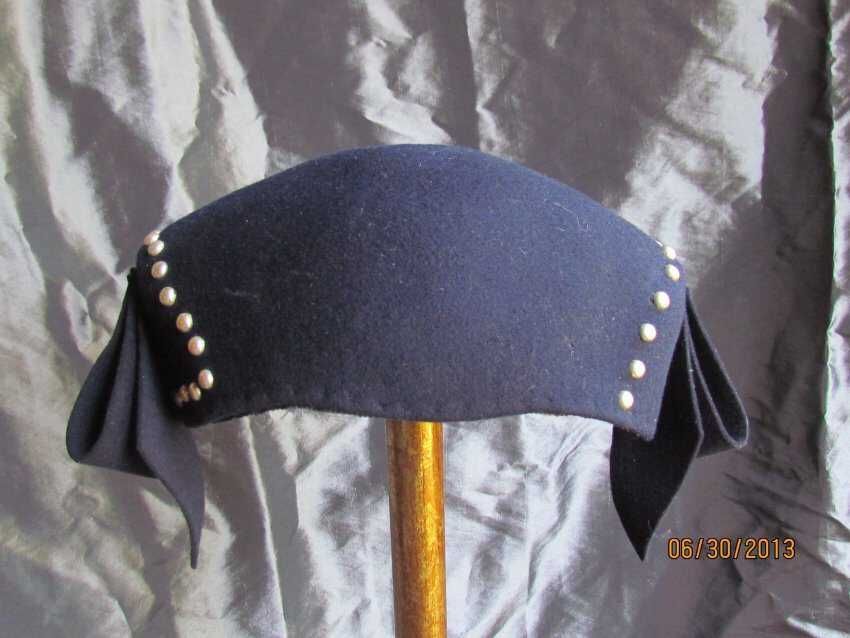 Hat, navy blue caplet made with wool and apalac felt with metal rivets with folded felt embellishments on sides. Maker label stamped inside: Merrimac Hat Corp, Made in the USA, 94% Wool 6% Apalac".Collection