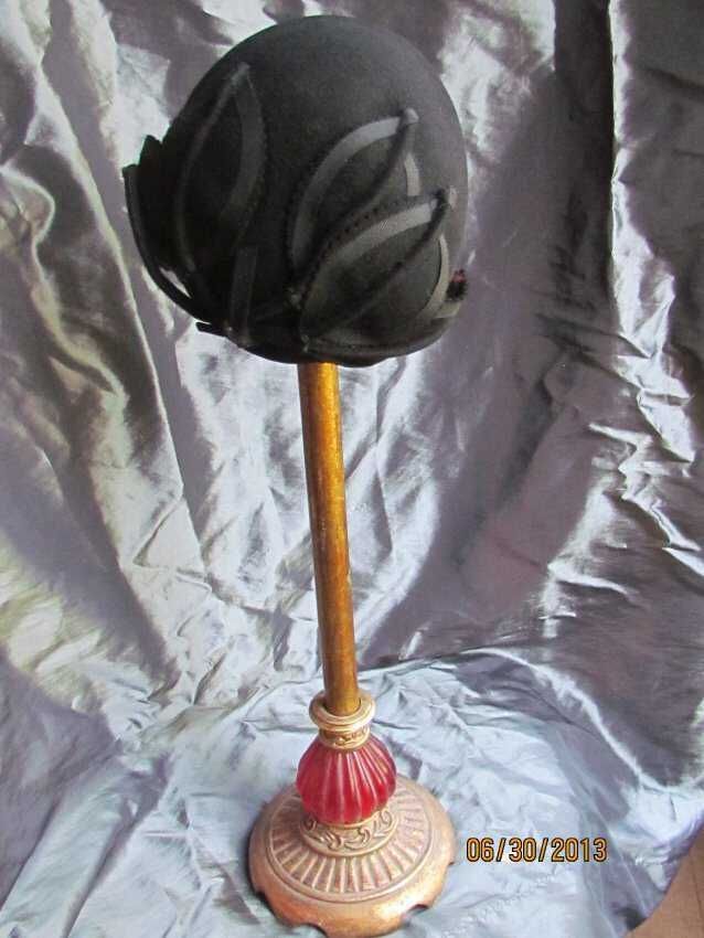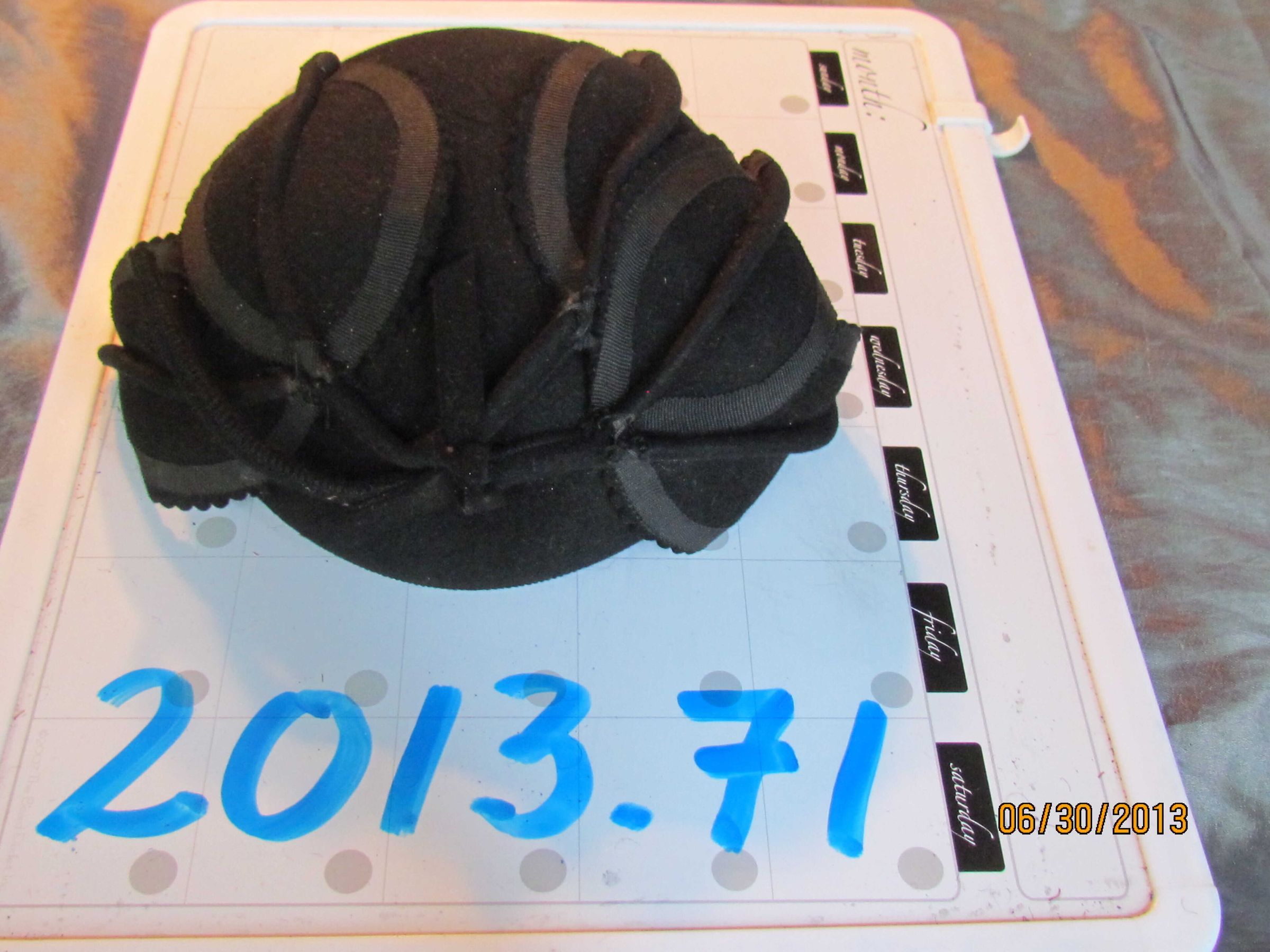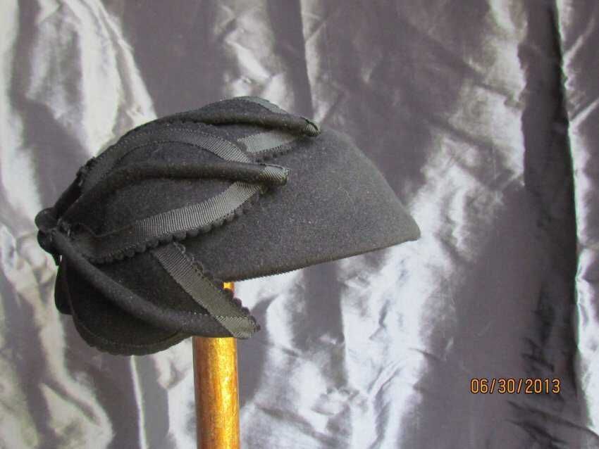 Hat, cocktail hat, black wool felt, 5 black wool leaves embellishments, each leaf has petersham ribbon edge, labeled "Modern Miss"; Date: 1940sCollection