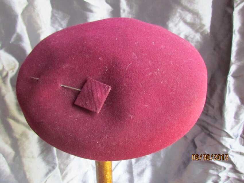 Hat, burgundy beret, label says "Chelton Beret 94% wool, 5% casein, Betmar Hats Inc, New York" size medium, leather headsize ribbon; hat pin with same felt square hat pinCollection