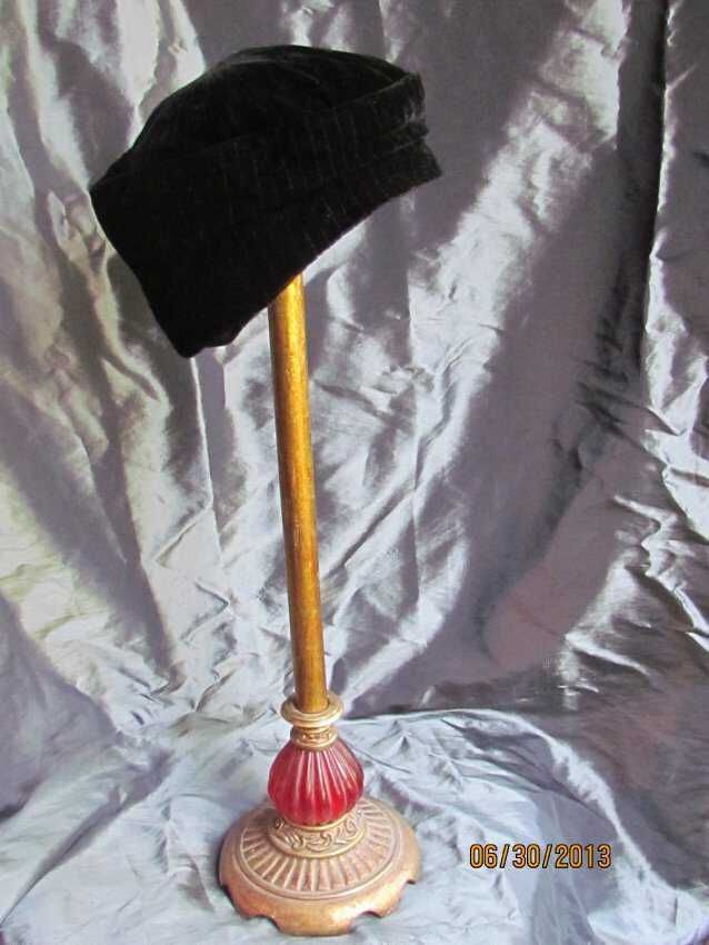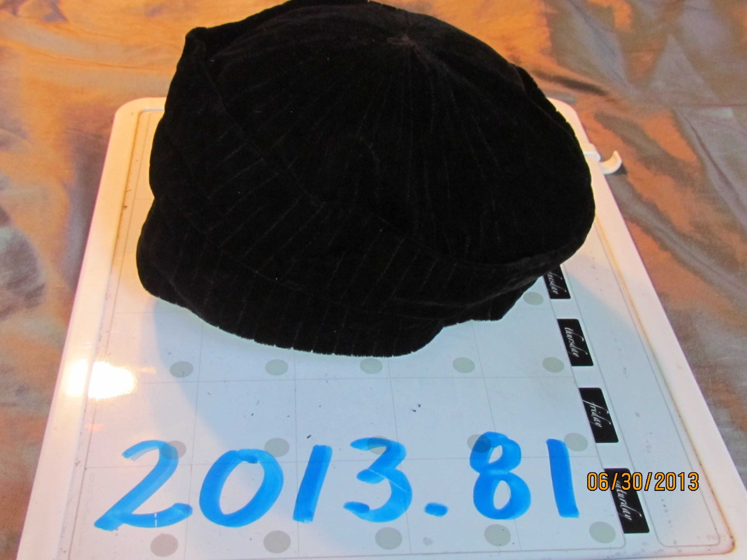 Hat, beret, black velvet with channel stitching with sun ray channel stitching on crown. Lined inside with netting. Label states, "The White House San Francisco Paris New York" and size label "22".Collection