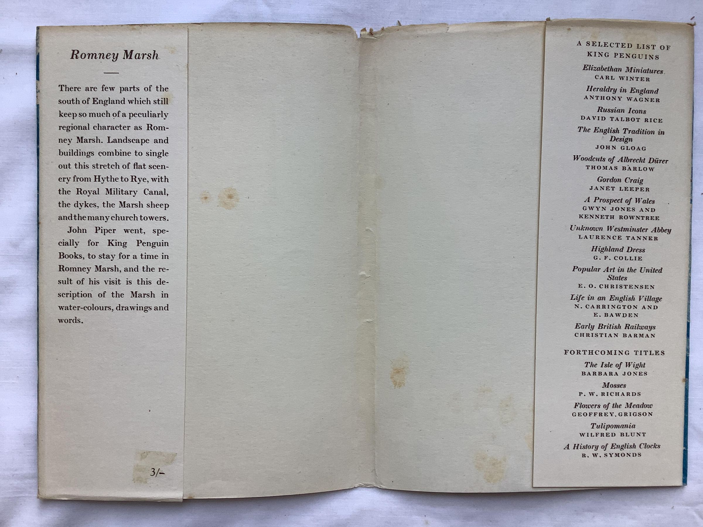 There are few parts of the south of England which still keep so much of a perculiarly regional character as Romney Marsh. (...) John Piper went, specially for King Penguin Books, to stay for a time in Romney Marsh, and the result of his visit is this description of the Marsh in water-colours, drawings and words.- Book jacketCreate Date