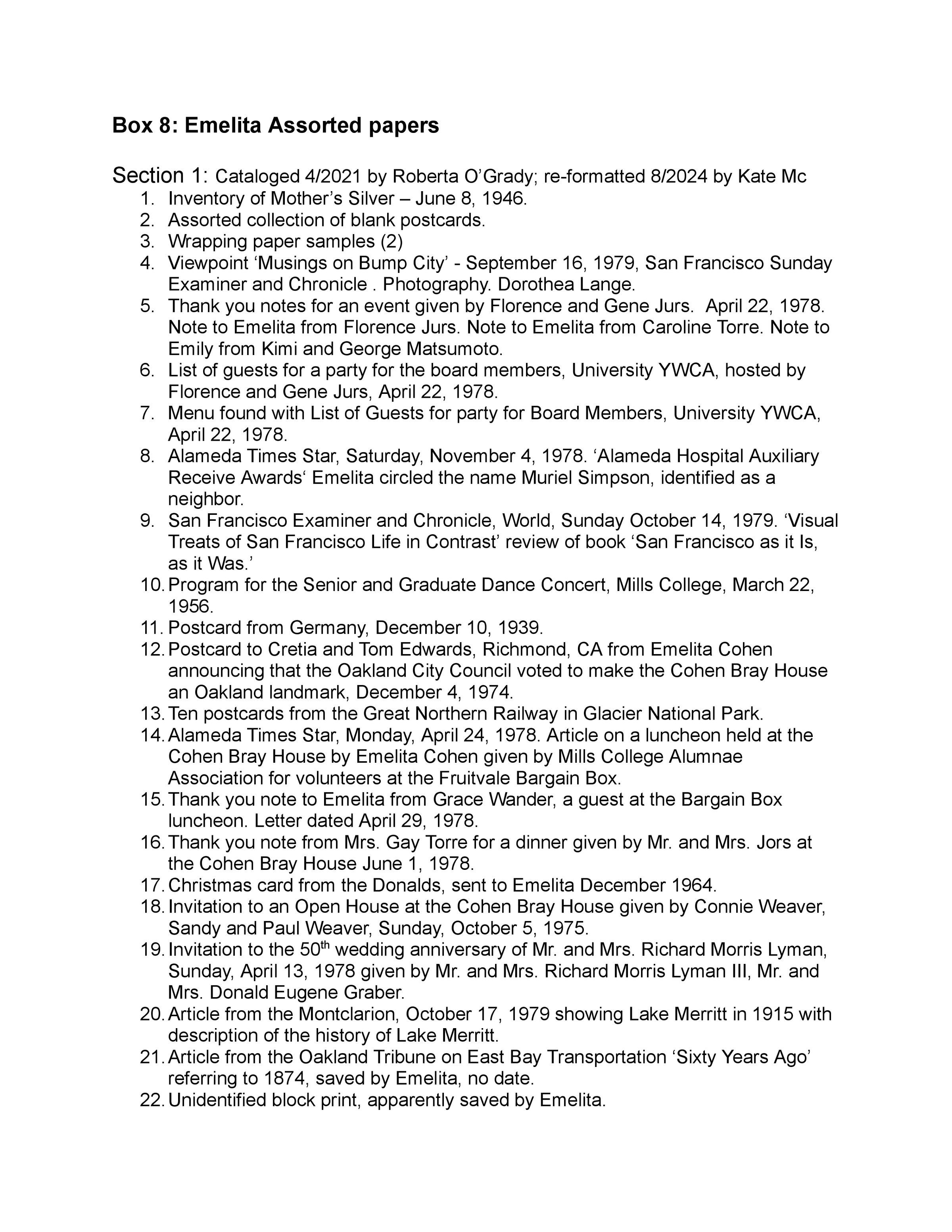 Collection of correspondence and ephemera saved by Emelita Cohen. Two sections which were catagloged at different dates.