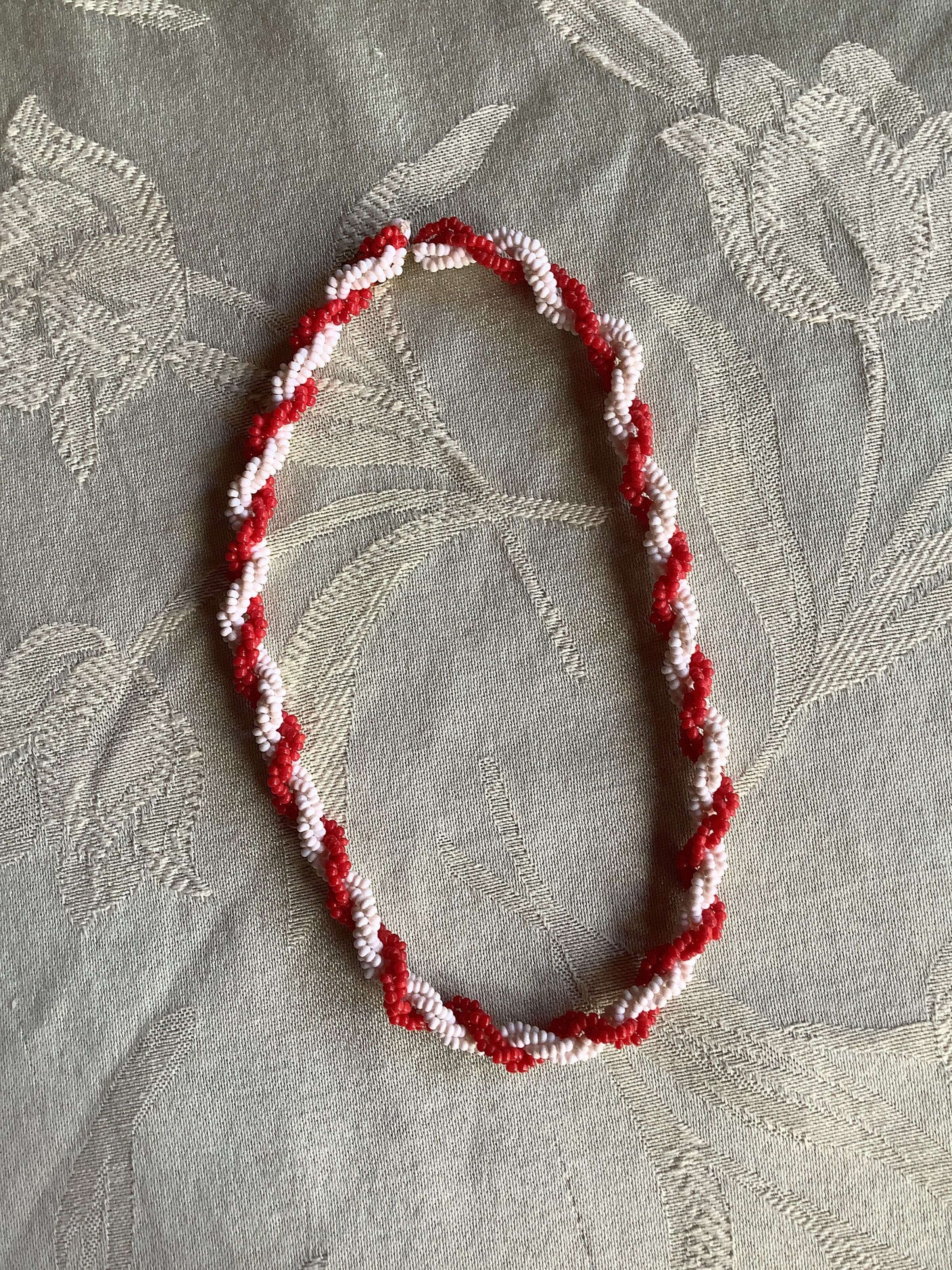 2 strands o4 small round beads, one strand white beads and one strand red beads, twisted together and clasped at the end with a gold clasp, broken off one side.Collection