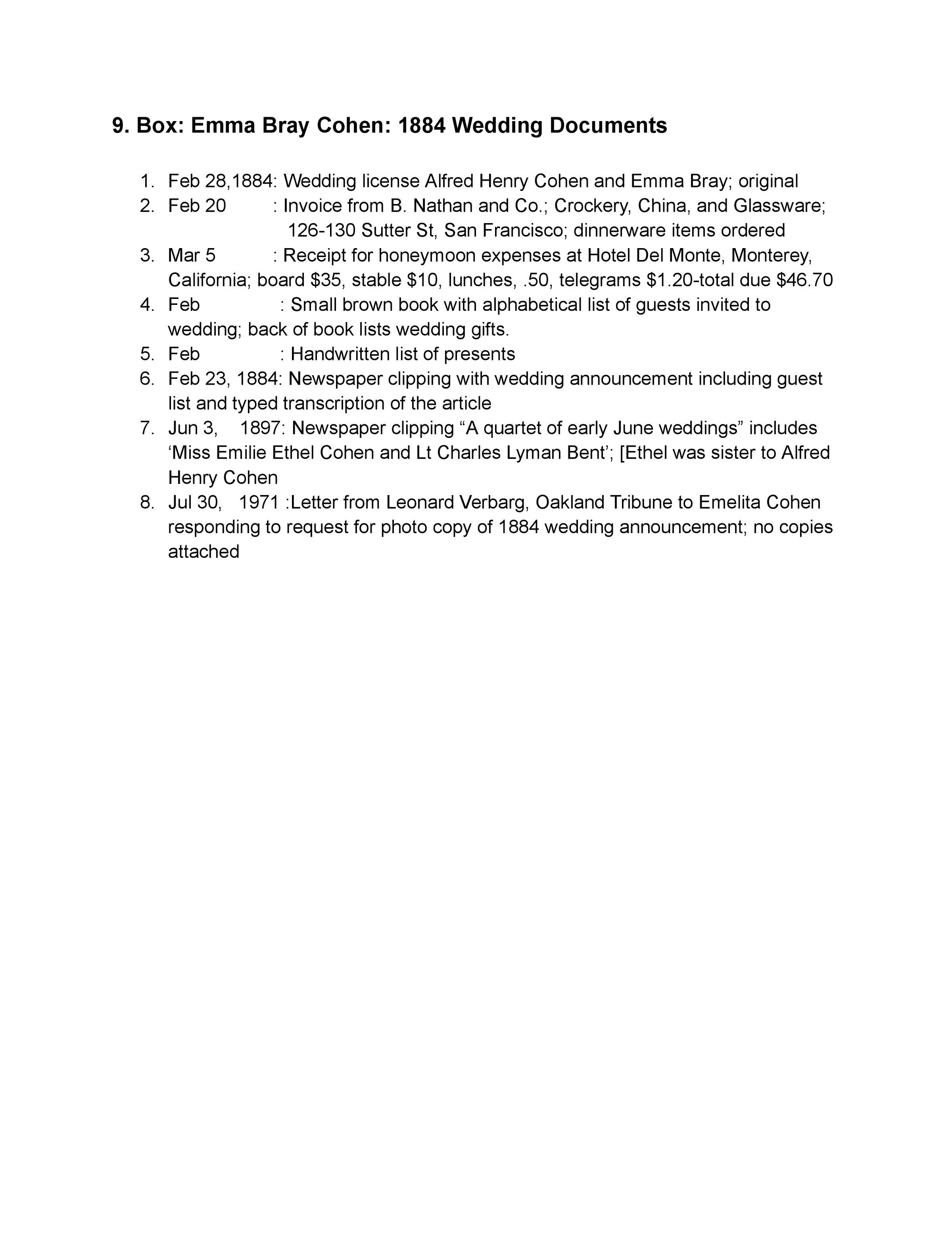 9. Box: Emma Bray Cohen: 1884 Wedding documents original and copies
