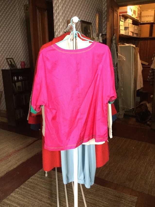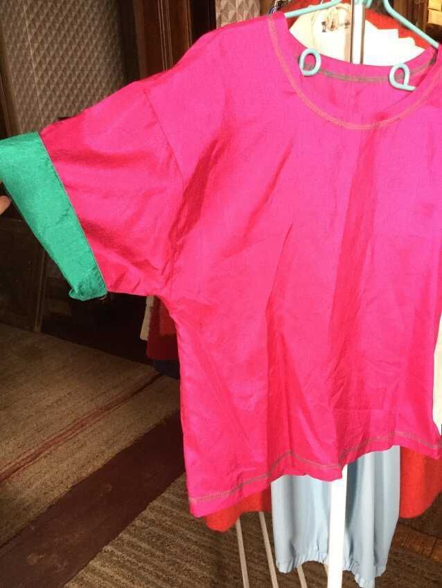 blouse, pink with green sleeves,100% poly Joan Walters