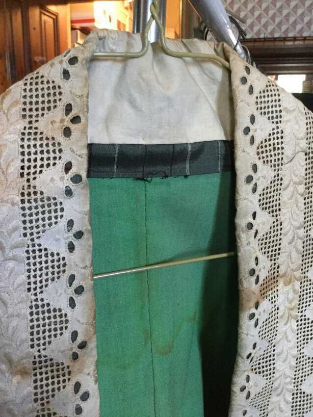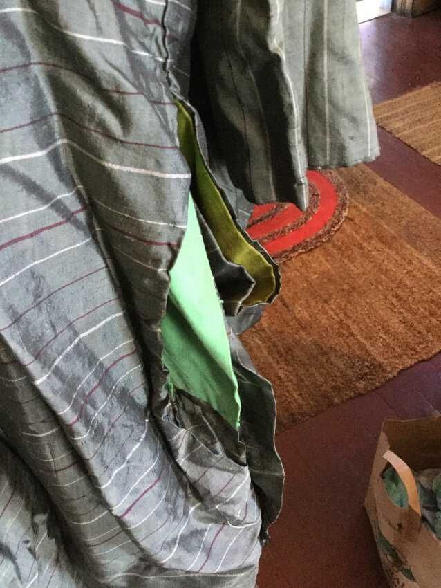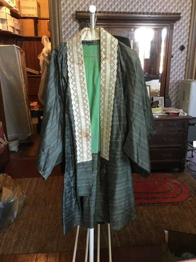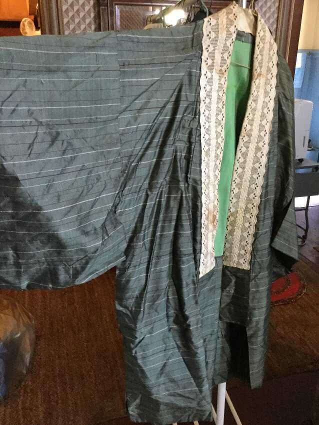 jacket, kimono style, silk Chantung, green gray with burgundy stripes, eyelet collar green cotton liningCollection