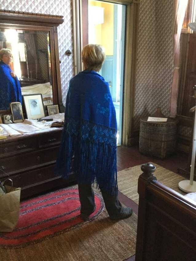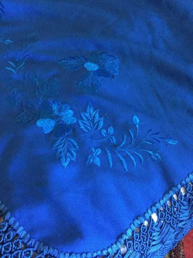 shawl, royal blue, rectangle, embroidered one side,woven ribbon trim,
