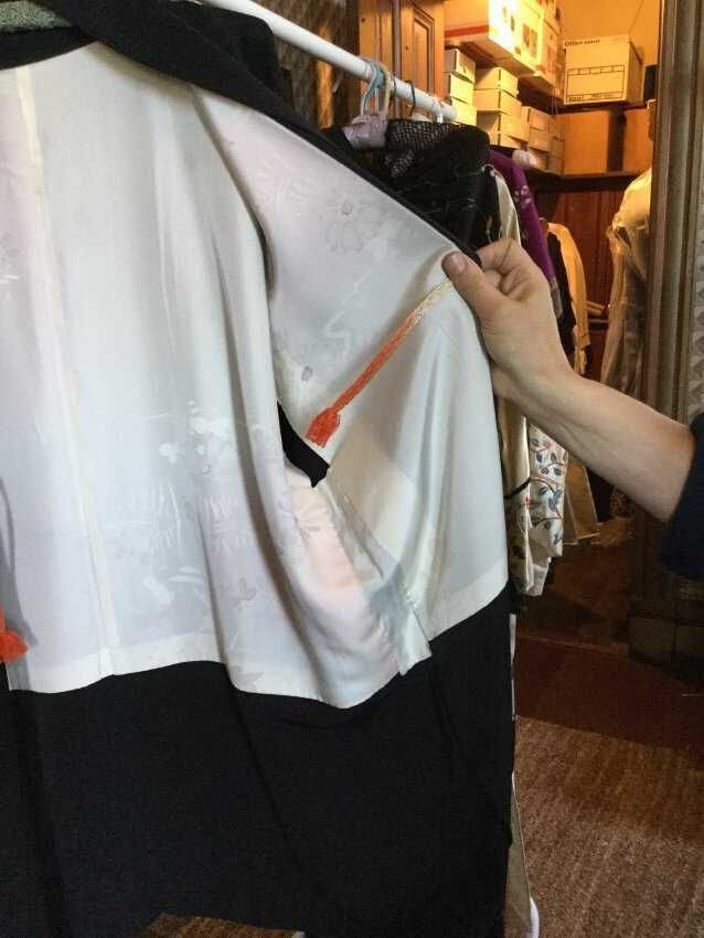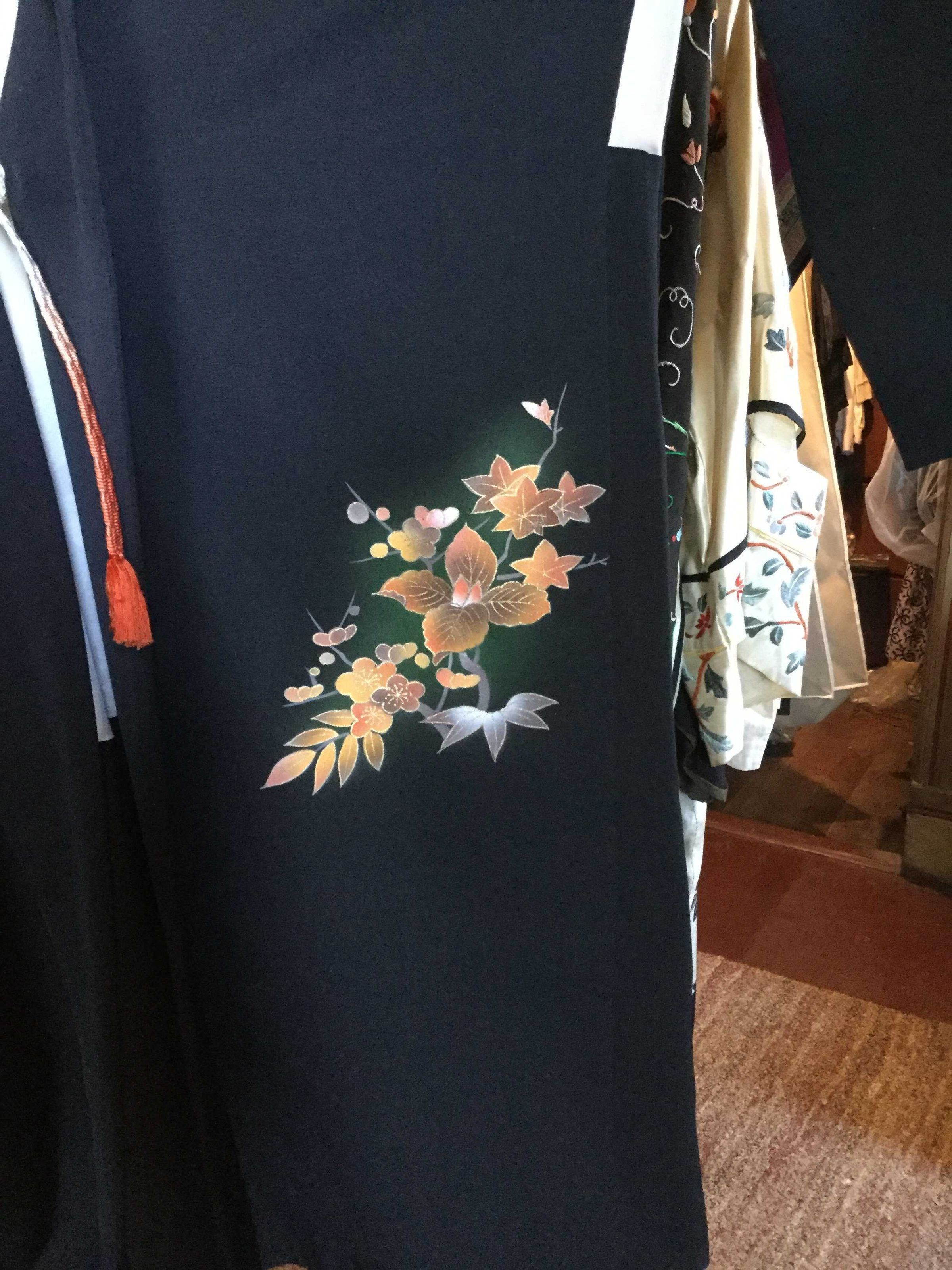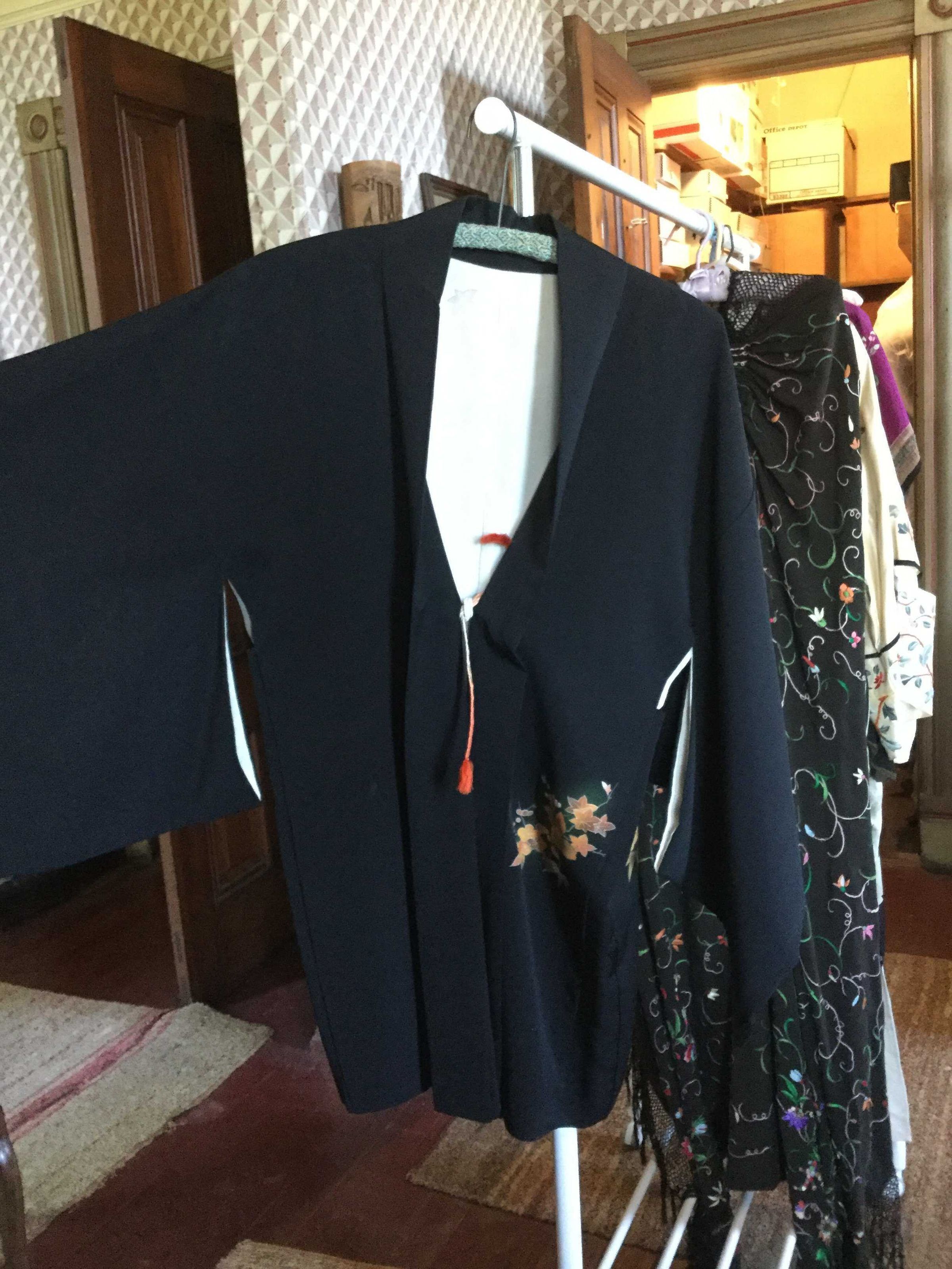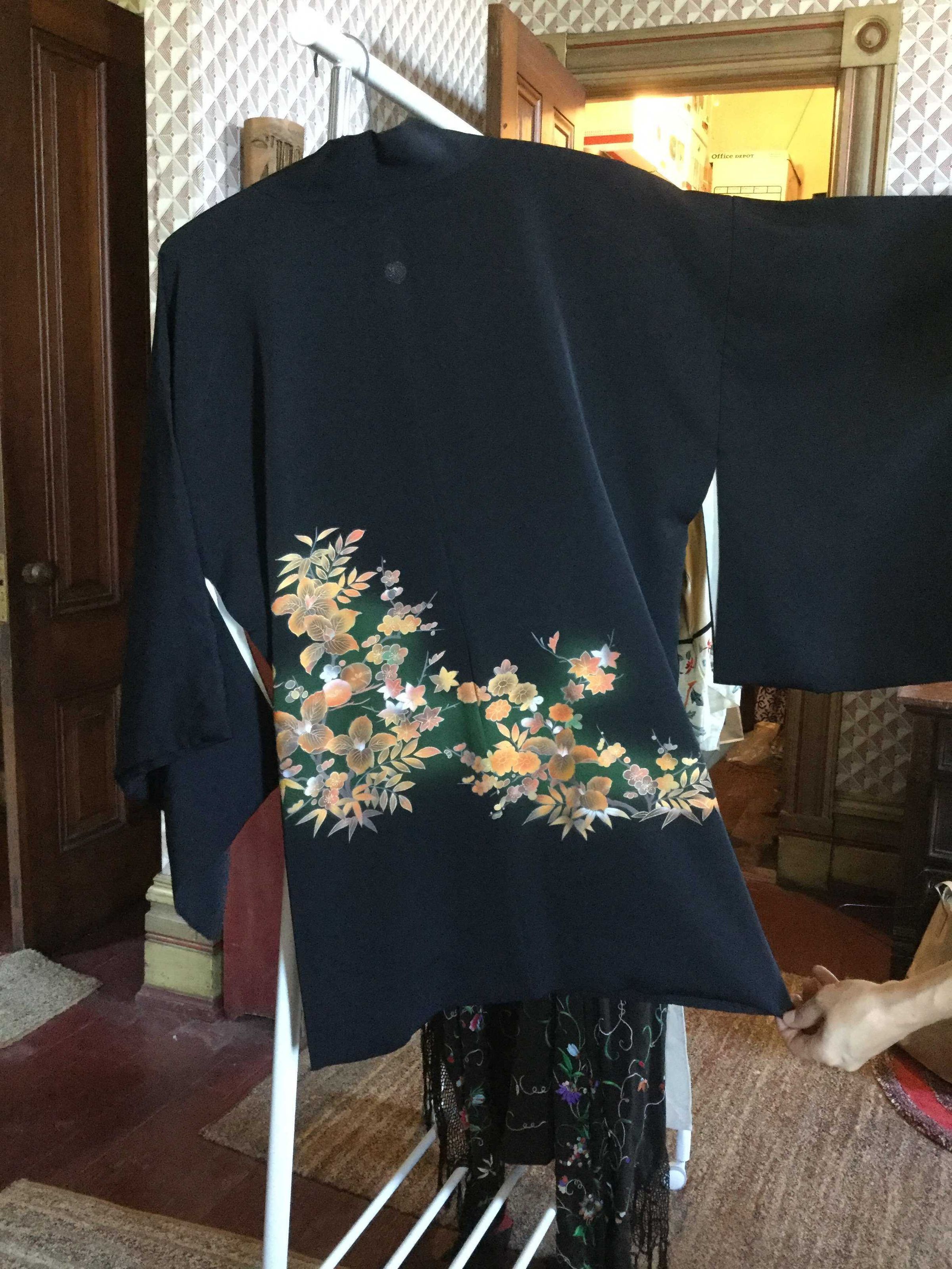 Jacket, kimono style, black silk, orange flower, fall leaves print, cord closure, white flowered lining