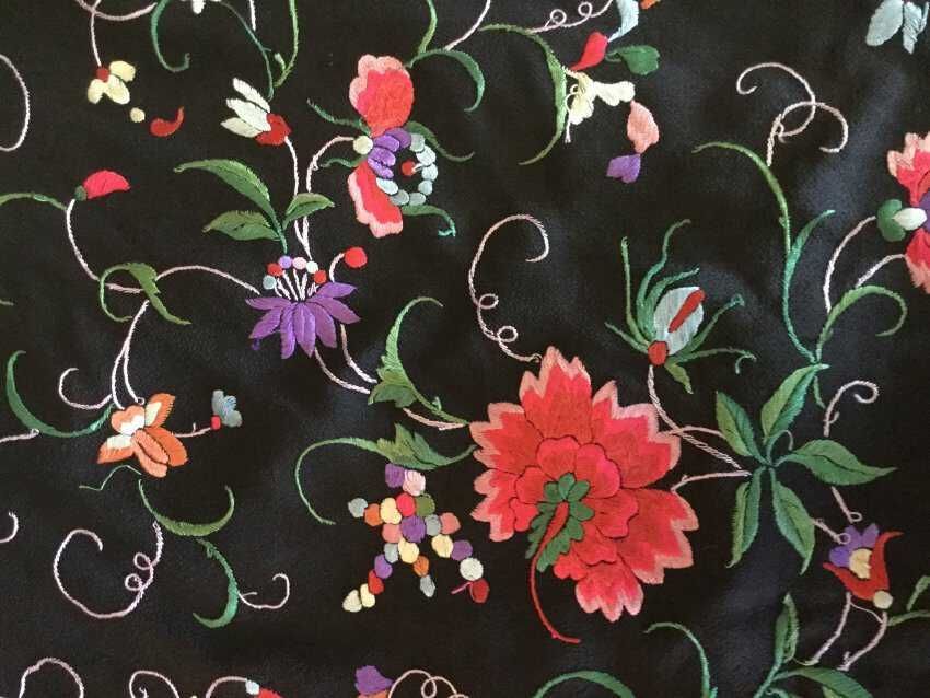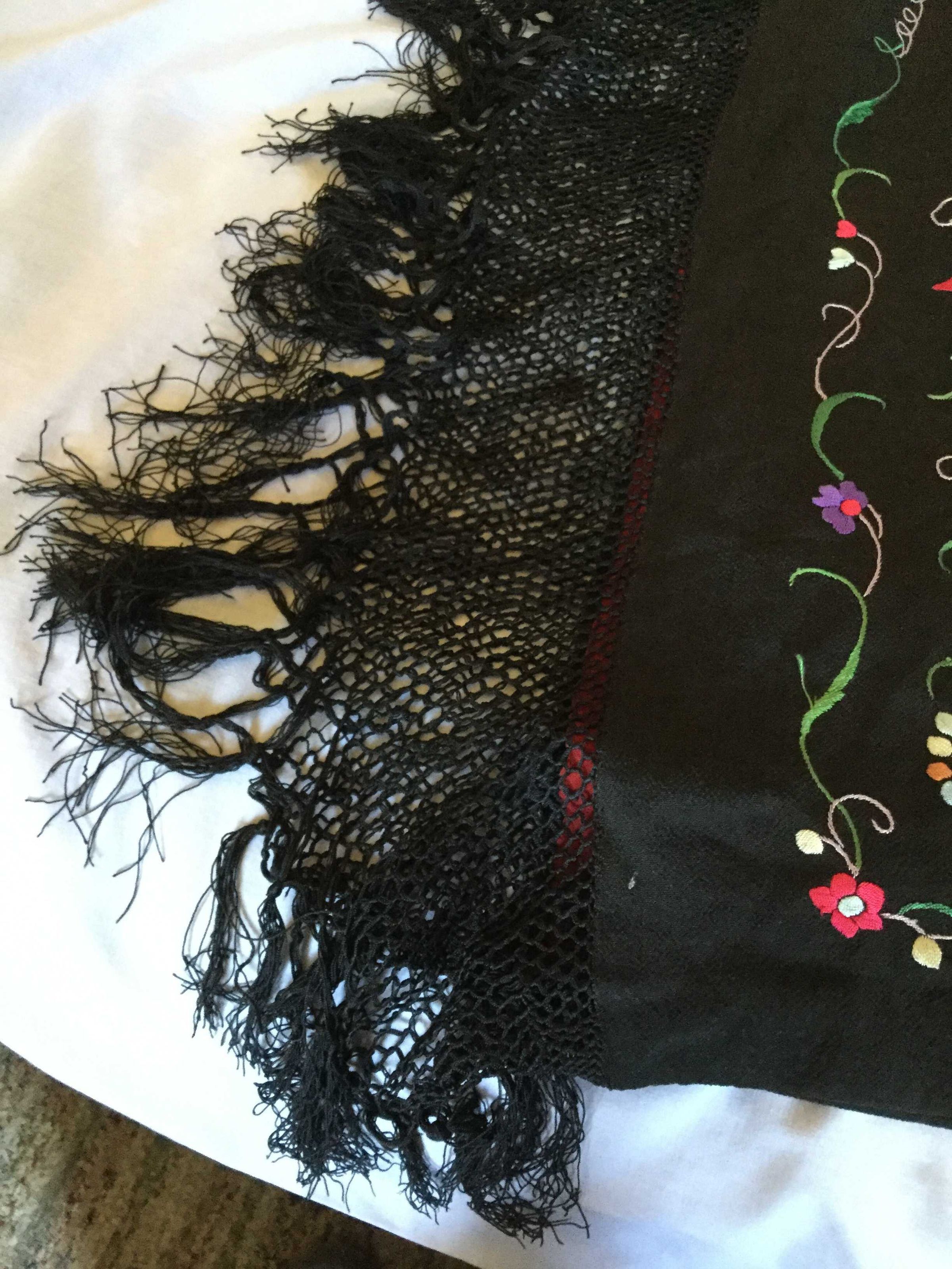 shawl, black silk, embroidered flower-, abstract, square, knotted fringe trim, fringe 14.5 rouched at neckCollection