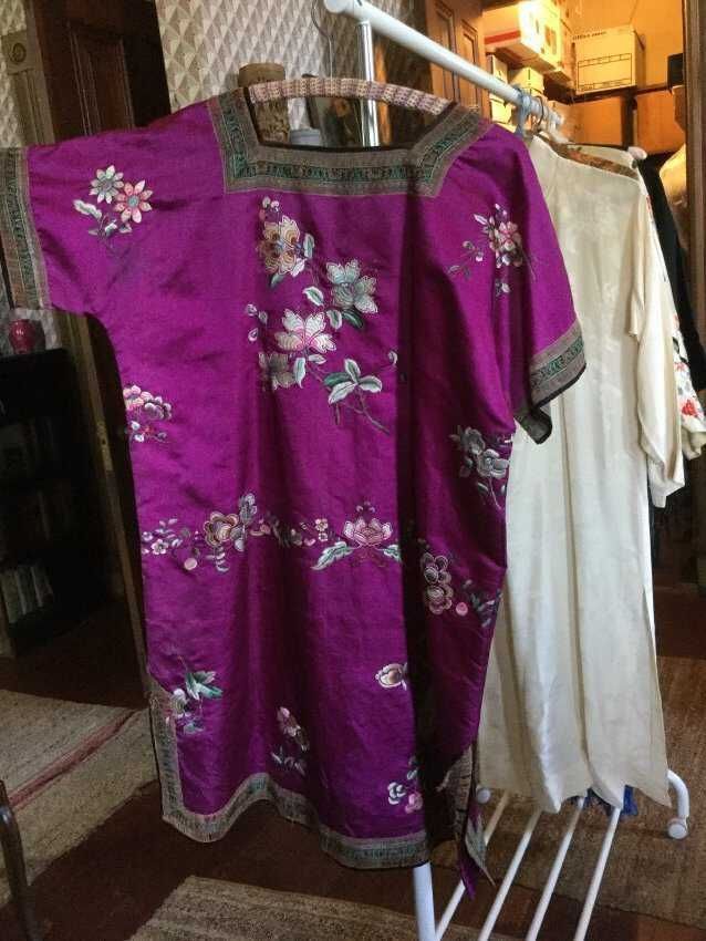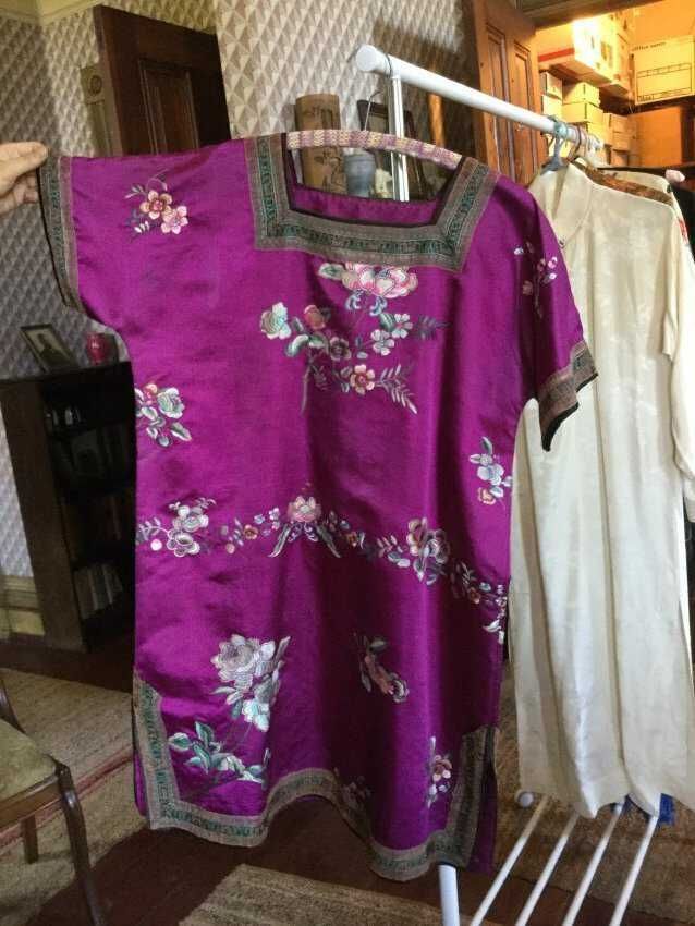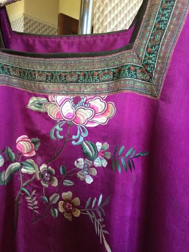 tunic, purple silk/ , embroidered flowers, ribbon trim on neck