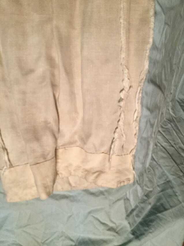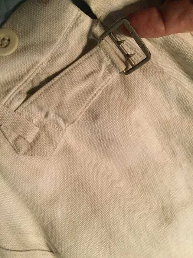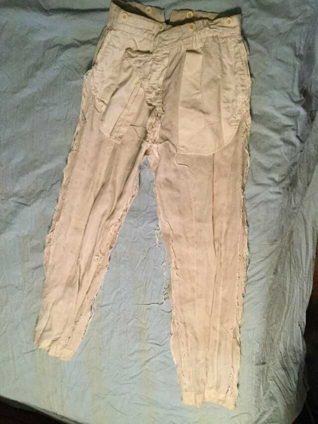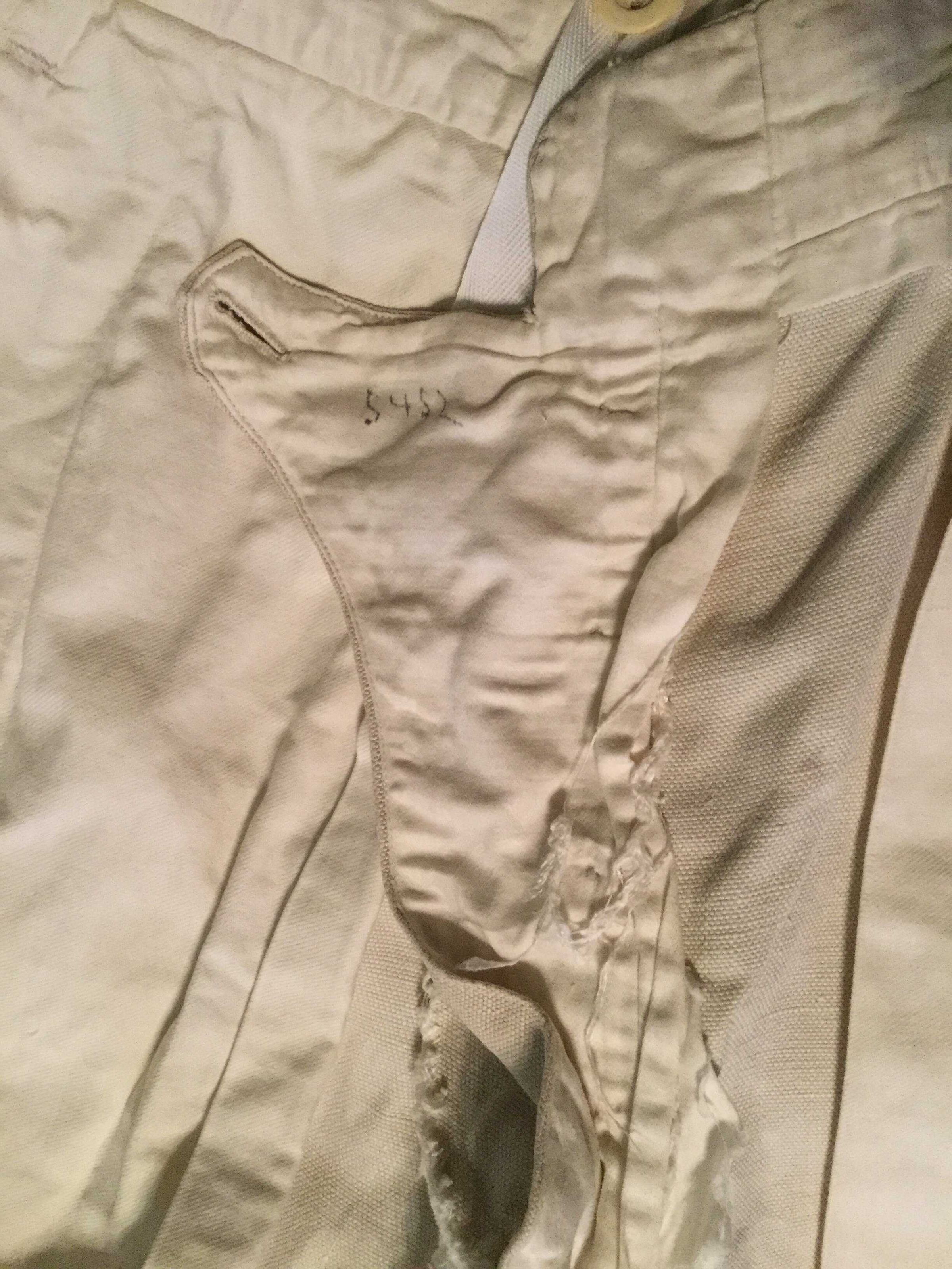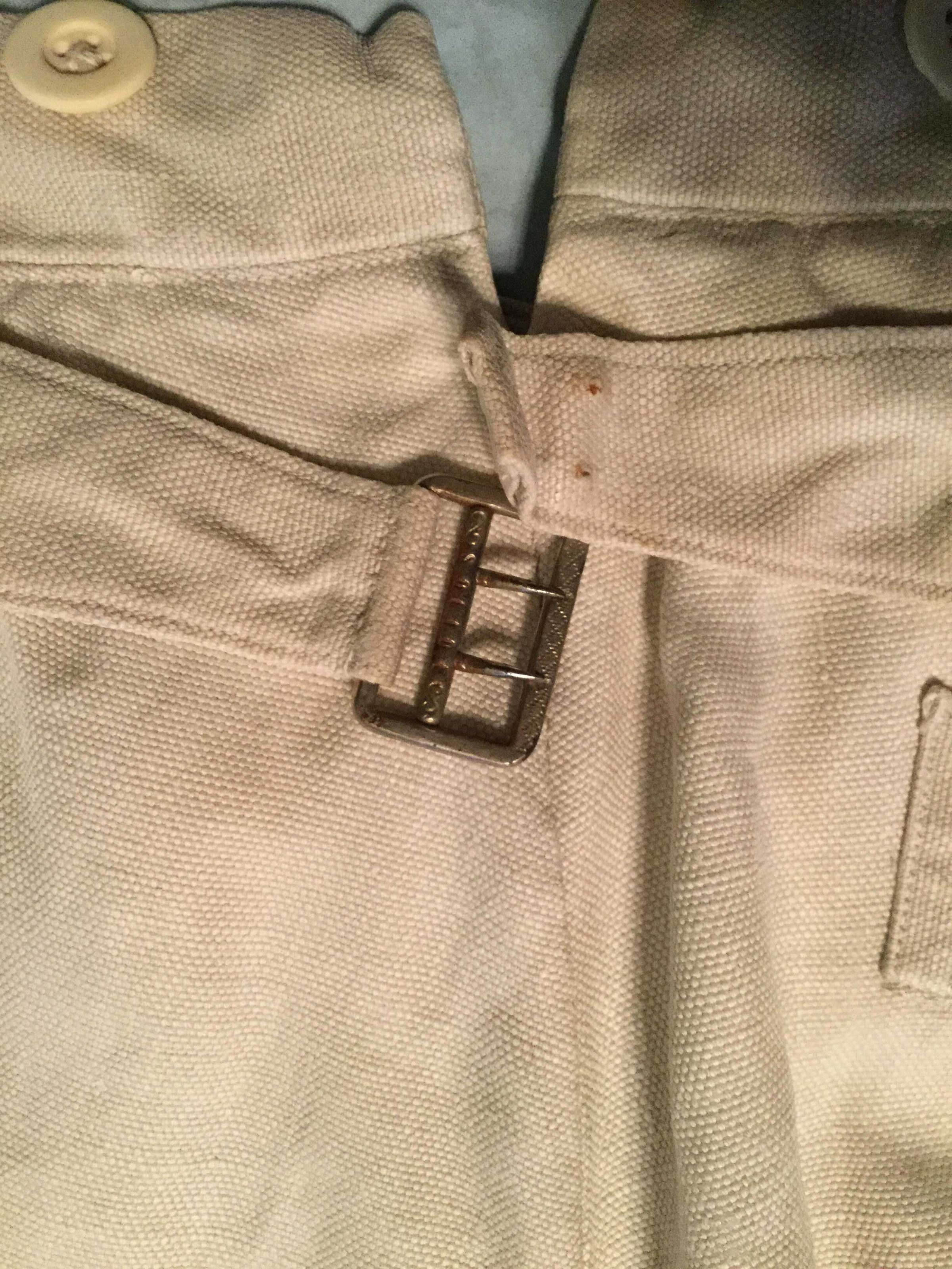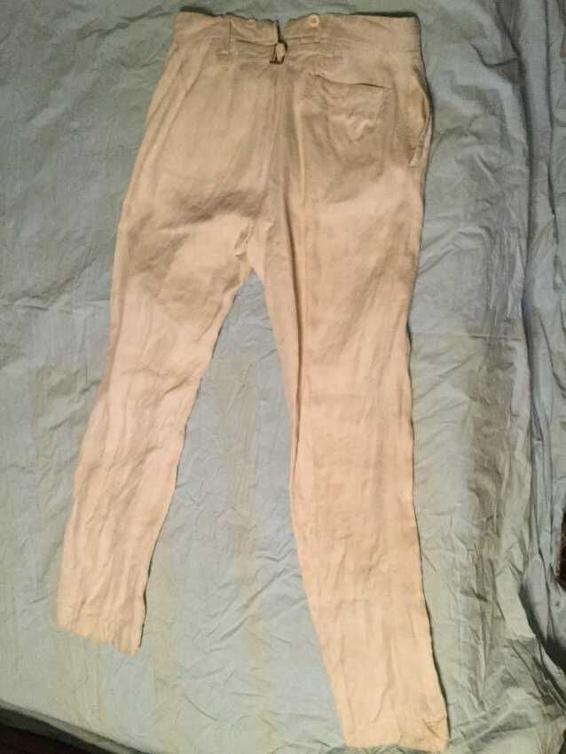 trousers; white linen; machine sewn/hand finished; suspender buttons (four front inside/two back outside); 4 placket buttons and hook and bar closure; adjustable tab w/buckle at back; notched waist; two side pockets; one rear pocket; basting shows at hems; seam allowances at leg are odd - wide on one side, very narrow on other; length measured at outside leg; have been washedCollection