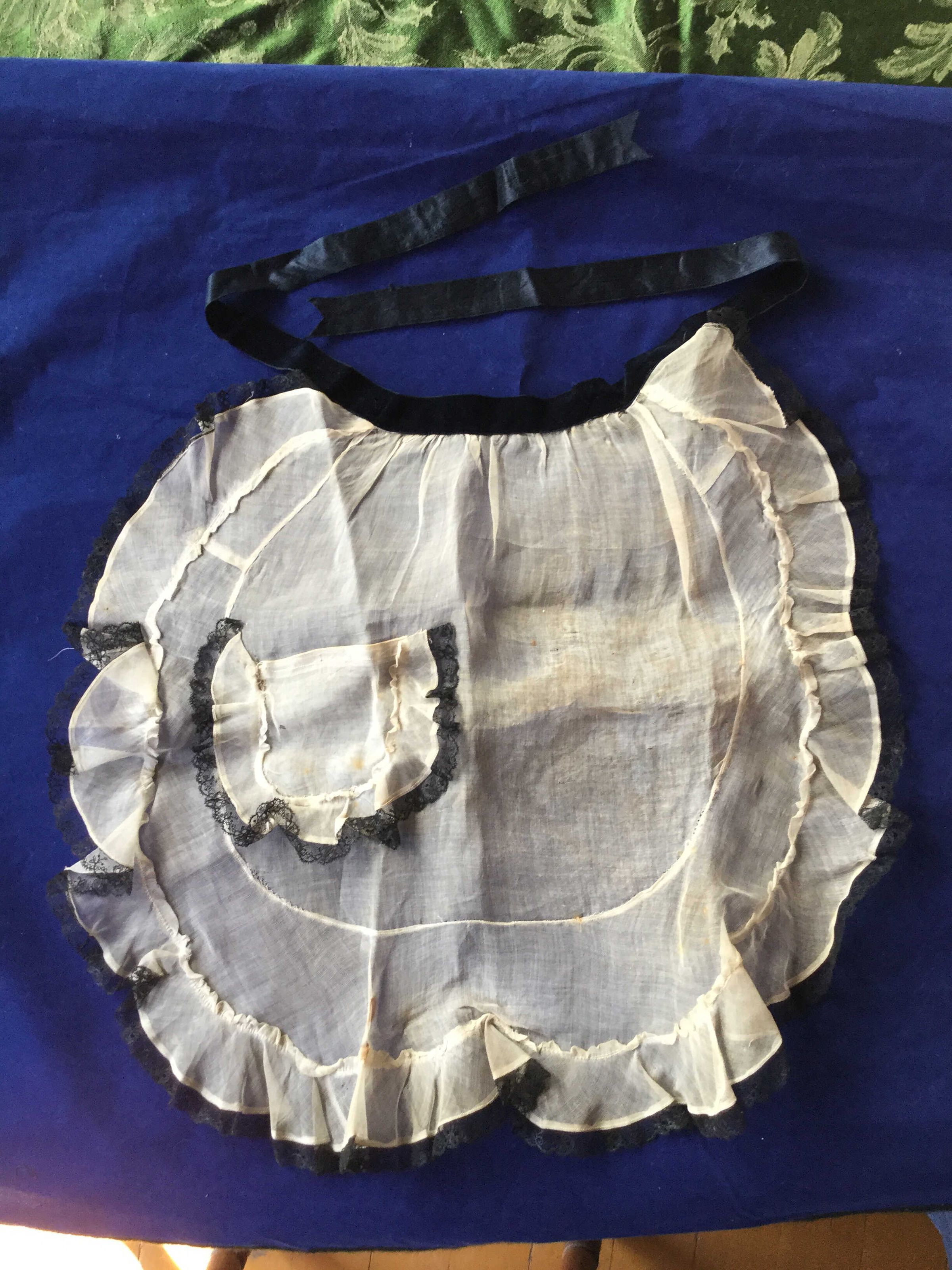 Ivory organza apron with ruffle edge, pocket, black lace trim, and black silk velvet waistband and ties