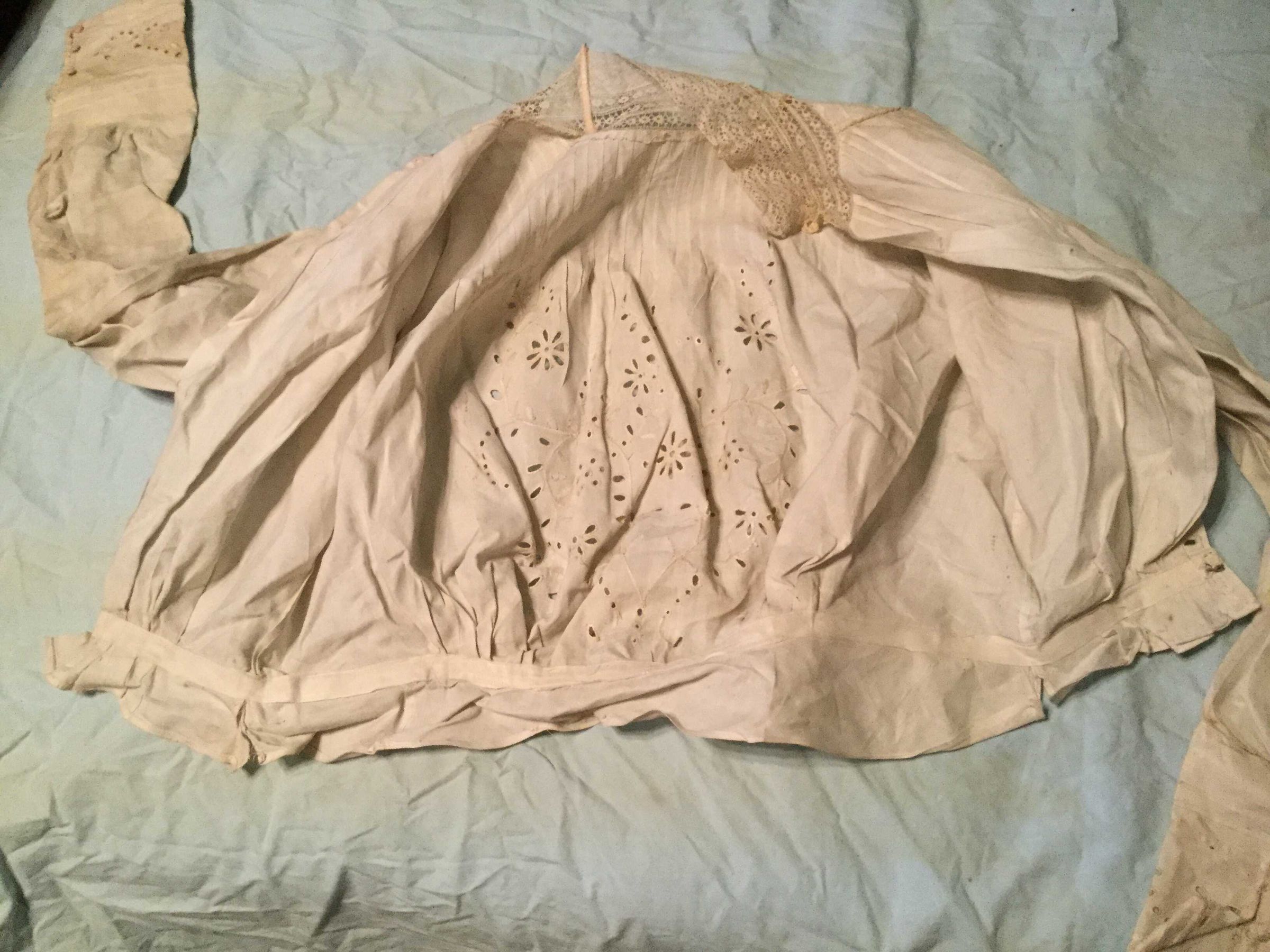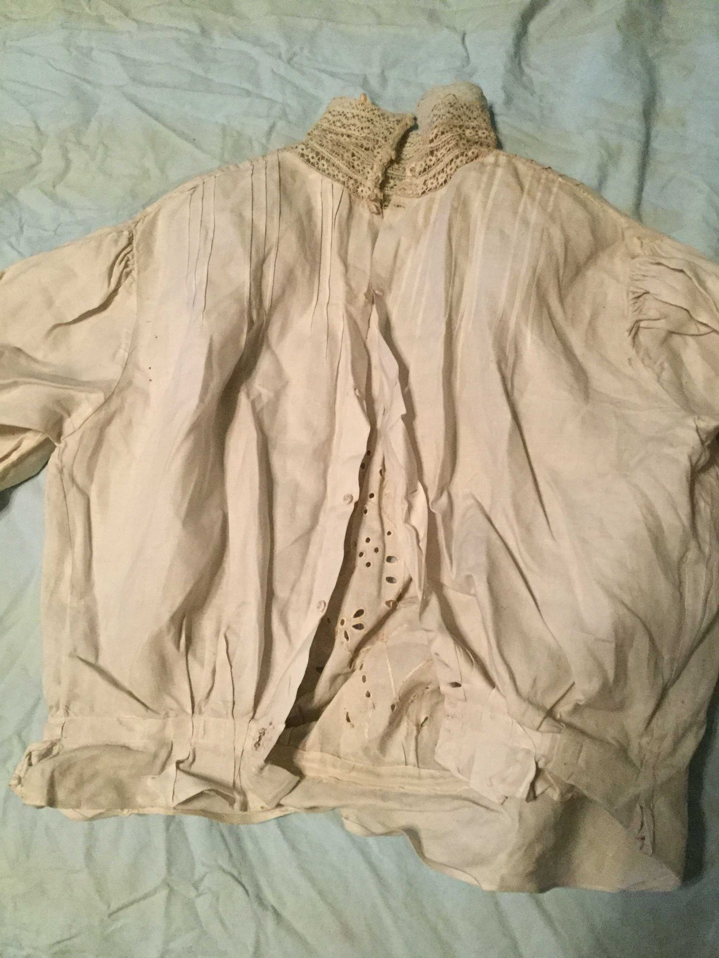 blouse, white linen (?), starched, long sleeve with puff shoulder, gathering above long cuff with eyelet inset and pintucks, 3 buttons (tiny crochet-covered); lace stand up collar with boning; back closure with tiny crochet-covered buttons (9); bodice has waistband with split seams at sides; bodice front has eyelet detail (part of actual fabric - not inset), tucked at back waist, front waist in puffy gibson girl style; good condition, slight discoloring, small tears, machine sewnCollection