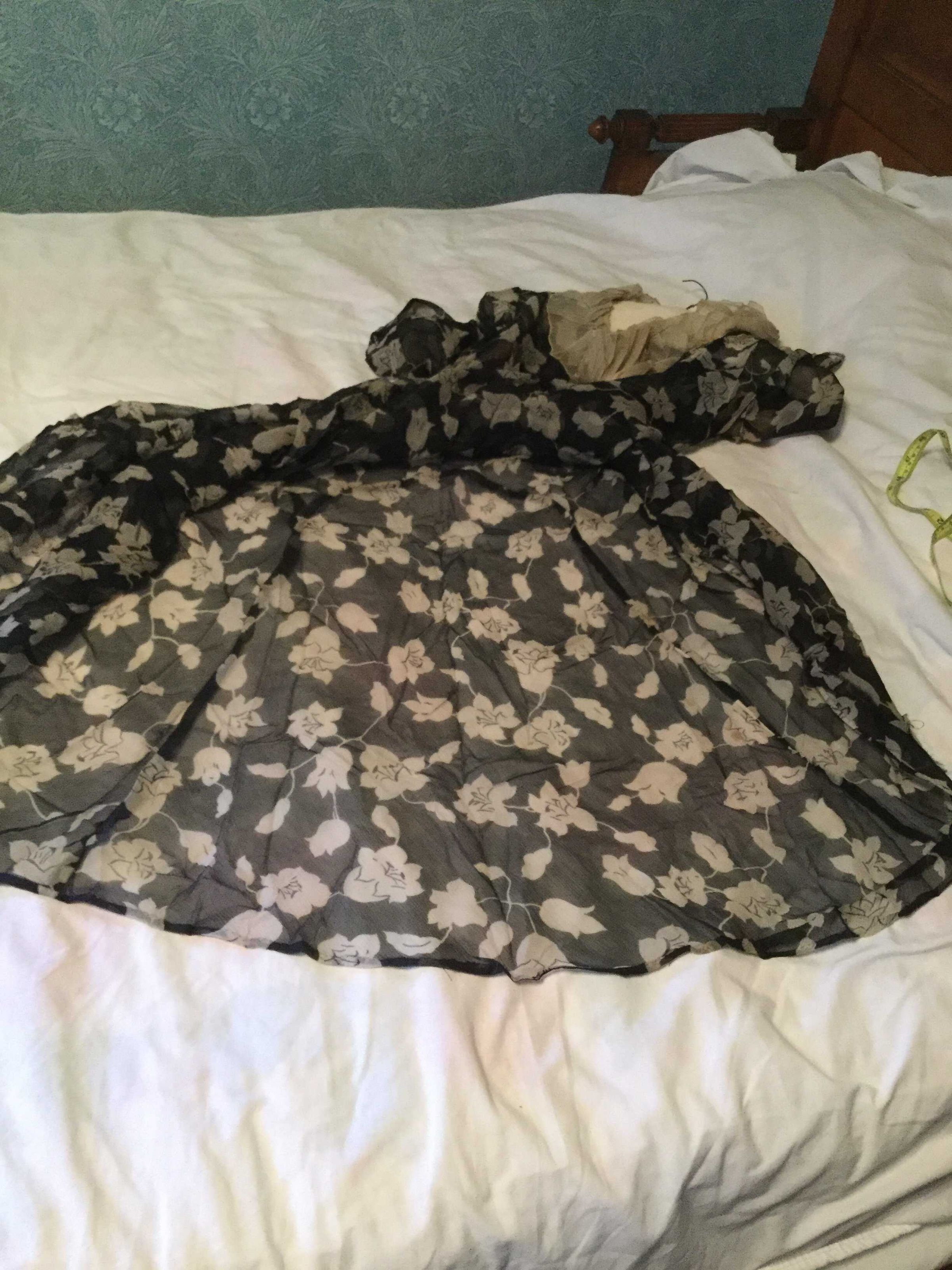 dress; black chiffon/white flowers (silk?); white gathered chiffon collar and inner elbow ruffles; interesting paneled skirt construction, machine sewn (with some visible hand basting), sweat protectors say Gallia, Made exclusively for The White House San Francisco 3; 1920sCollection