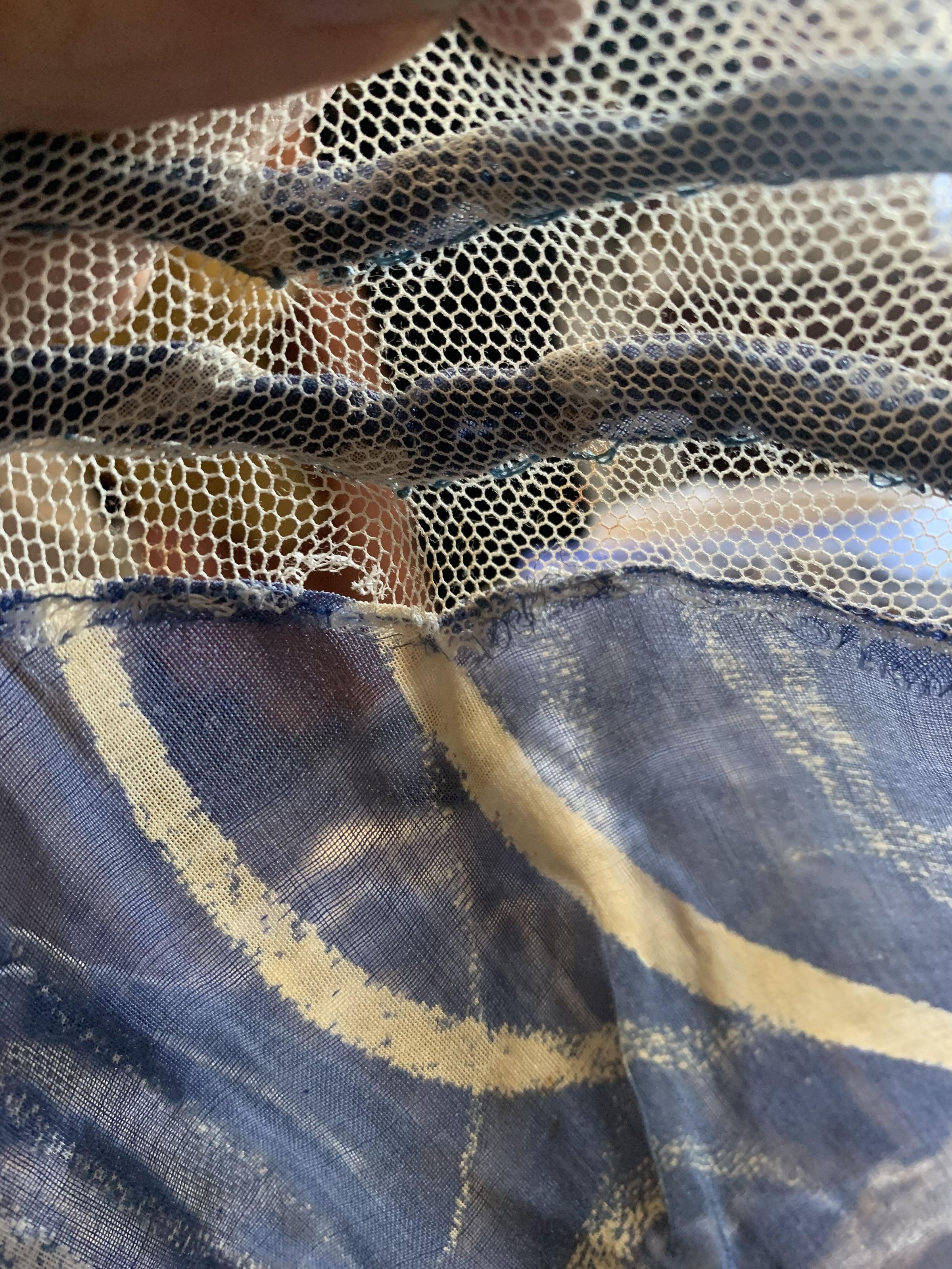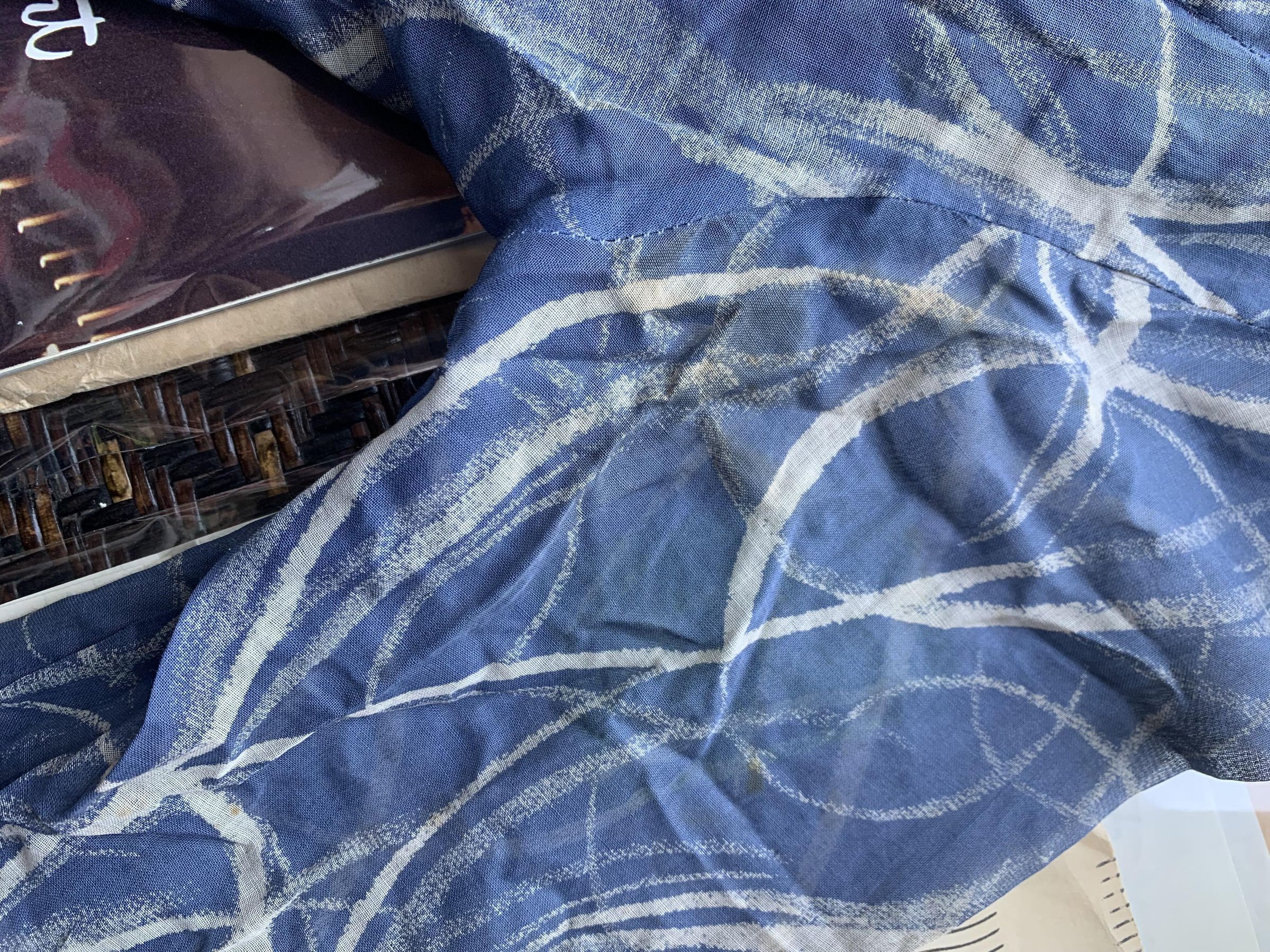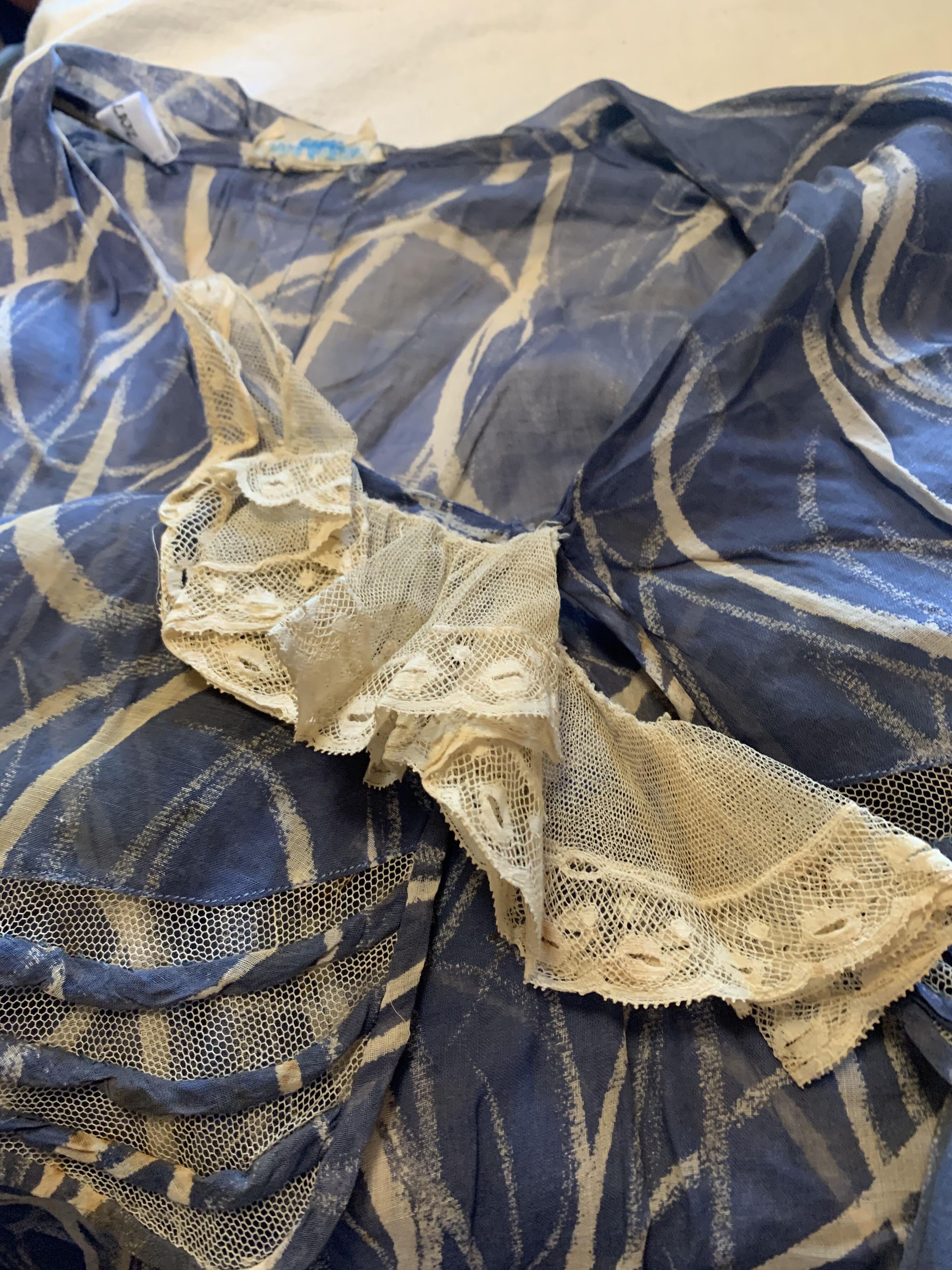 Dress with jacket; blue with abstract white print; cotton georgette(?), sailor collar has net inset/self-fabric piping overlay; separate lace frill at neckline front; machine sewn/hand finished; no tag; 1930s; has thread belt loops, no beltCollection