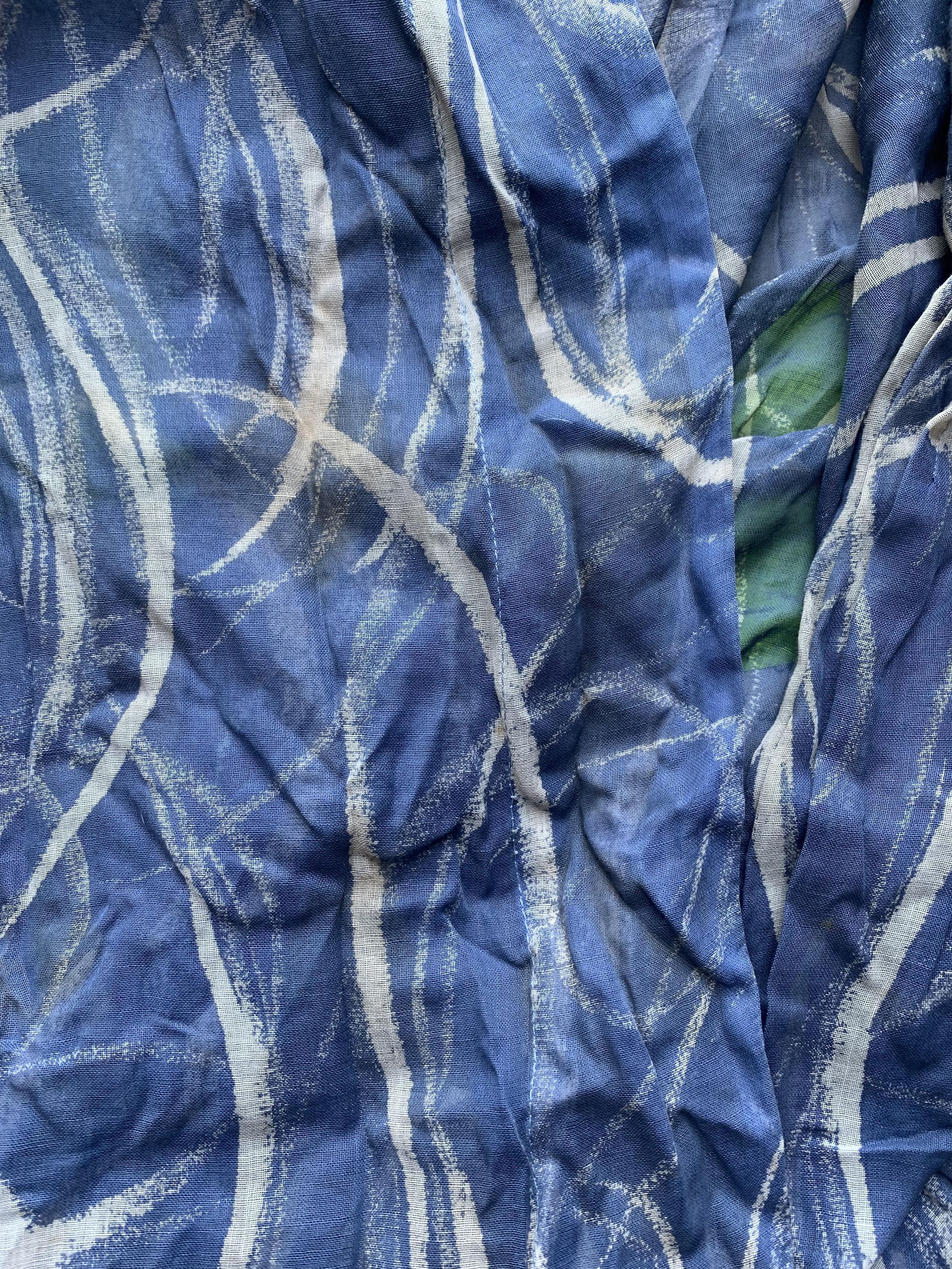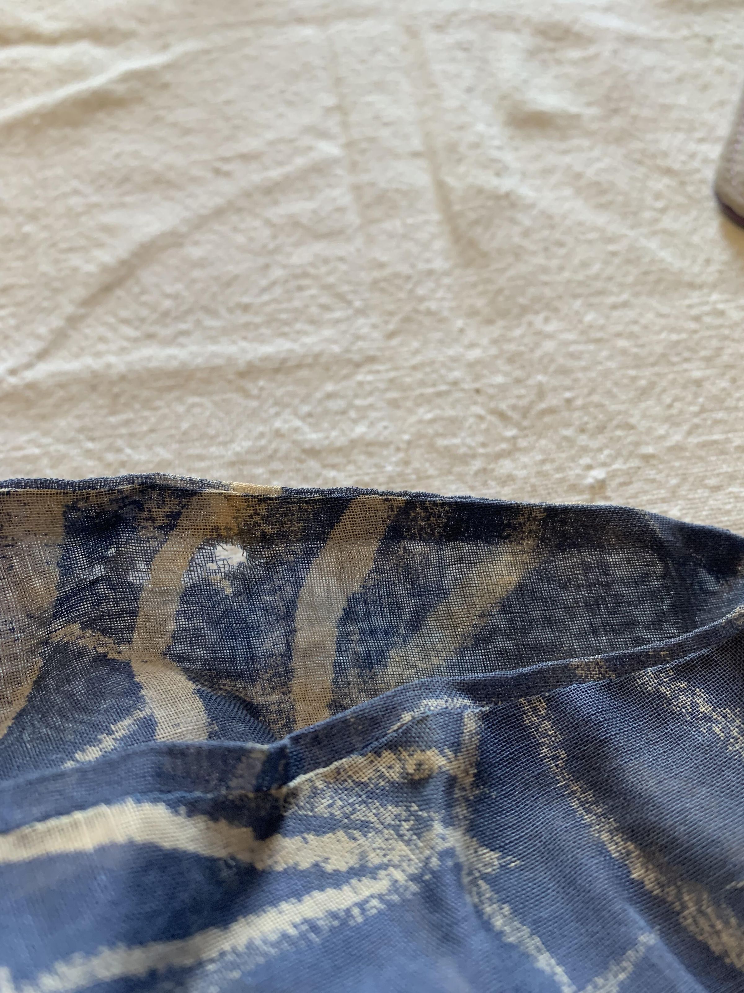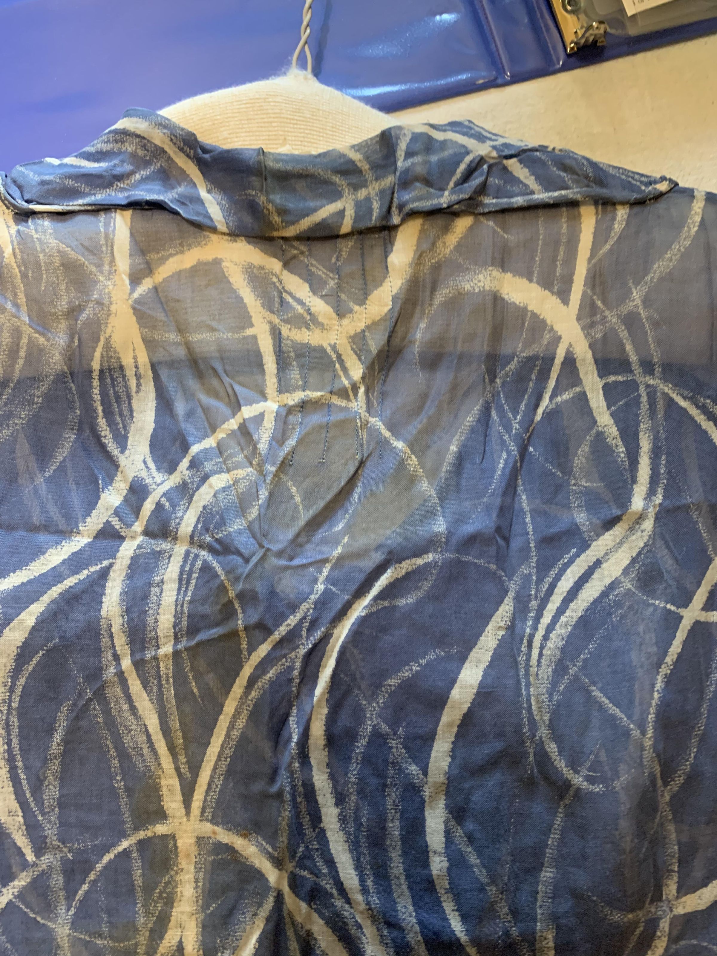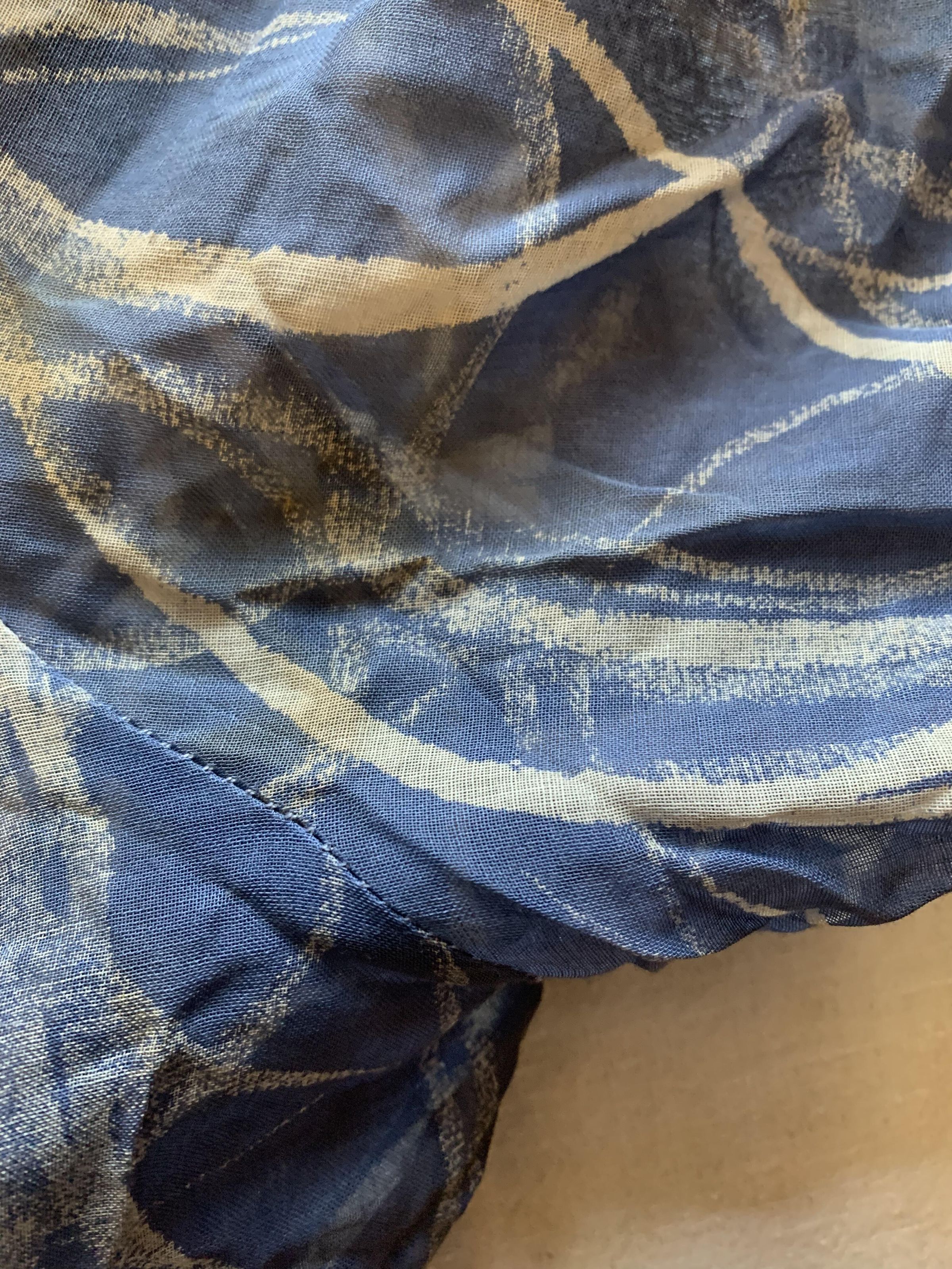Dress with jacket; blue with abstract white print; cotton georgette(?), sailor collar has net inset/self-fabric piping overlay; separate lace frill at neckline front; machine sewn/hand finished; no tag; 1930s; has thread belt loops, no beltCollection
