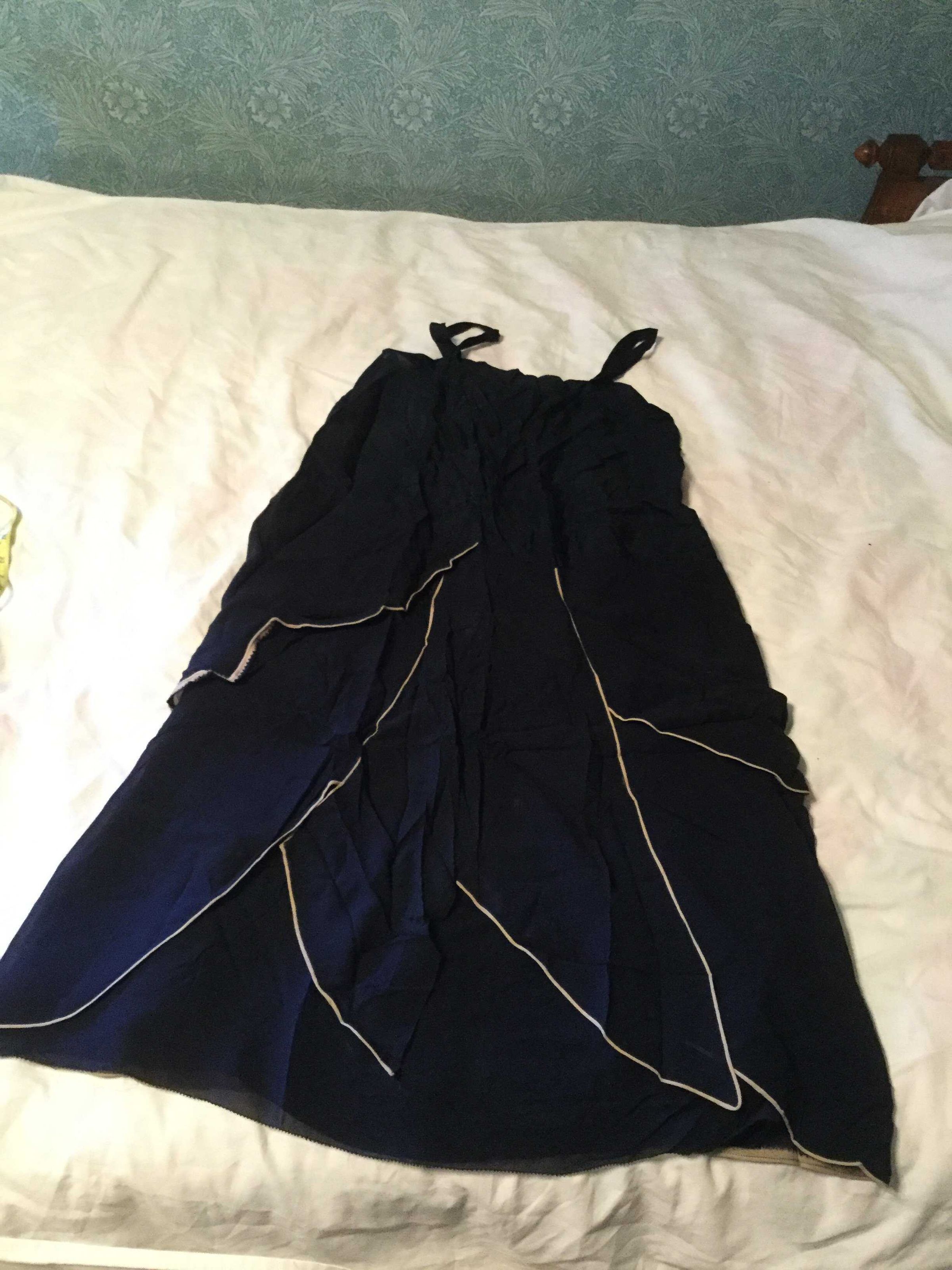 dress black chiffon with ecru piping;inner dress, silk (?); 1920s; overskirt has asymmetrical panels, underskirt chiffon, slip top is heavier silk (?) fabric with straight top, straps; machine sewn; looks like had tag but none now;Collection