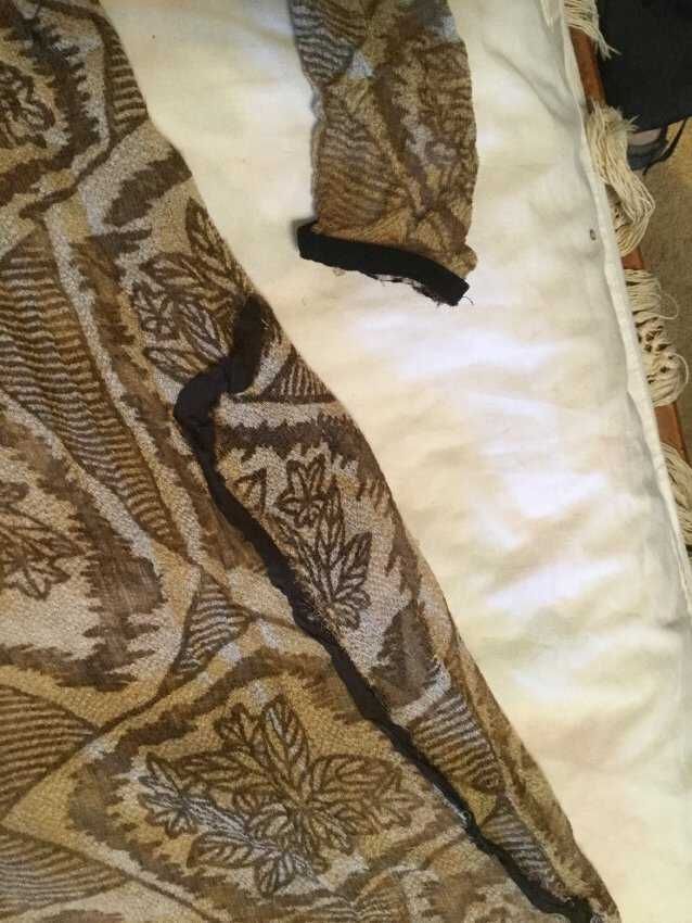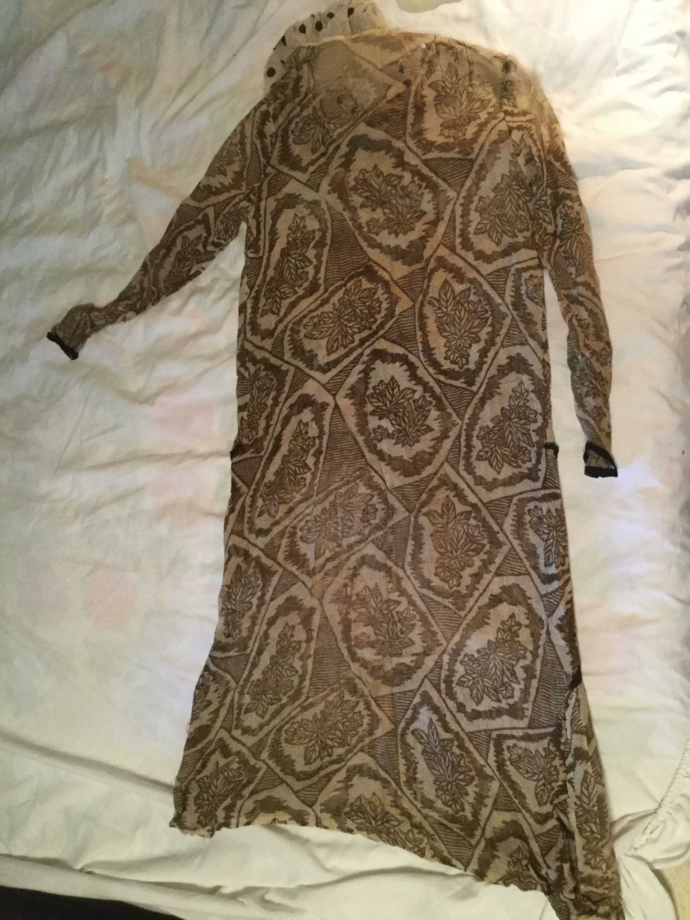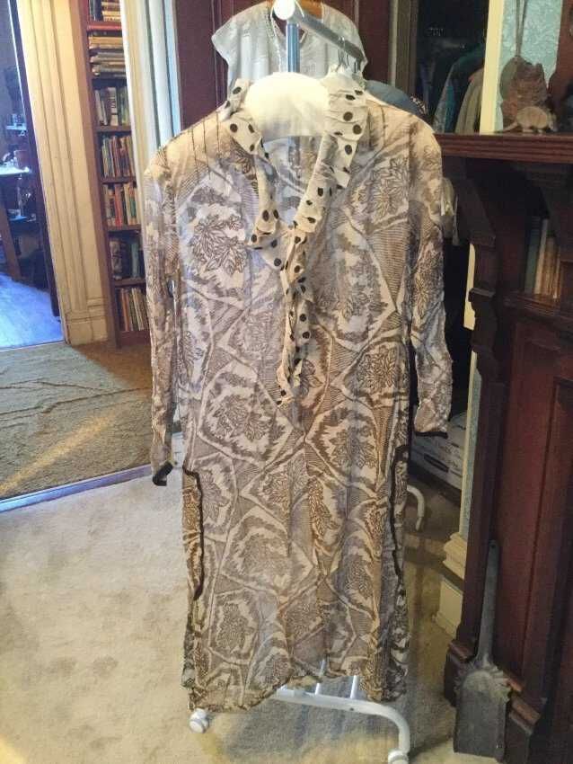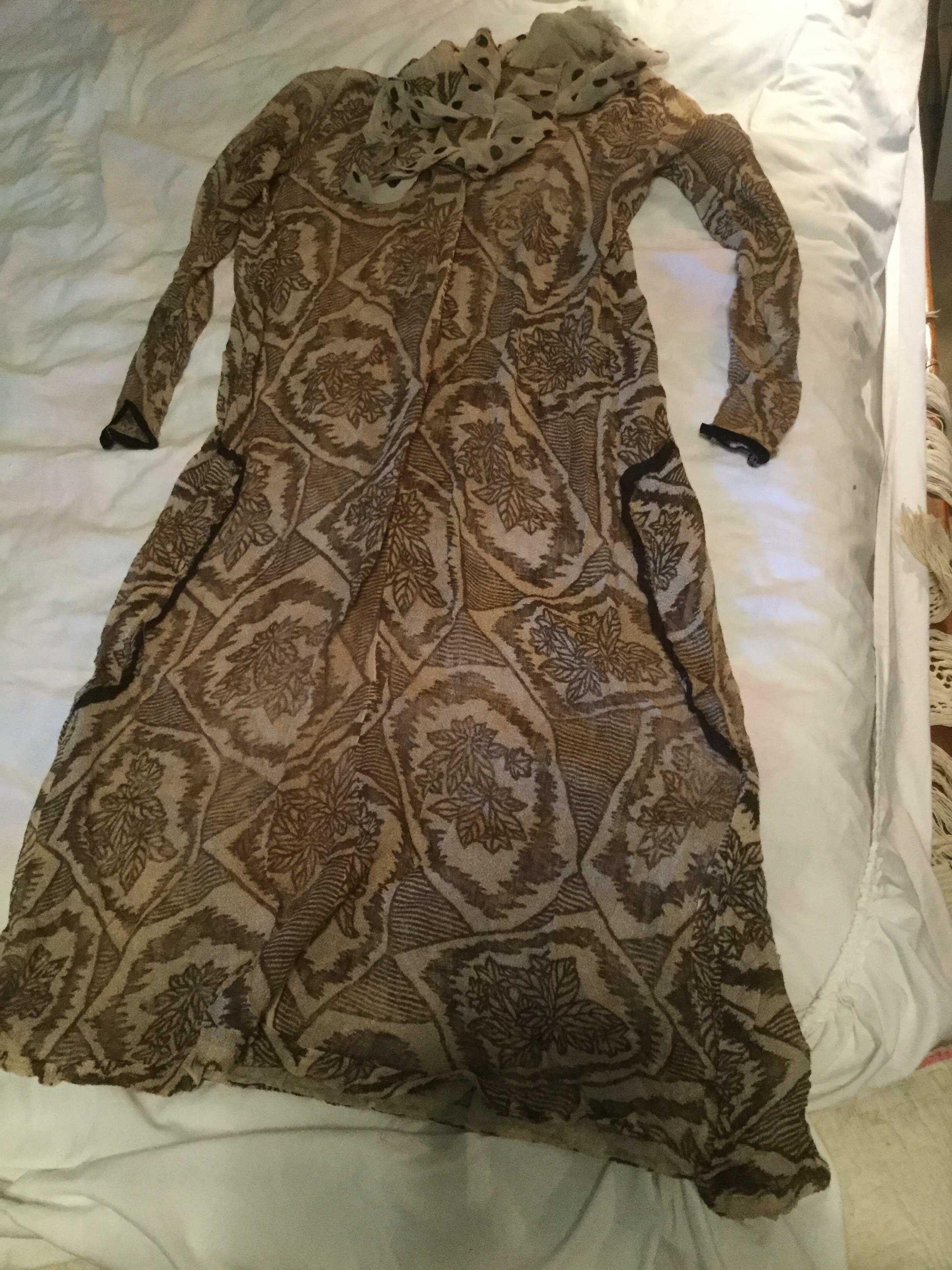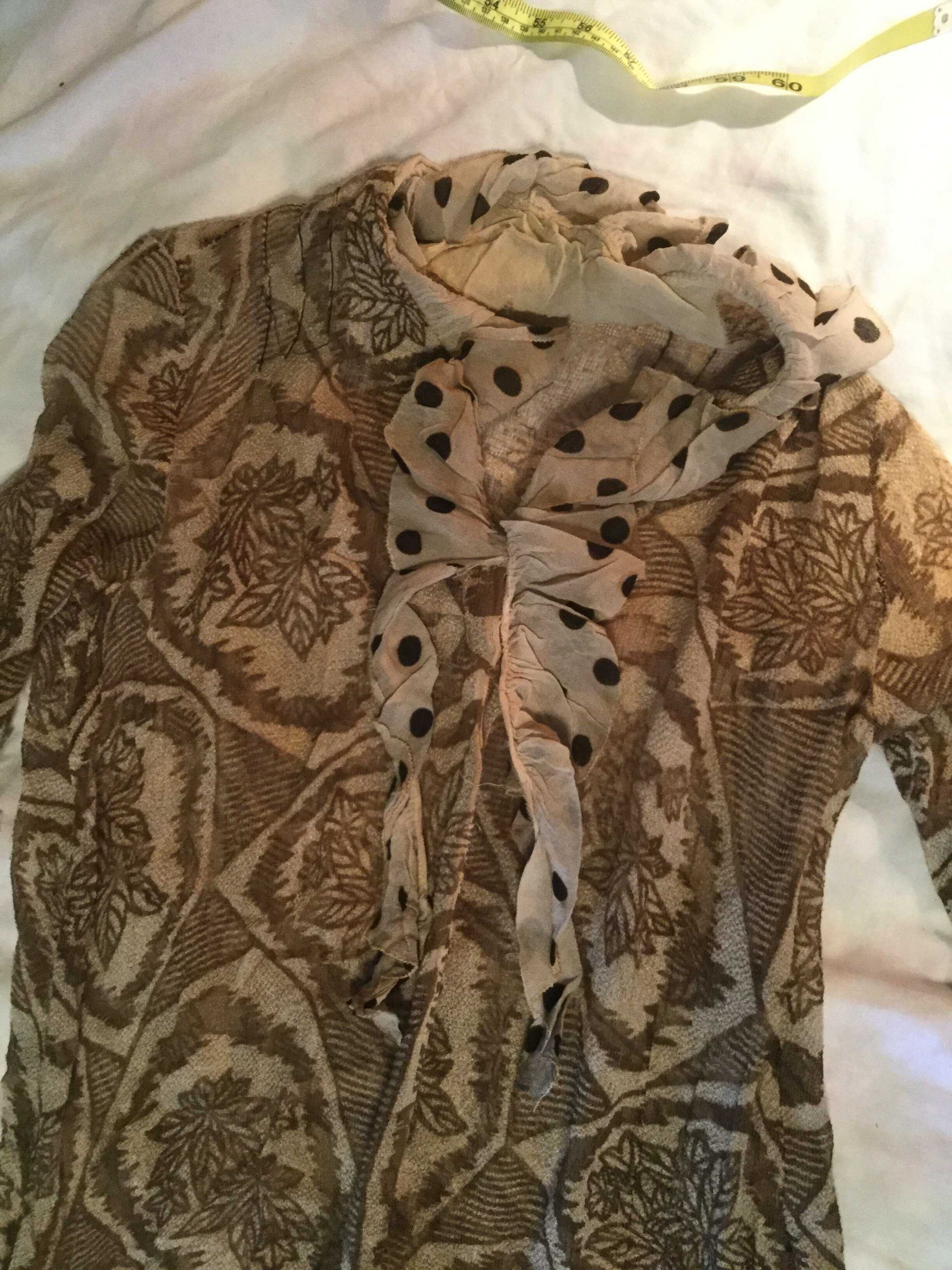 dress; chiffon (?) silk (?), beige background with floral/leaf/patchwork print, varying texture (some parts more open weave); long sleeves, cuffs finished with black silk binding; brown chiffon binding used as décor at hip side seam; 1920s, there were pins holding in the flare on either side (we removed) up to brown trim; collar is cream silk (?) ruffle with brown polka dots; tucks on either side of neck sewn with dark thread that shows through;Collection