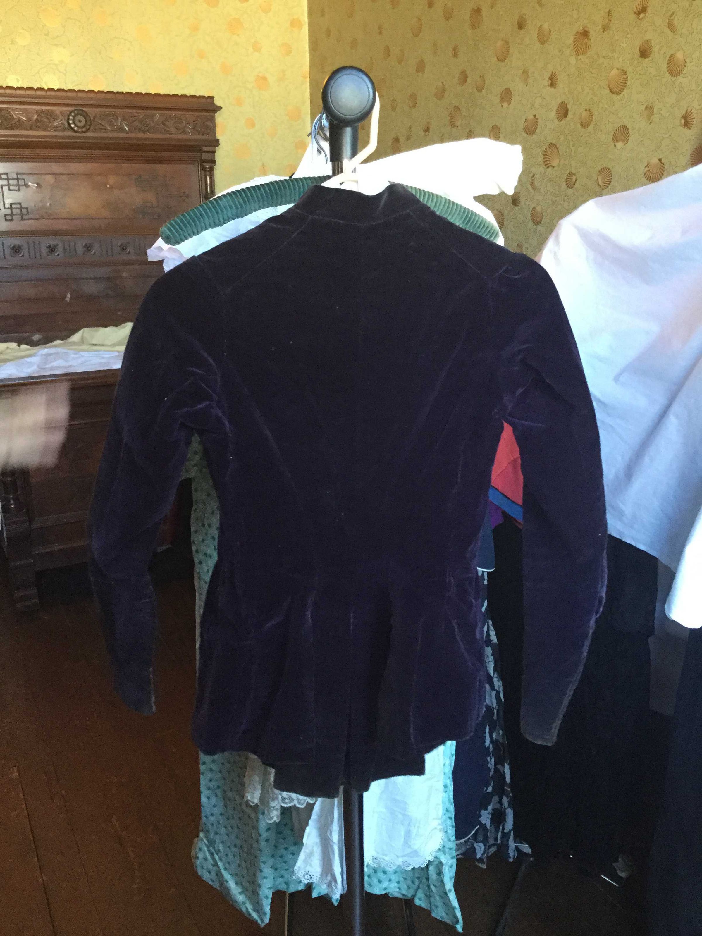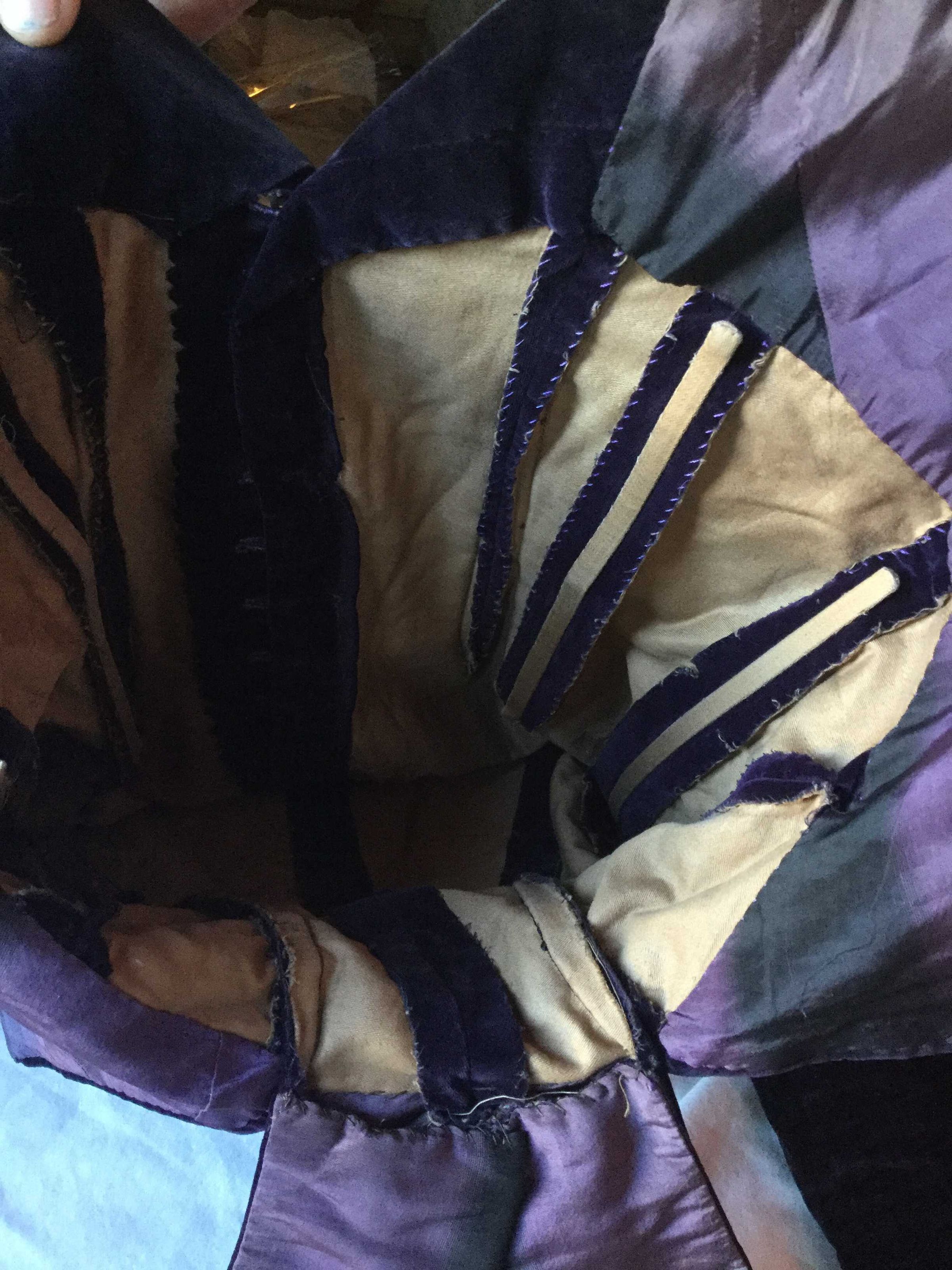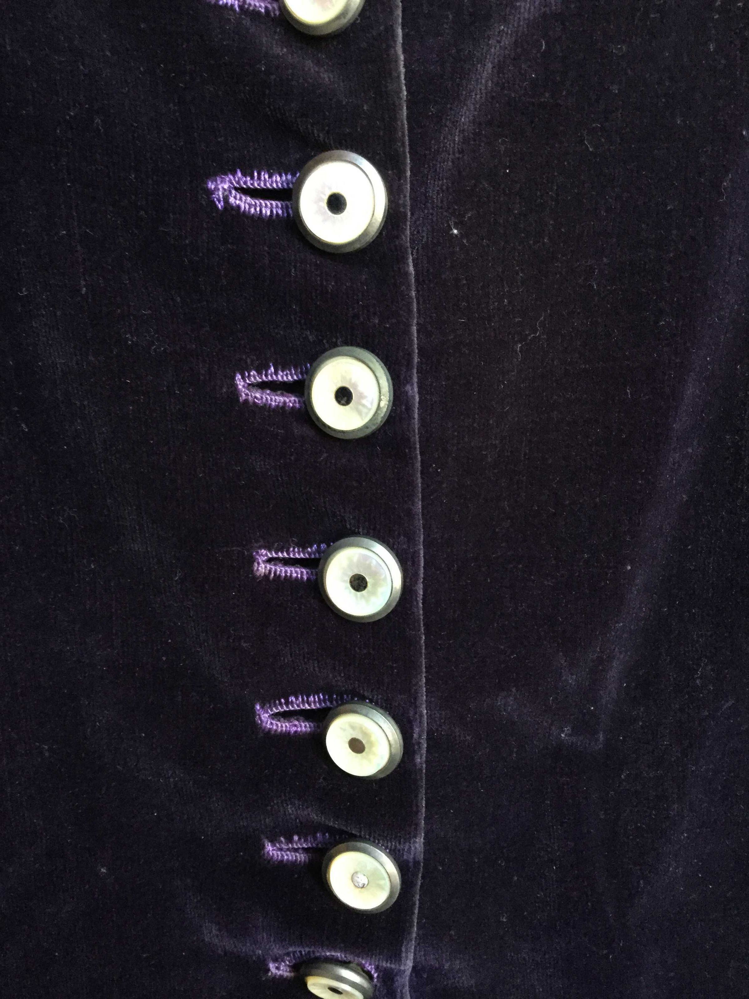purple velvet jacket, flat lined, lining sewn into seams cotton velvet. boning in sides, mother of pearl and metal button