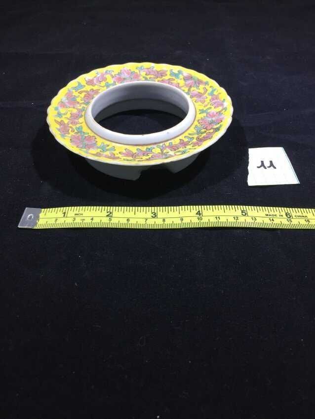 White base, pink and blue flowers on a yellow background, 3 copper crosshatching designs on base (unknown use- soup bowl fits on top )