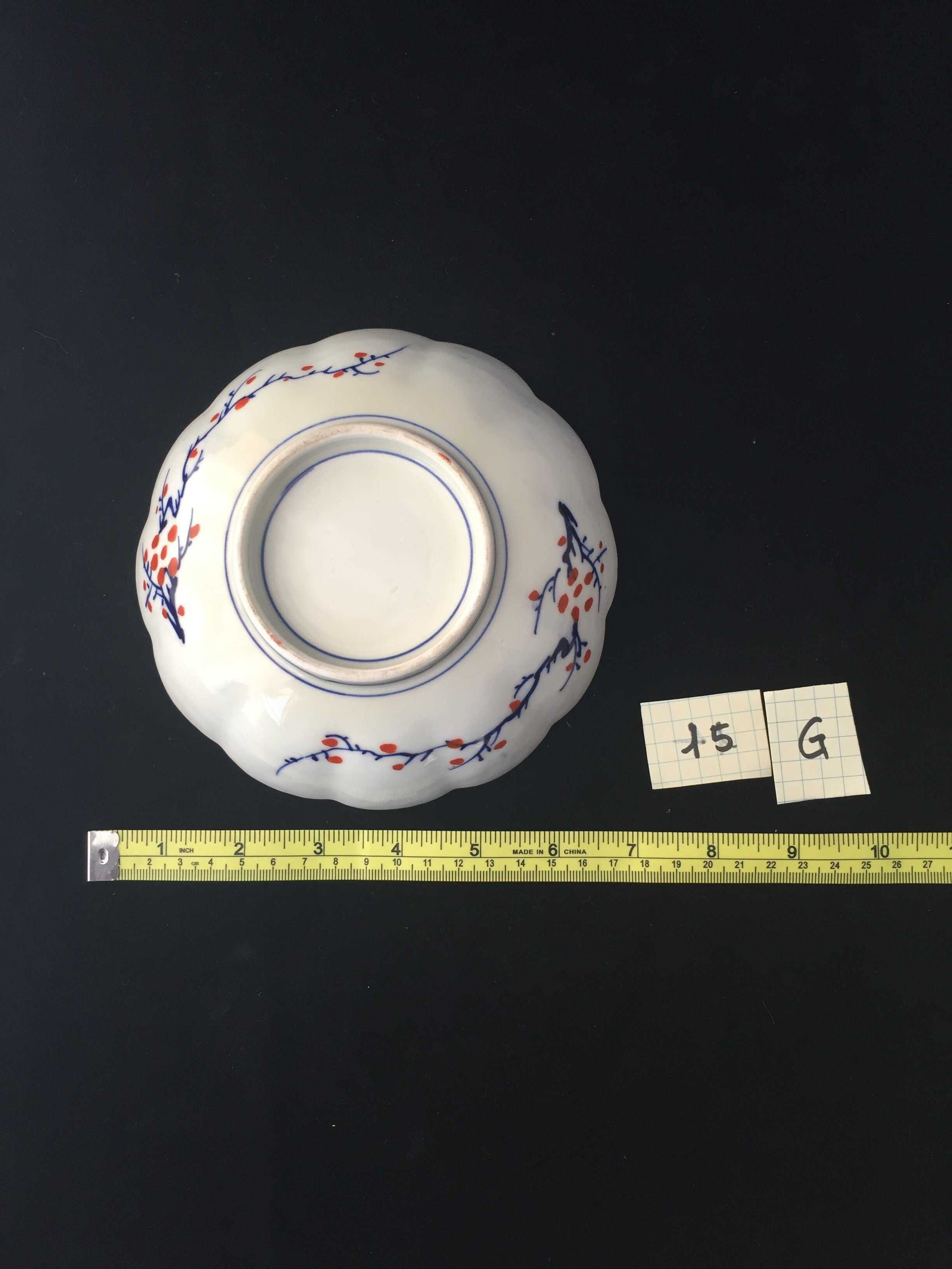 Blue, green and red floral design on face, blue and red floral design on base, scalloped rim, stoneware
