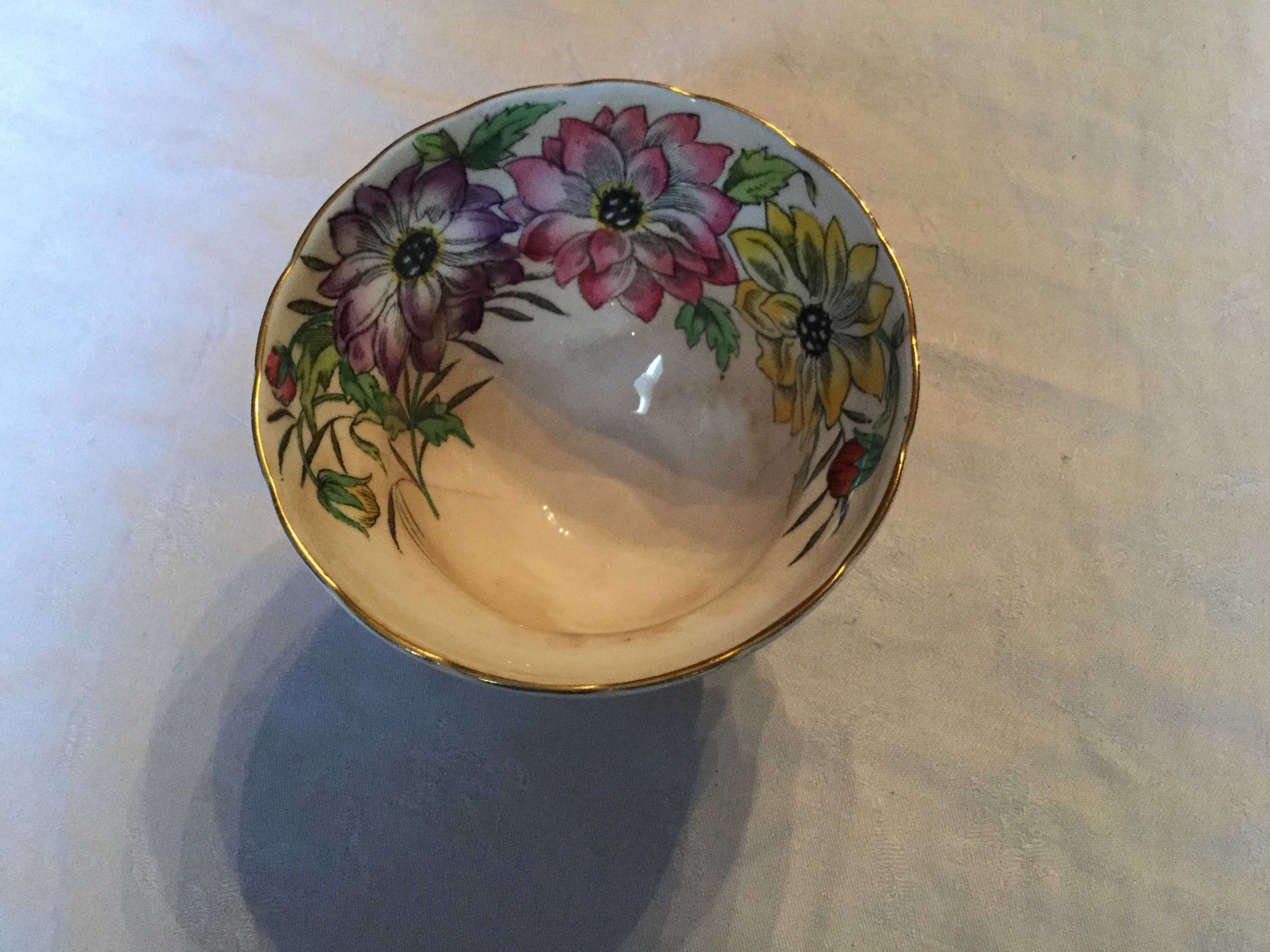 White base with pink, green, purple and yellow floral design on inside and a thatched cottage on outside, scalloped gilded edge, two gilded circles on base, base with twoCollection