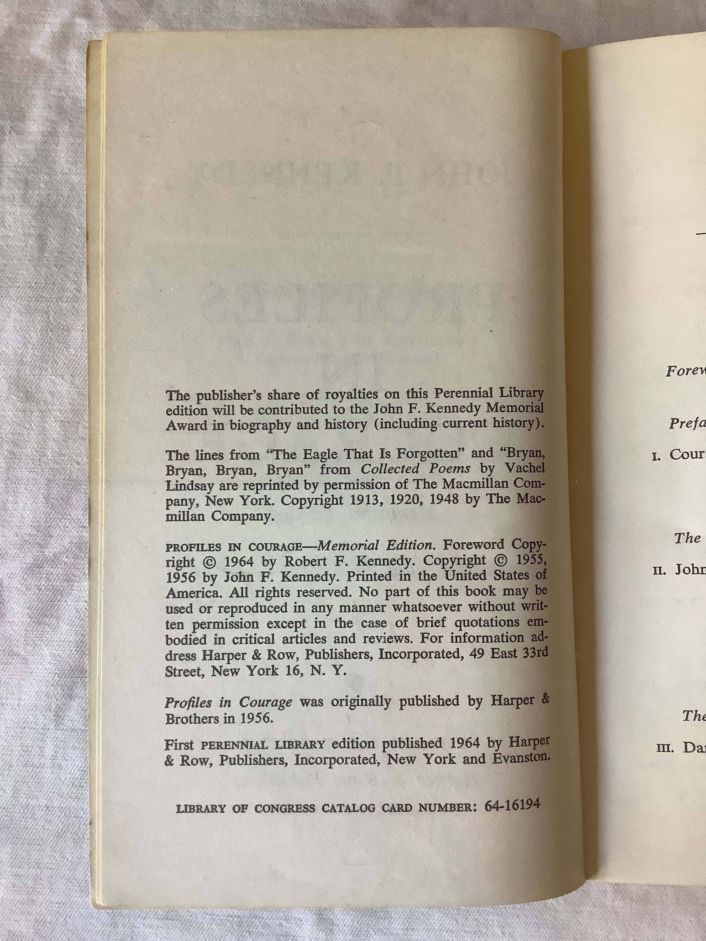 Profiles in Courage is a volume of short biographies describing acts of bravery and integrity by eight United States senators. The book profiles senators who defied the opinions of their party and constituents to do what they felt was right and suffered severe criticism and losses in popularity as a result. --Wikipedia. This is a memorial edition after JFK assassination.Create Date