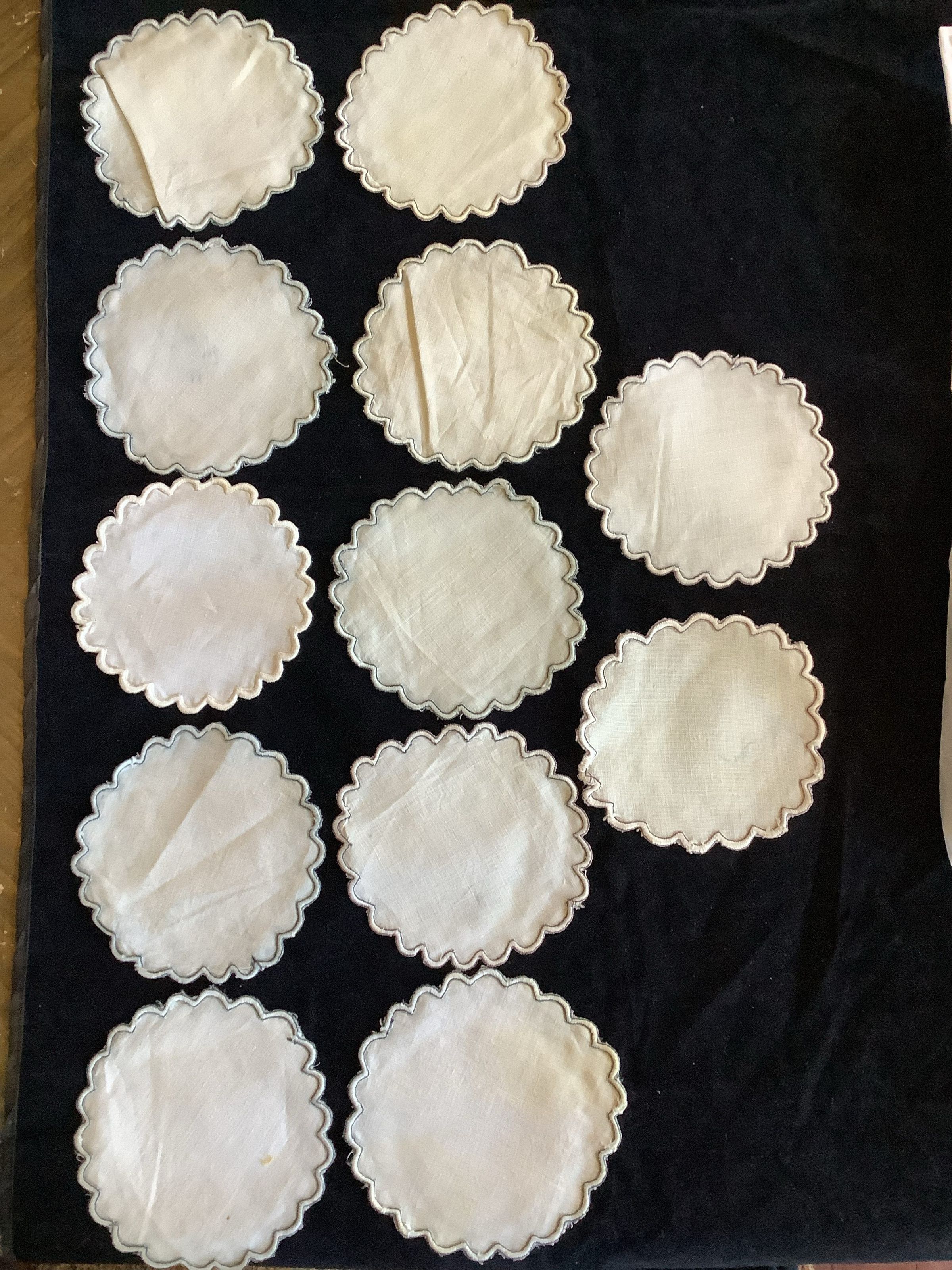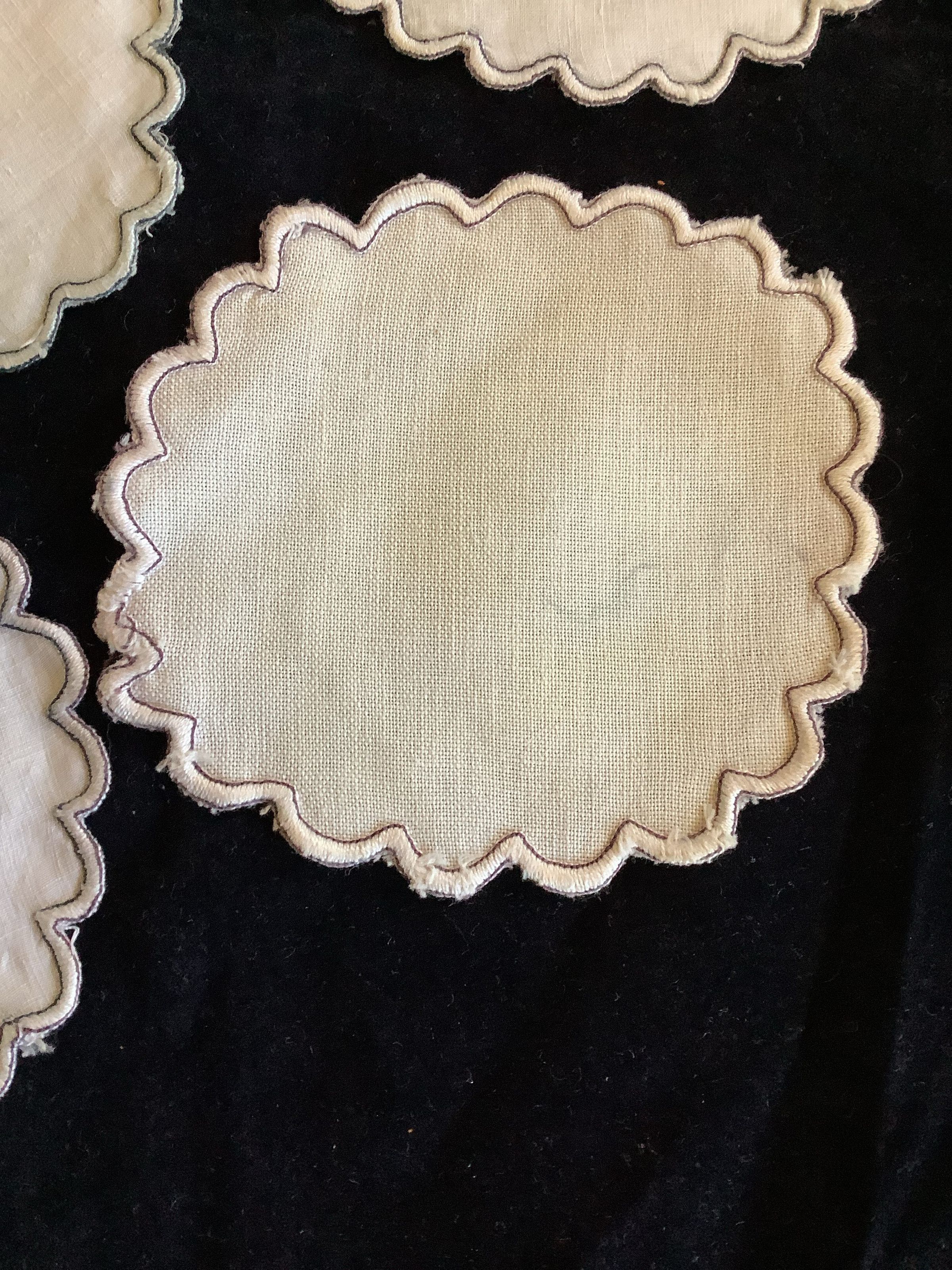 These are 12 small cotton rounds with an embroidered rim.