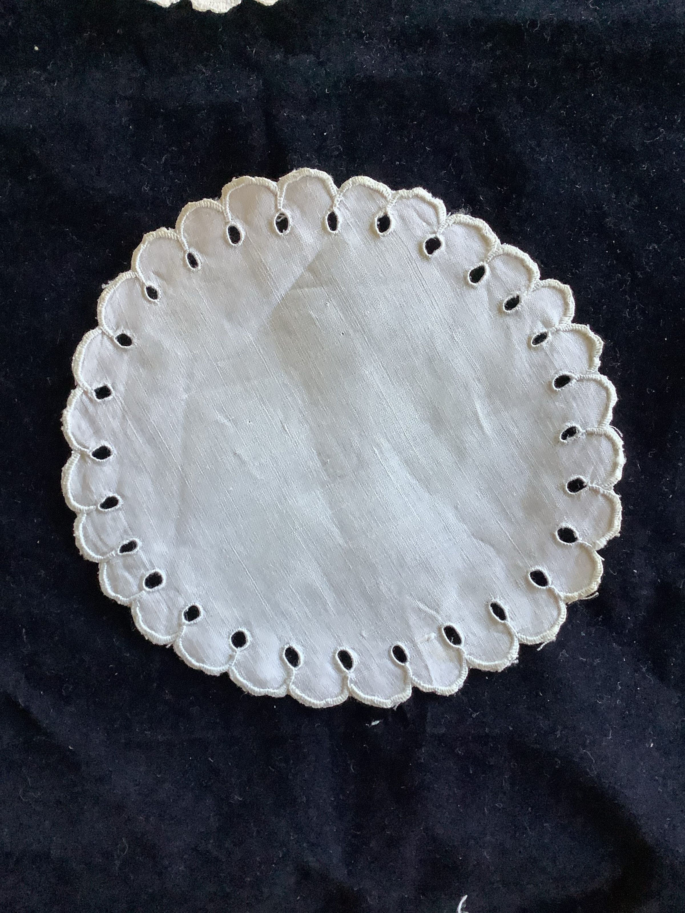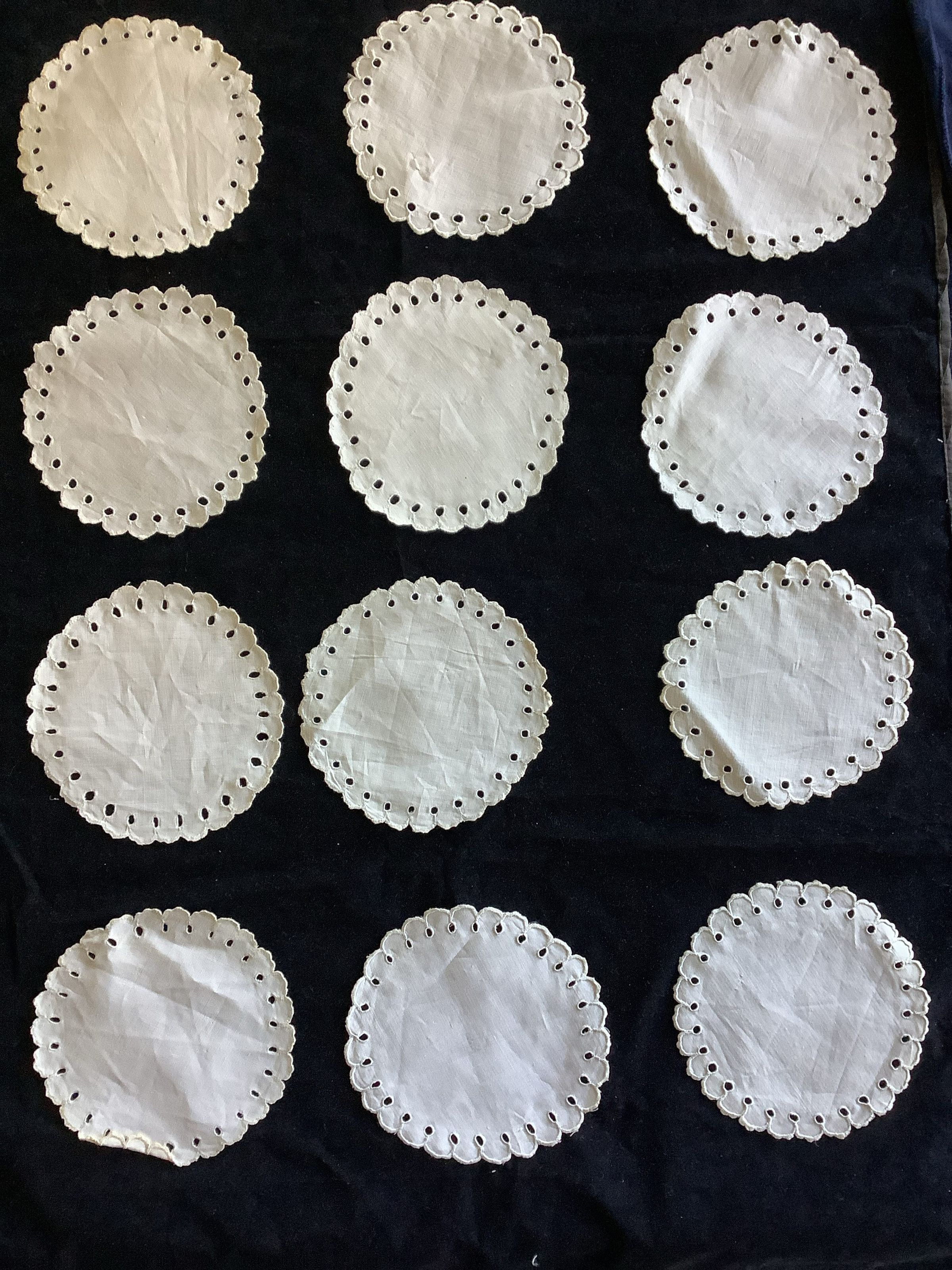 These are 12 small cotton doilies, with drawn hole designs and scalloped edges. They were connected with 3 price tags and had a store tag along with it. Made in PortugalCreate Date