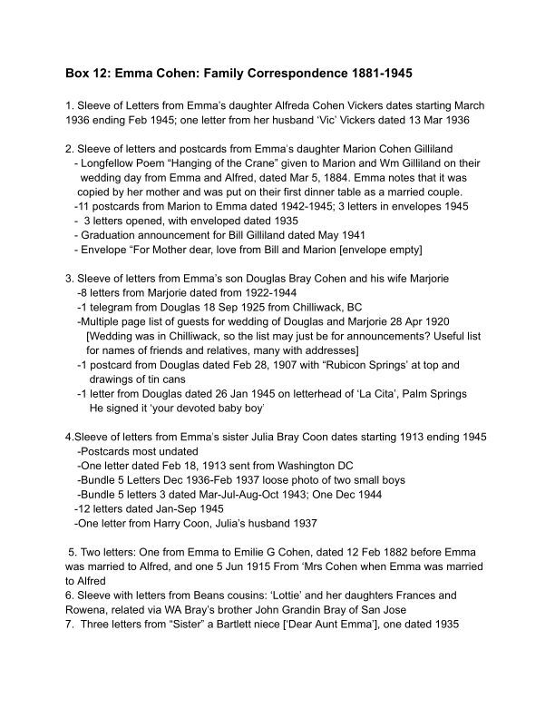 12. Emma Bray Cohen: Family Correspondence 1882-1945Scope and Content