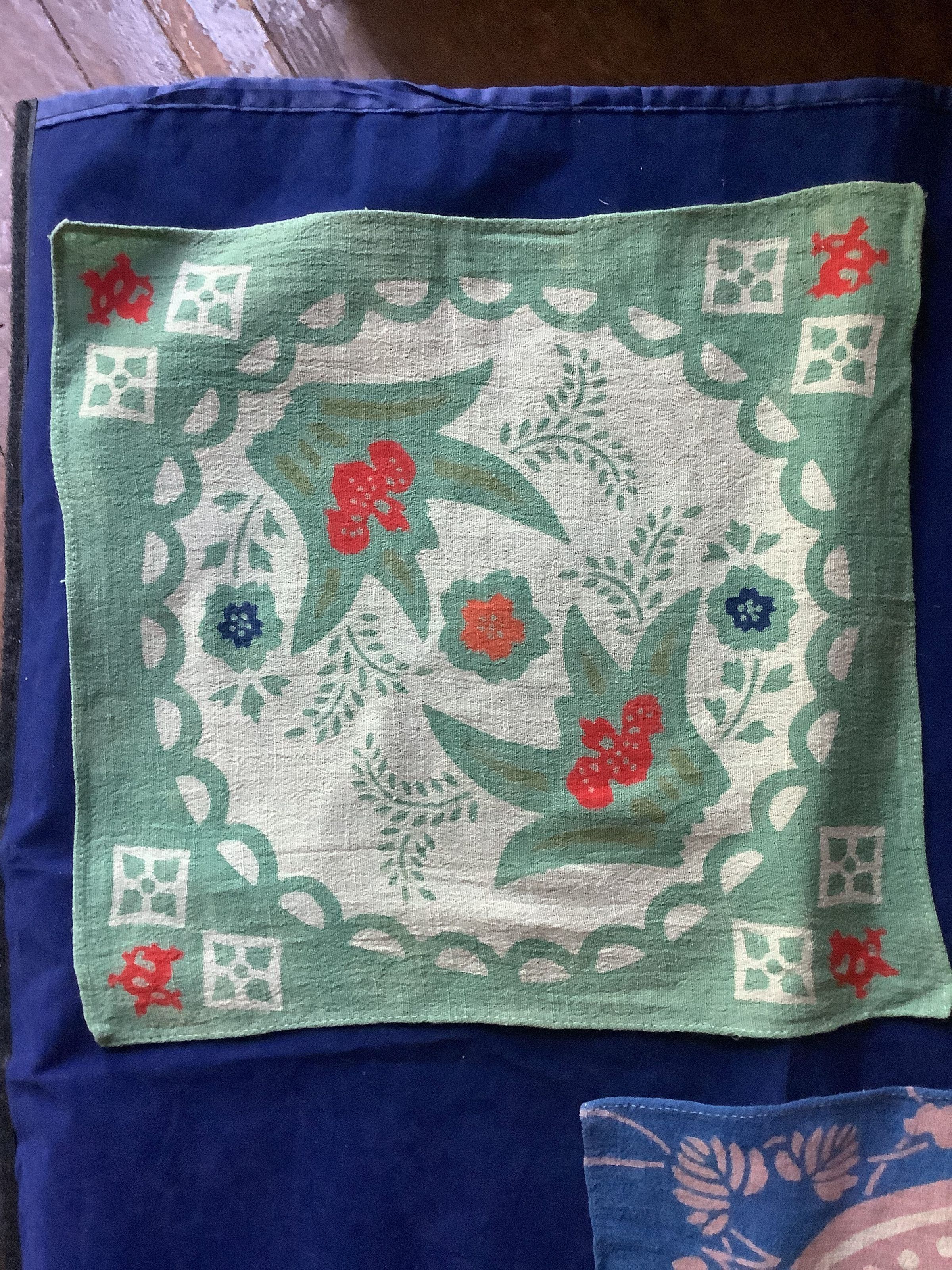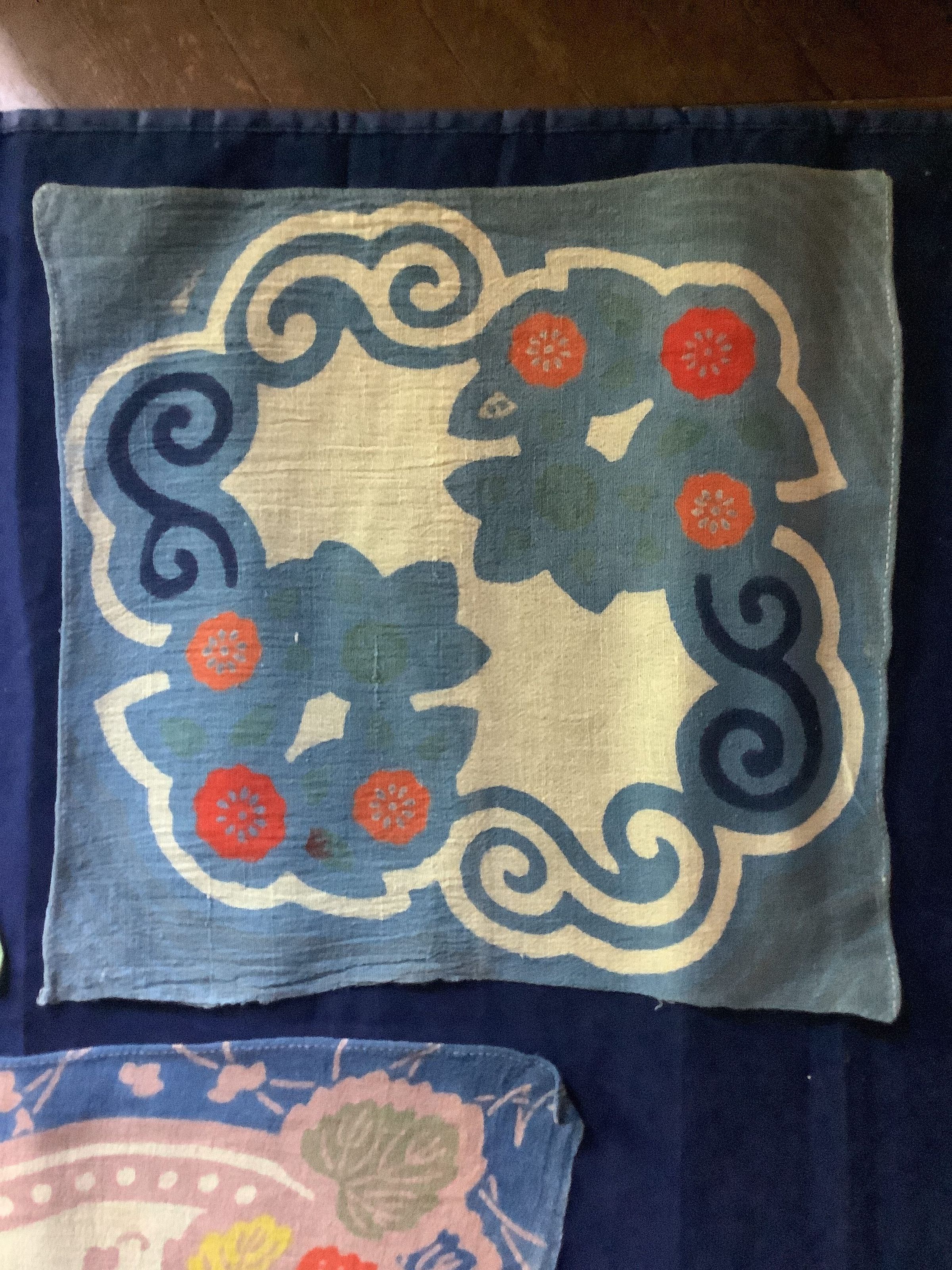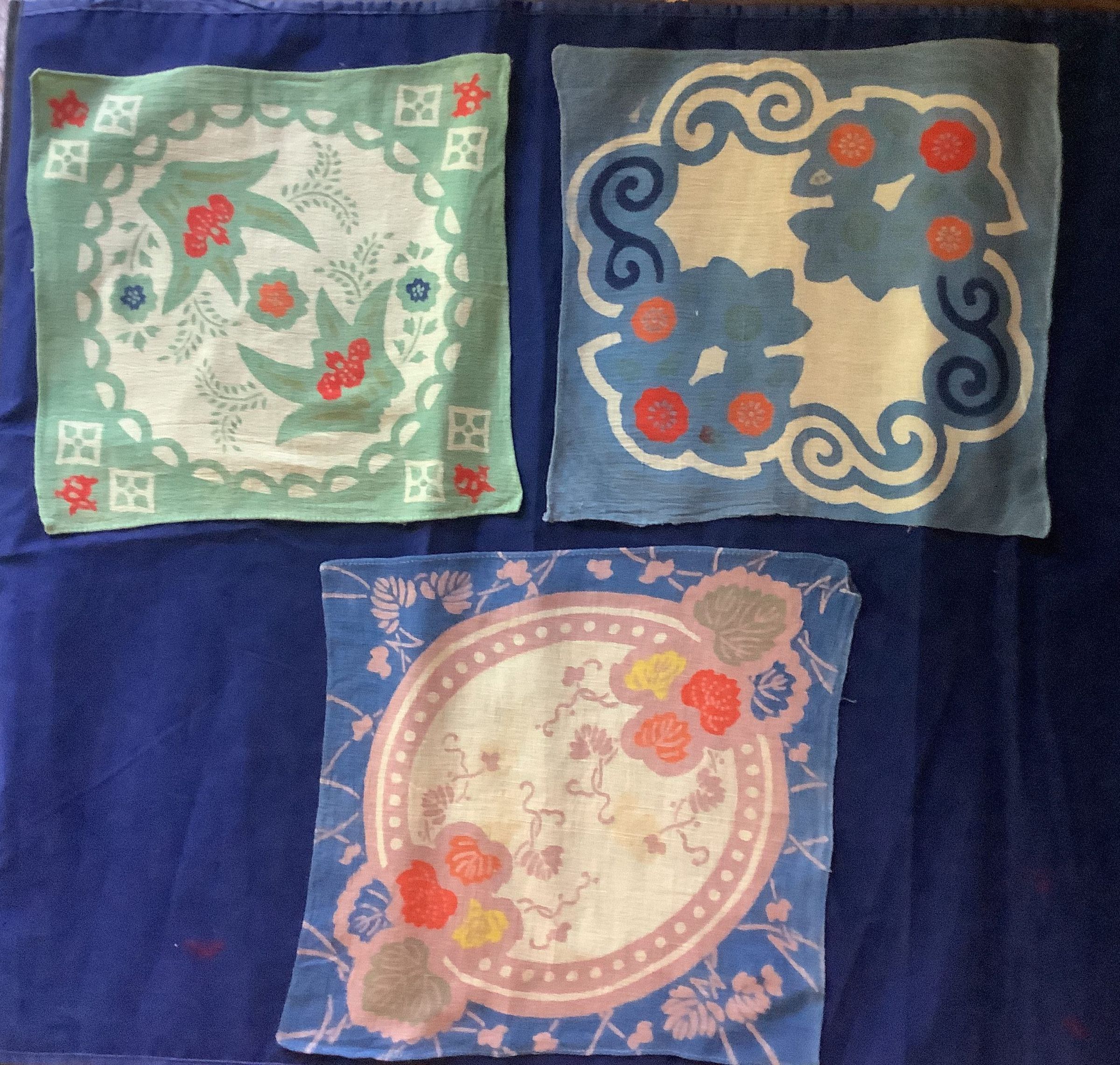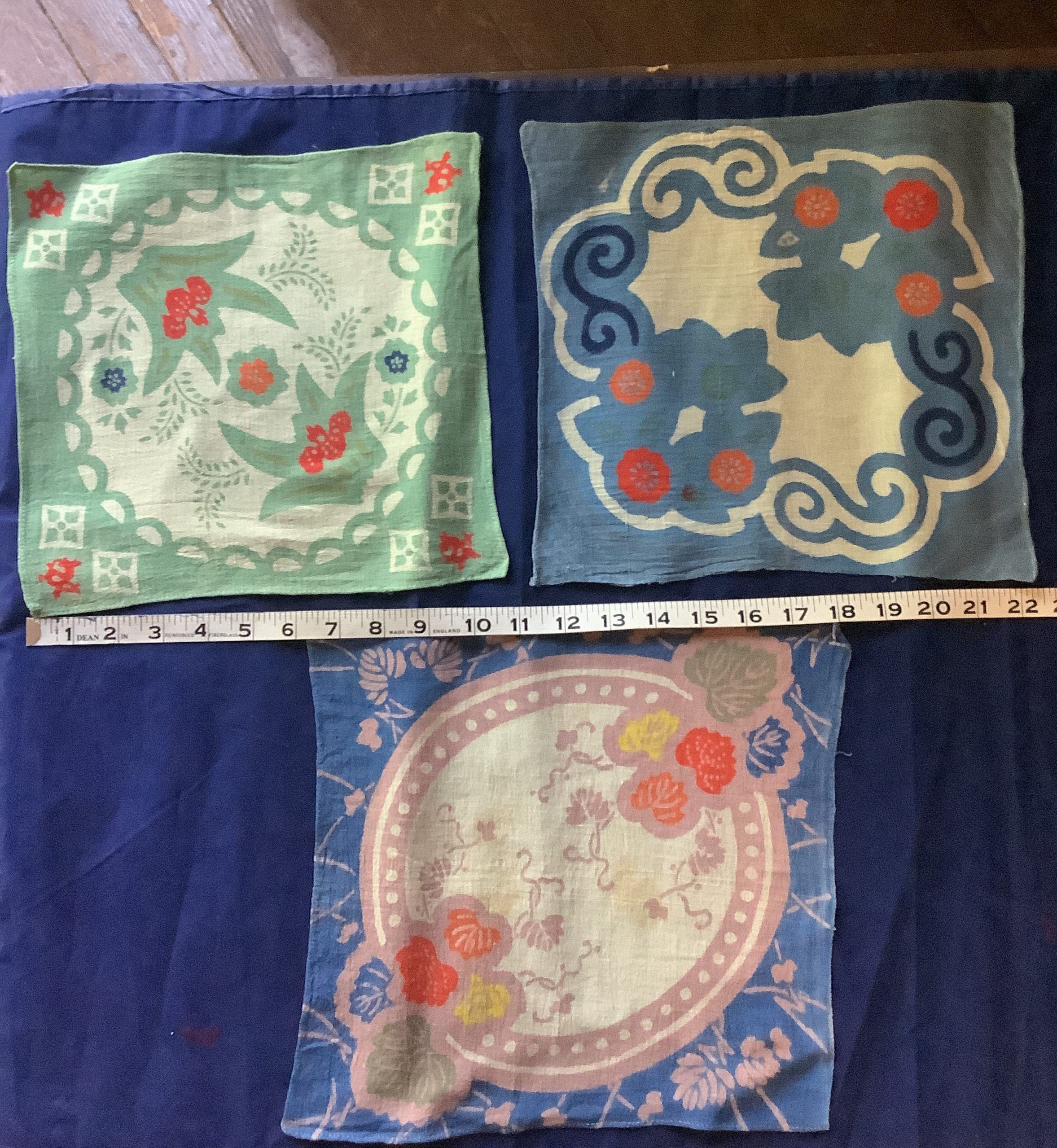These are three fine decorative printed textiles. Made with a fine/thin fabric. Each has a colorful and unique design.