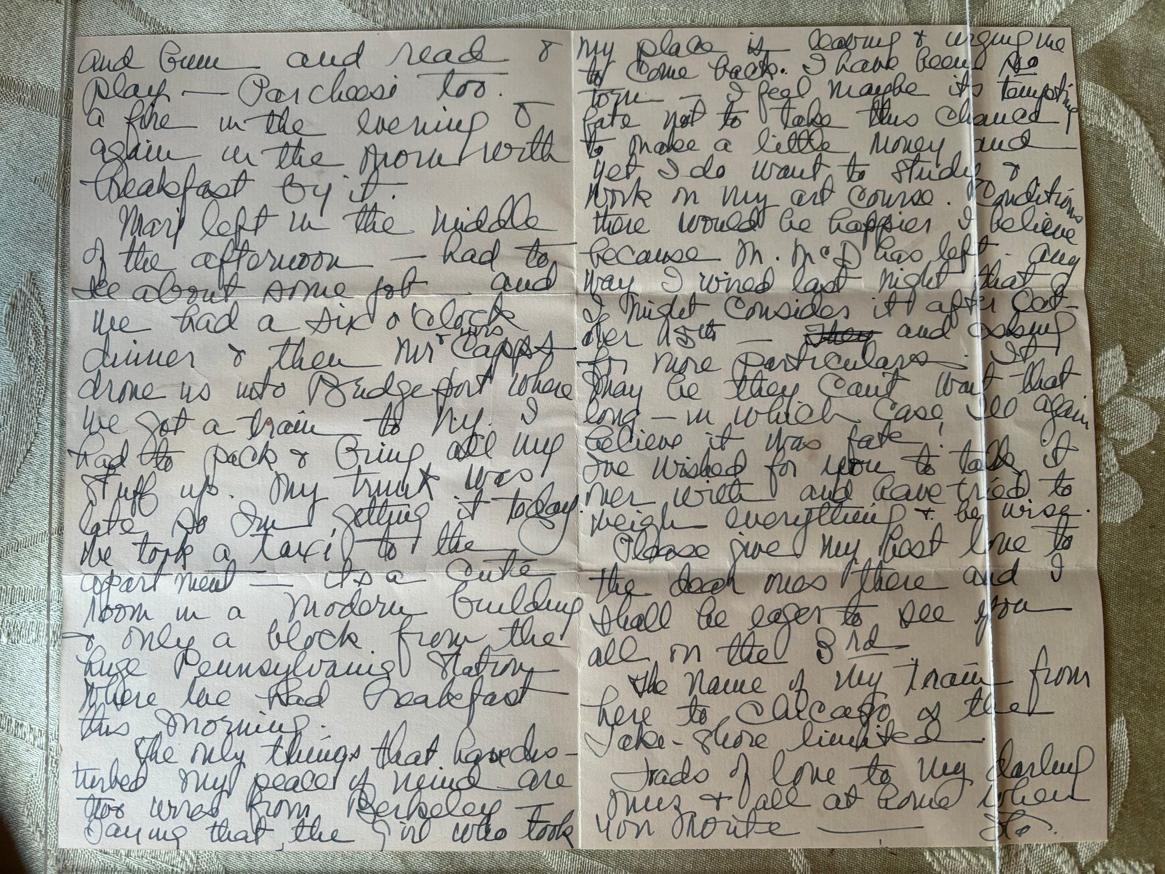 Emelita is writing from Columbia University to Emma in this letter. She describes her week as being "the perfect week," and writes about the adventures she had with Cappy. She also tells Emma the train she is taking back home is called "The Jake."Create Date