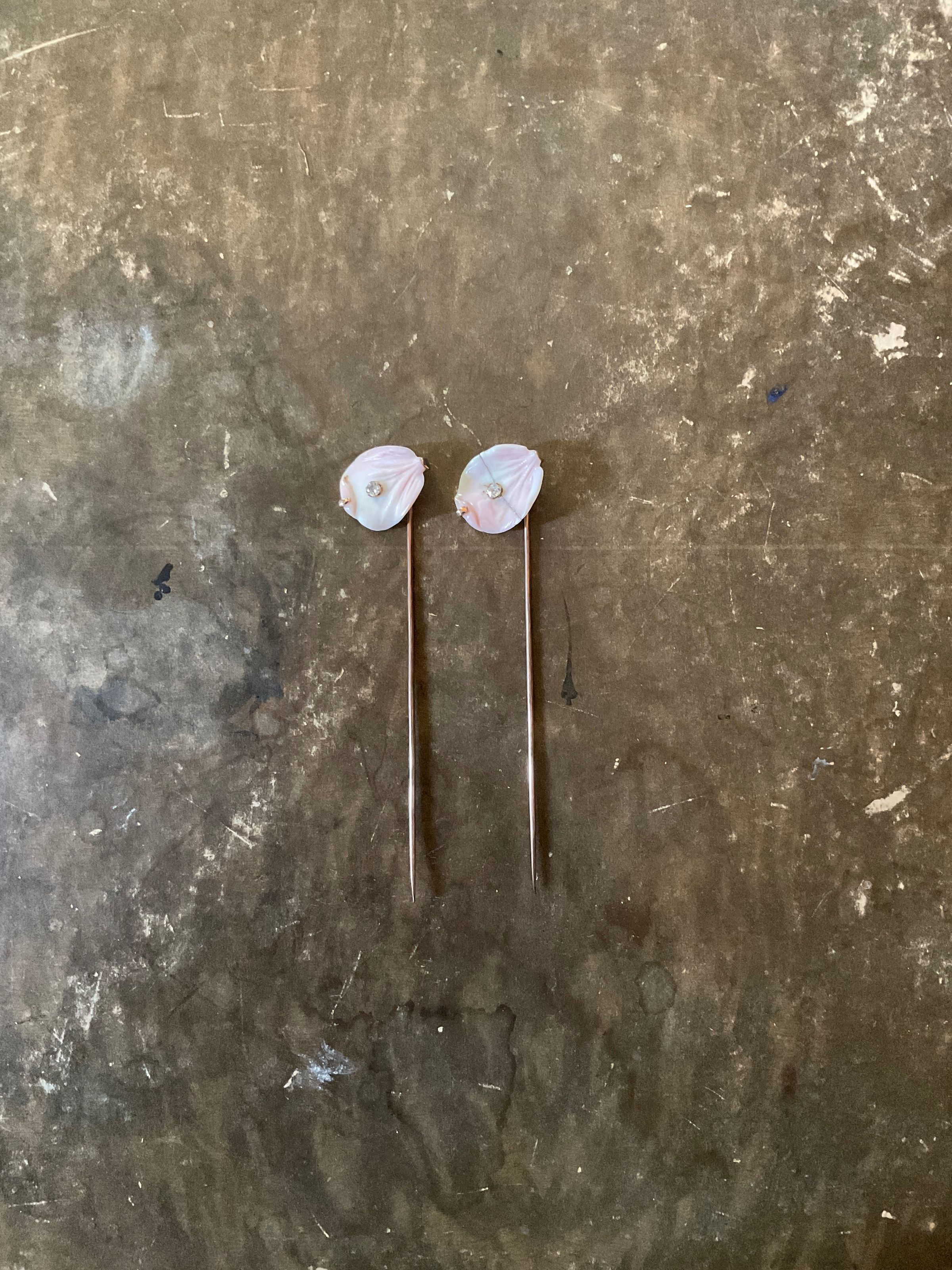A pair of porcelain/ceramic hair pins in the shape of a flower petal. The petals are white and pink with a diamond-like jewel in the middle. Each has one long, metal pin attached.Collection