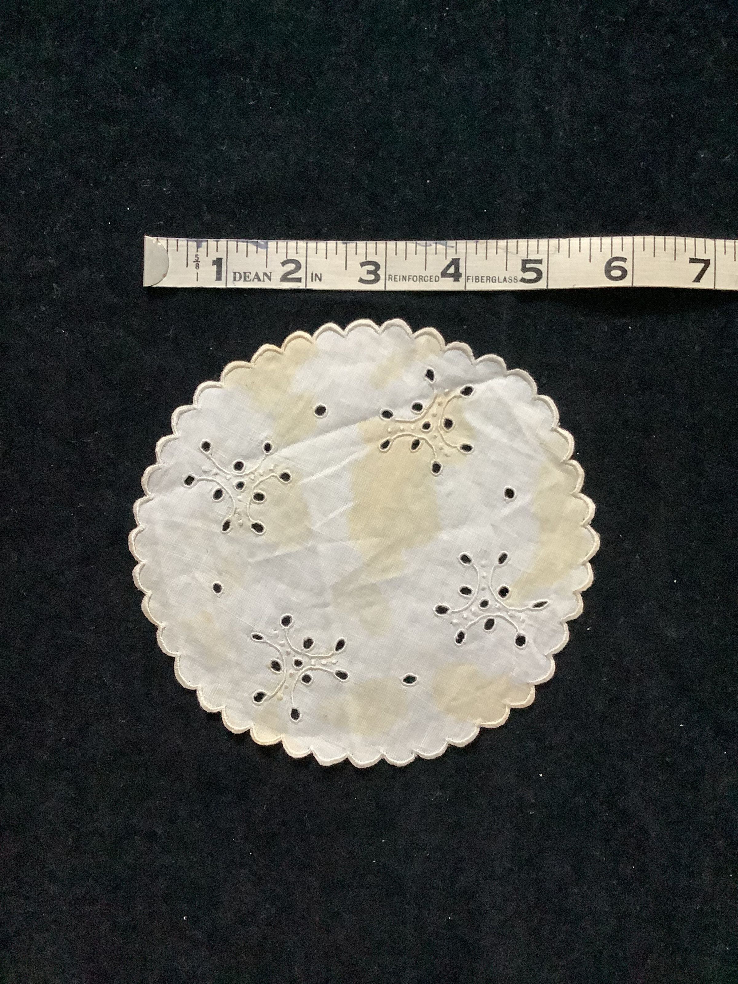 This a small circular cotton doily with embroidered designs and drawn holes.