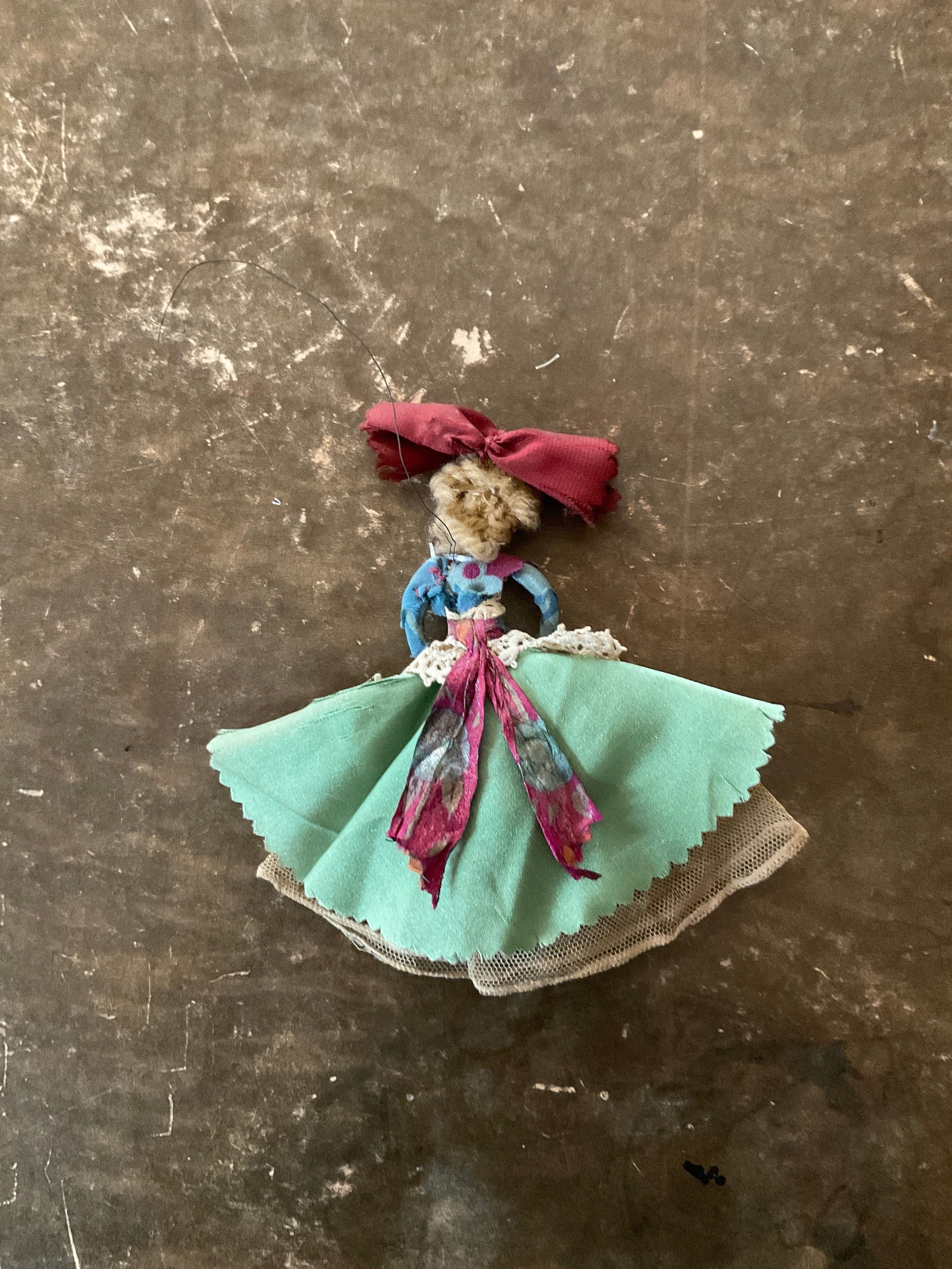 Doll made out of pipe cleaners and fabric. There is a string attached to the head, making it seem like it was meant to be an ornament or hanging decoration. The doll has blonde hair, a big red ribbon on her head, a greed dress and lace embroidery.Collection